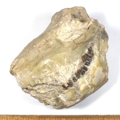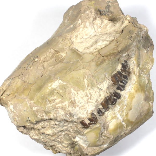 The Oreodonta is an extinct suborder of mammal in Order Artiodactyla, and therefore distantly related to pigs, hogs, camels, hippopotamuses, and the pig-like peccaries. Over 50 species of Oreodonta have been described. They first appeared some 50 million years ago during the warm Eocene and were widely prevalent during the Oligocene in the grasslands, prairies or savannas of what is now the North American badlands. Today, fossil jaws and teeth of the Oreodonta are commonly found in the White River badlands in South Dakota, Nebraska, and Wyoming. Oreodonts are Artiodactyls, even toed ungulates, sometimes called a cross between a pig and a sheep. Note that they have both large canine front teeth, but also molars for chewing plants. They were herding animals and grazers, eating mostly grasses. They averaged three to four feet long.