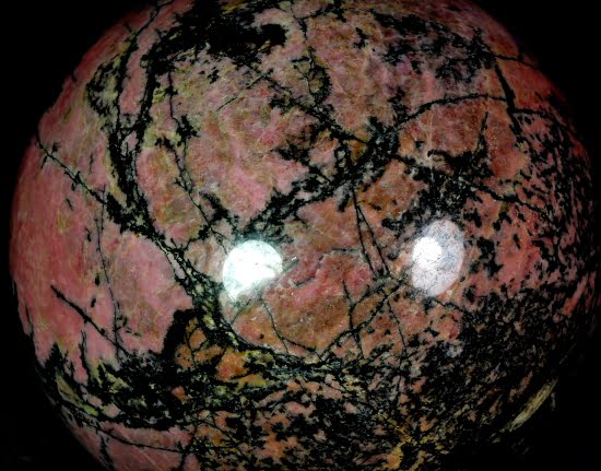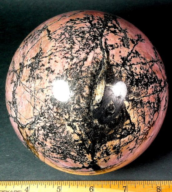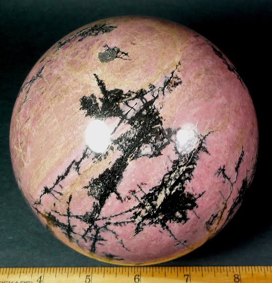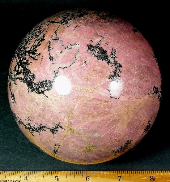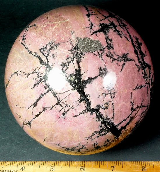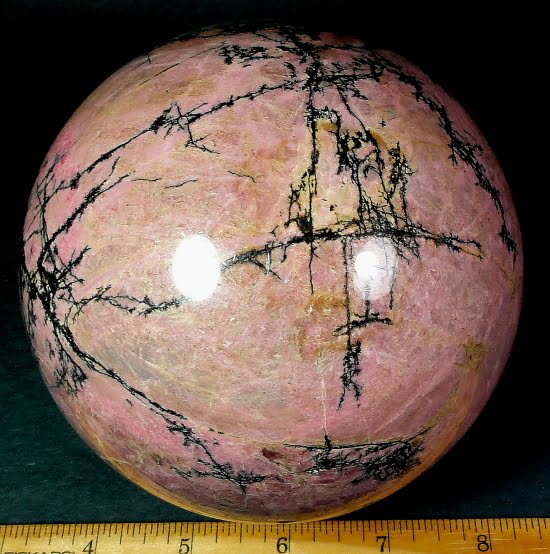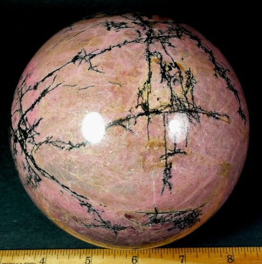 This is a very beautiful Rhodonite Sphere from Peru. It has nice Pink colors of Rhodonite with the contrasting Black Manganese minerals dispersed throughout. This larger sphere is 4 5/8″ in diameter and weighs over 6 1/2 pounds. A very gorgeous sphere at any price. Add it to your collection today!