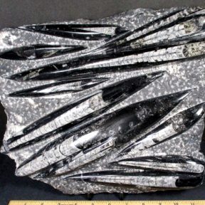 Trilobites are hard-shelled, segmented members of Arthropoda and the class Trilobita that existed throughout almost all of the Paleozoic era, flourishing in the earlier part of it and slowly declining in the later part. The most common trilobites were about 2-7 cm (1-3.5 in) in length, but over their long history they ranged in size from 1 mm-72 cm (.04 in-28 in) and exhibited so much variation that they are classified into nine (or possibly ten) orders with more than 15,000 species. The smallest species are presumed to have been part of the free-floating plankton, while the more common, mid-sized species probably walked along the sea floor filtering mud to obtain food, and the larger varieties may have been swimming predators.