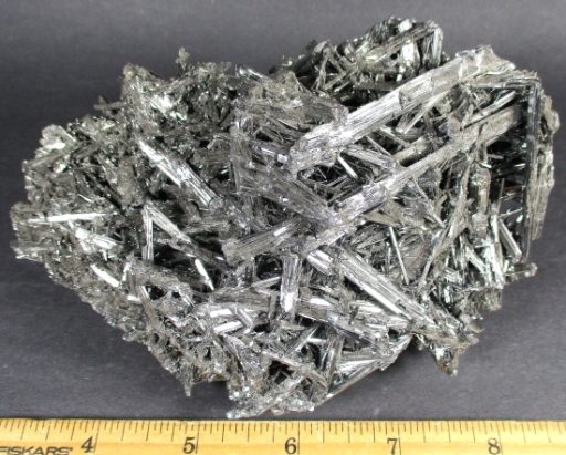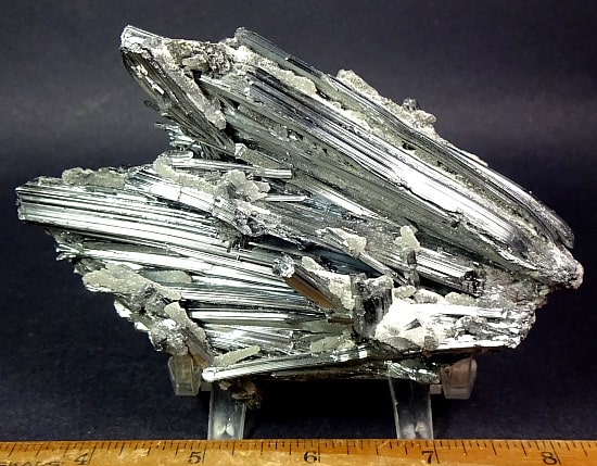 Here is a great find. This is an exceptional specimen of Stibnite from China. It has sparkly Grey metallic colored crystals going in all directions creating a mesmerizing design. The specimen measures 5 3/8″ x 3 5/8″ x 3″ and makes for an interesting display of an unusual mineral.