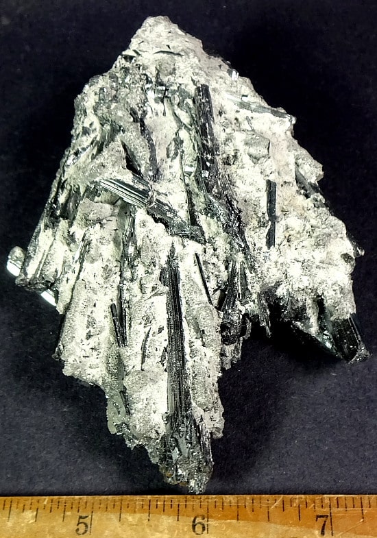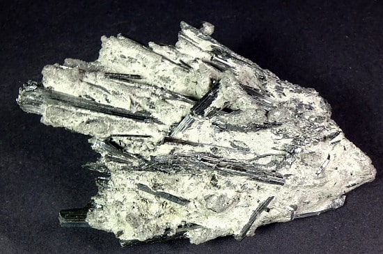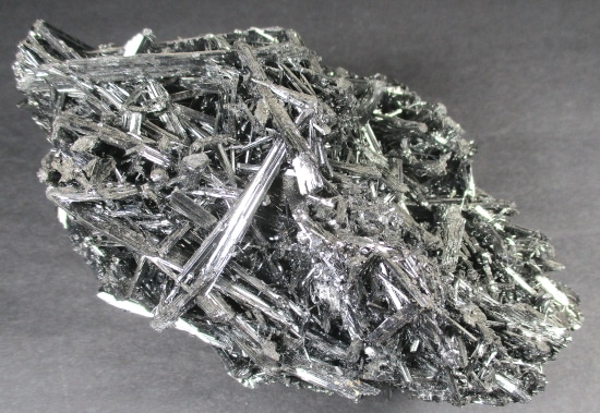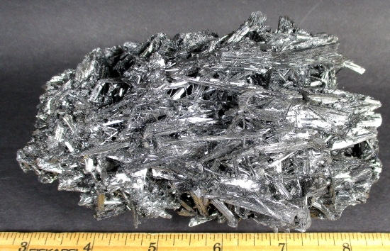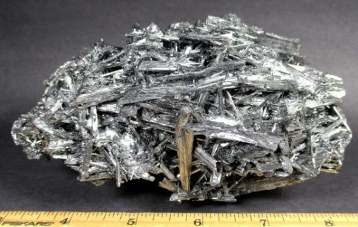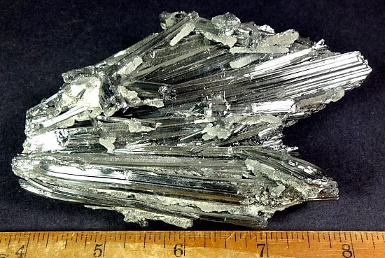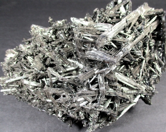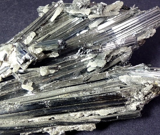 Stibnite, also known as Antimonite, is a Sulfide mineral that forms grey Crystals. It is the most important source for the rare Metalloid Antimony. It is used in the manufacture of fireworks, batteries, safety matches and mascara.