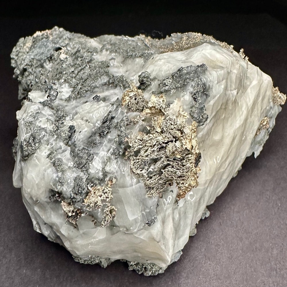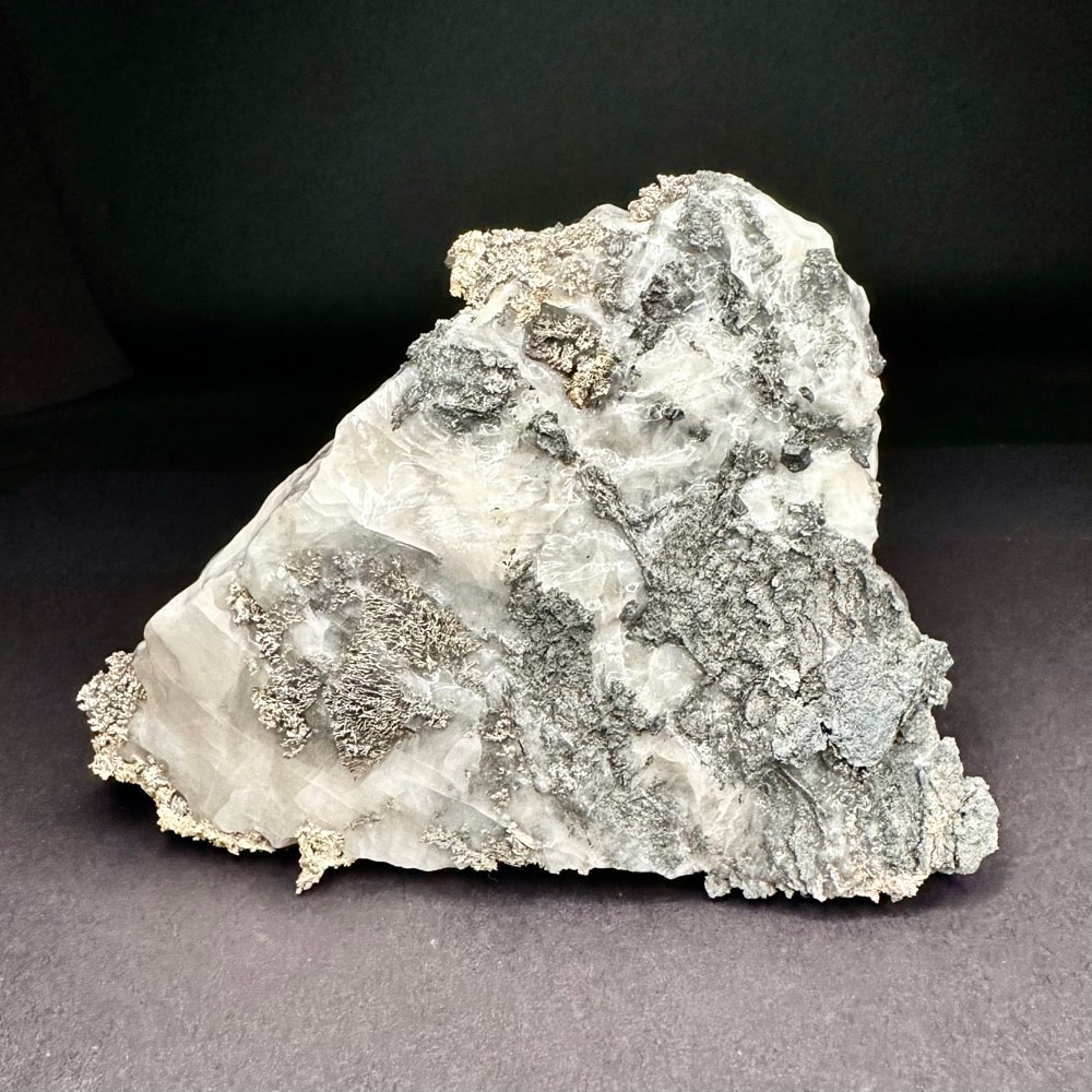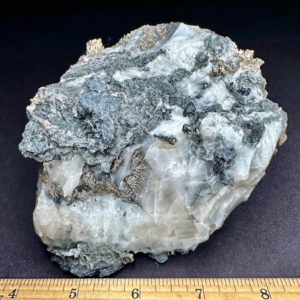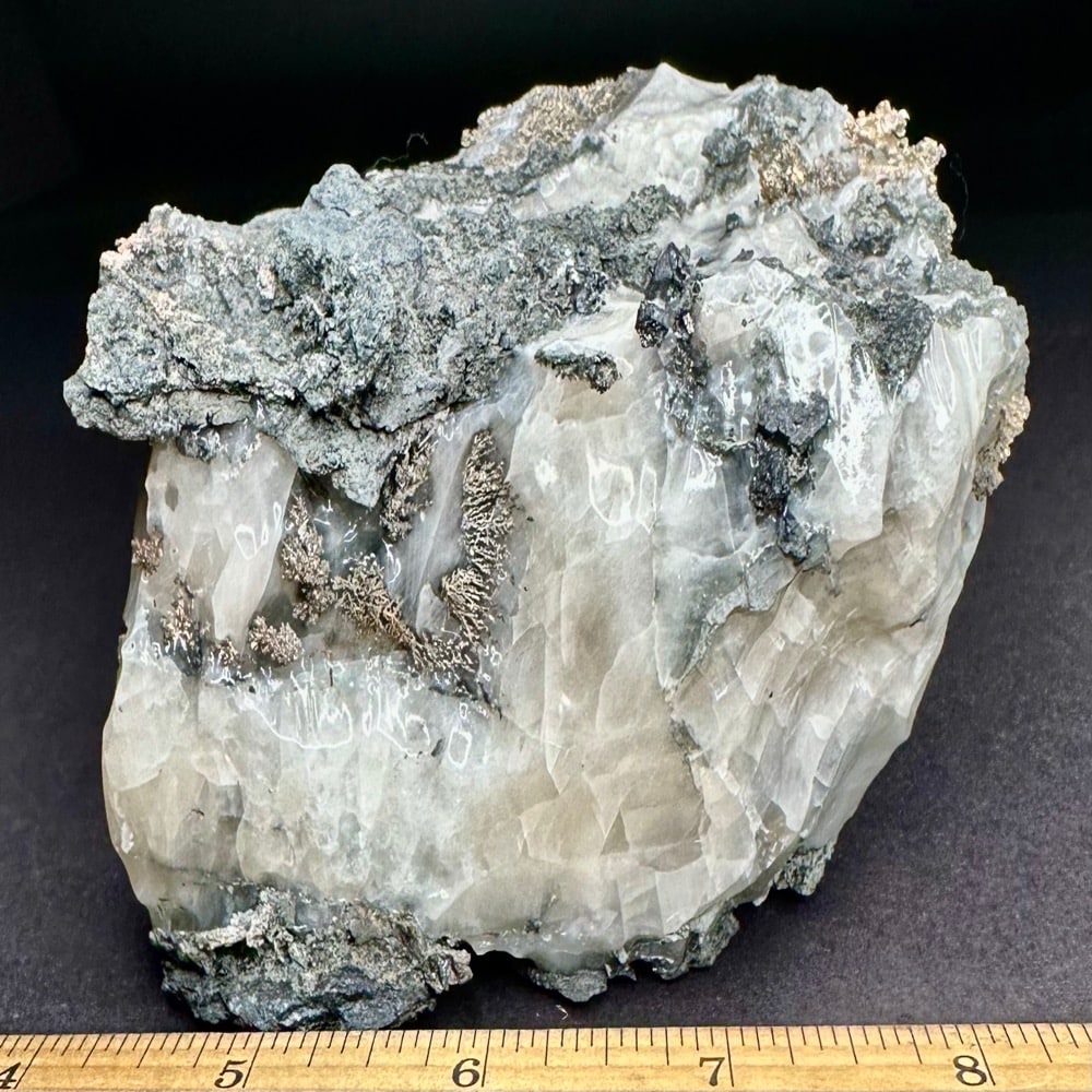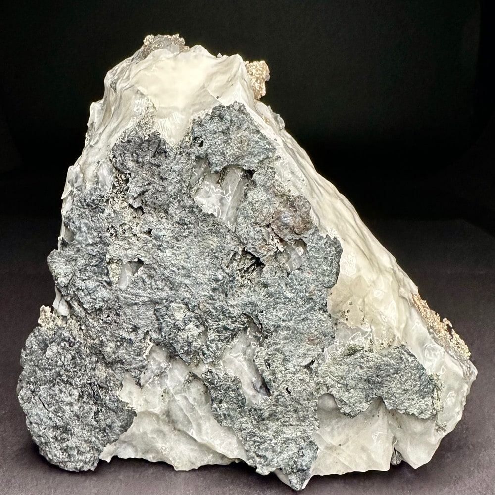 Acanthite is a common silver mineral in moderately low-temperature hydrothermal veins and in zones of supergene enrichment. It occurs in association with native silver, pyrargyrite, proustite, polybasite, stephanite, aguilarite, galena, chalcopyrite, sphalerite, calcite and quartz.
