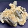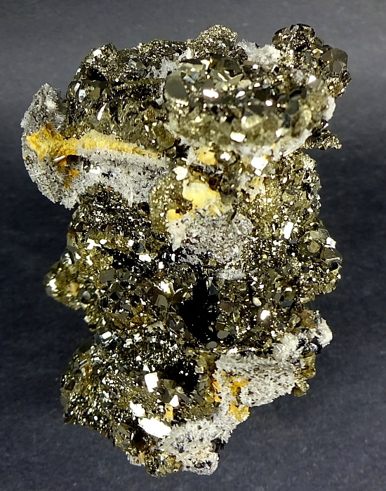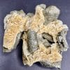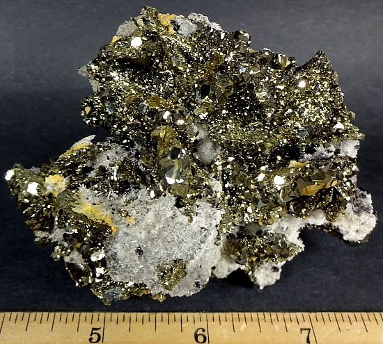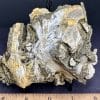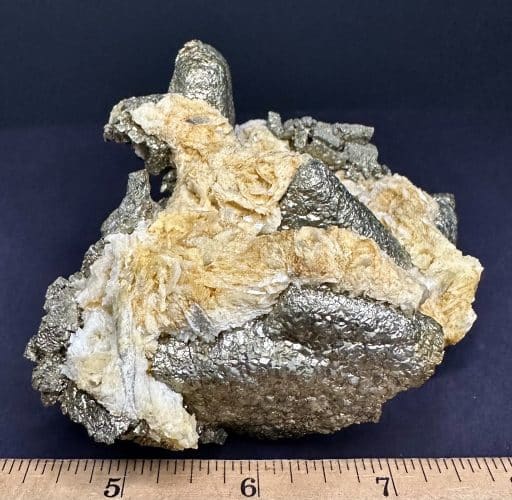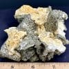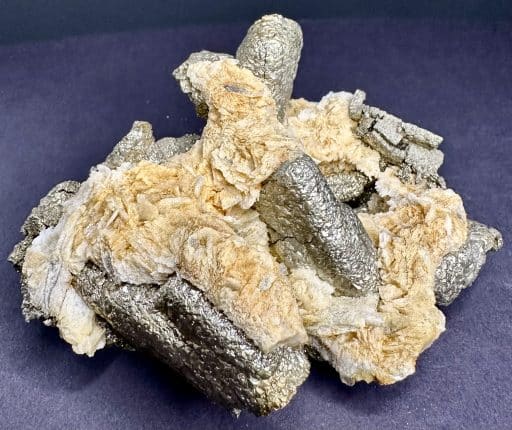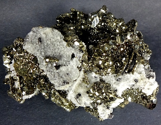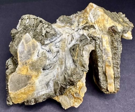 Pyrite, or Iron Pyrite, is an Iron sulfide with isometric Crystals that usually appear as cubes. It is brittle and can break or powder easily. Its metallic luster and brass yellow hue have earned it the nickname of “fool’s gold” due to many miners mistaken it for the real thing. Ironically, small quantities of actual gold are sometimes found in Pyrite. It is the most common of the sulfide minerals and is usually found with other sulfides or oxides in Quartz veins, sedimentary or metamorphic rocks.