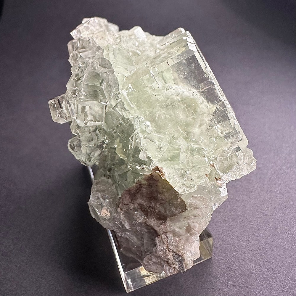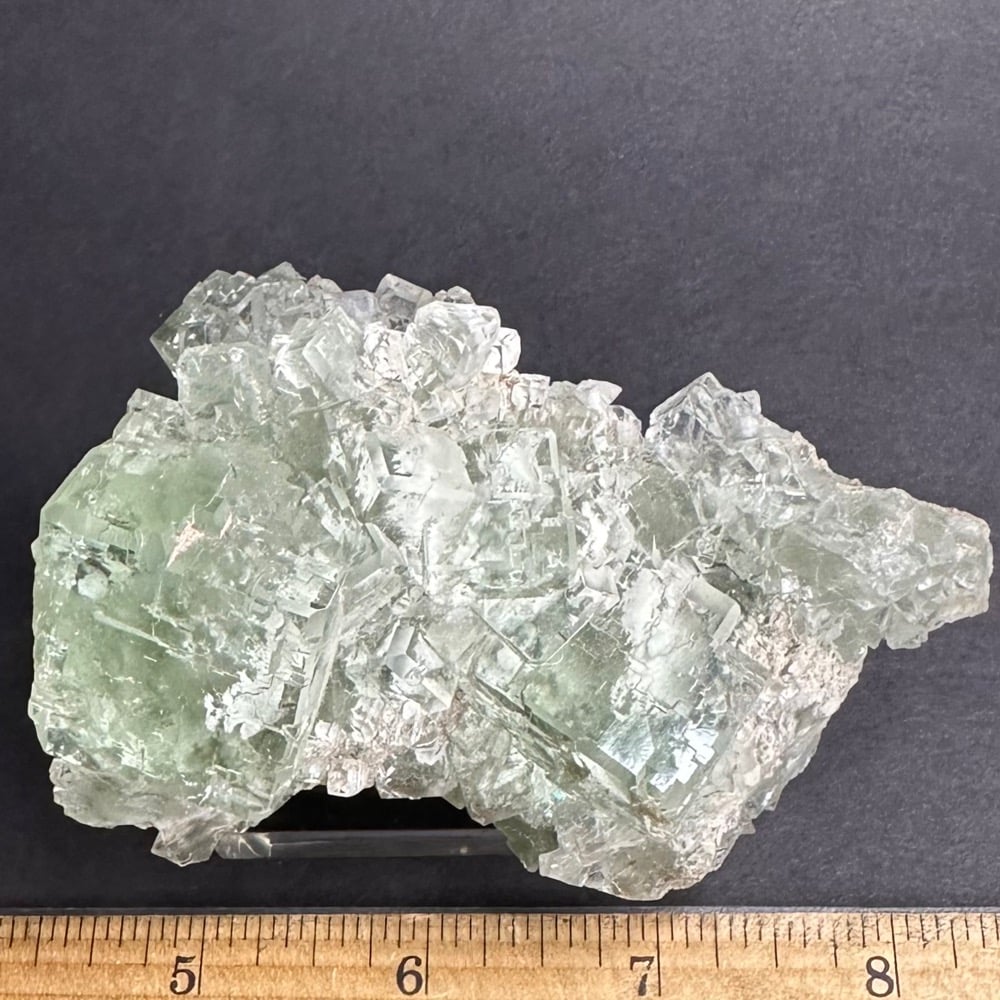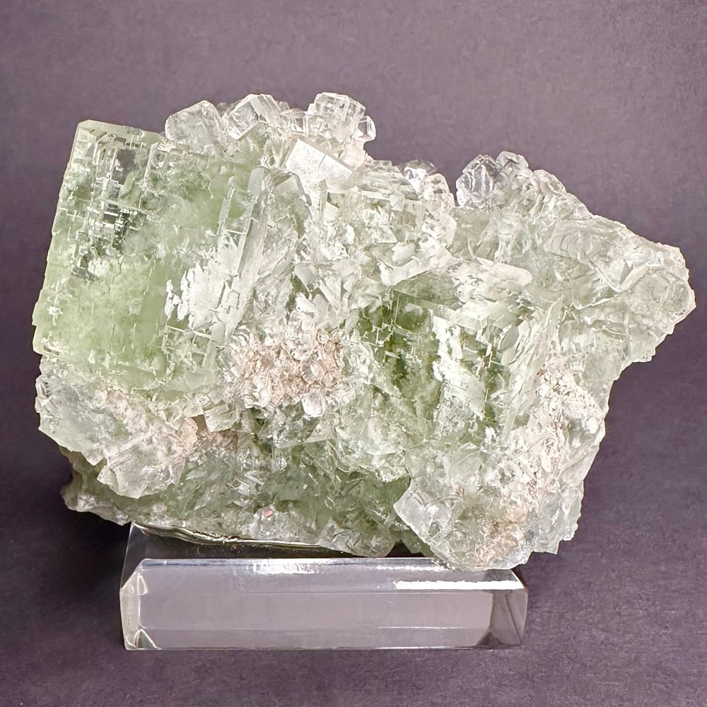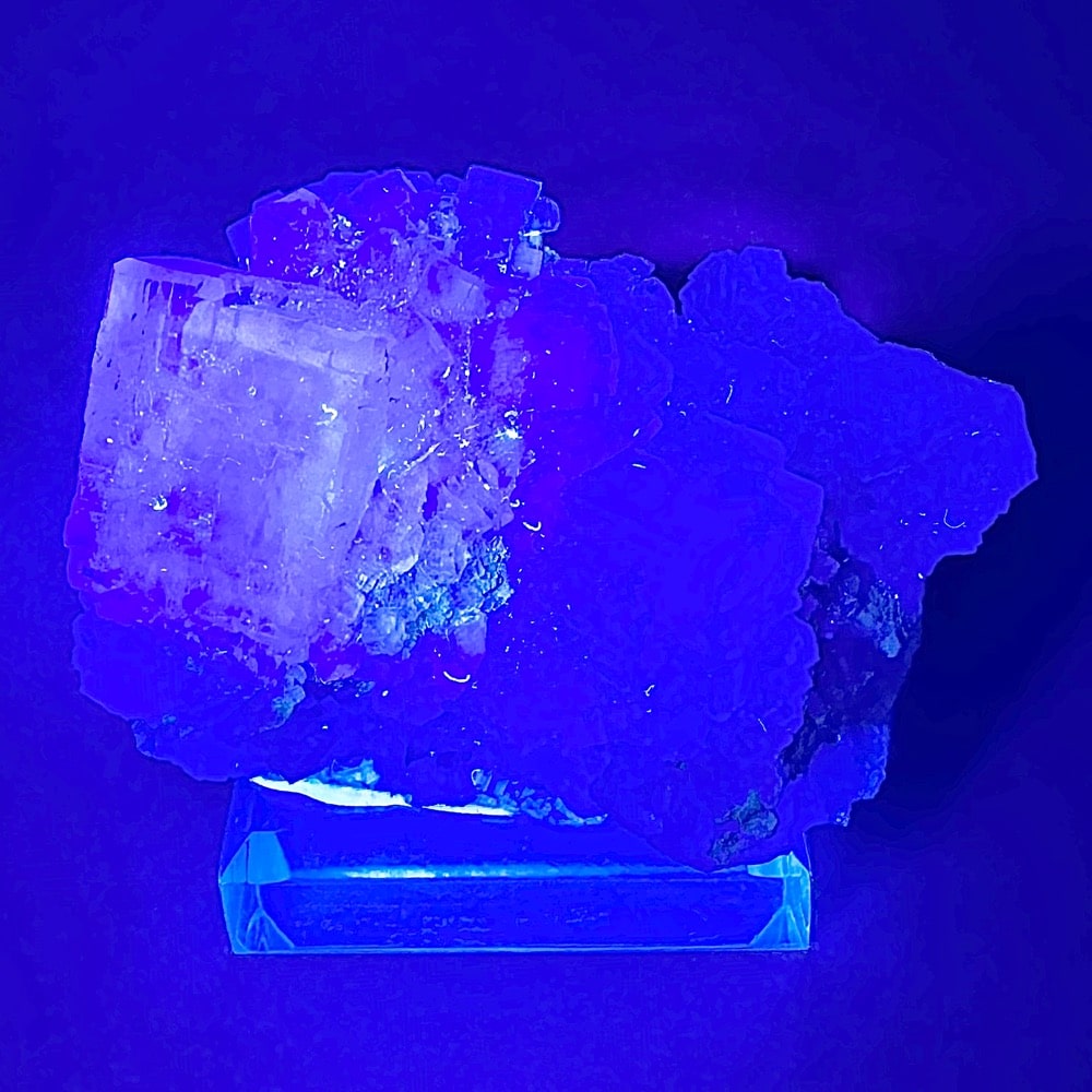 Appearance: Exceptional clarity, inclusions and mesmerizing design. It also will fluoresce a bluish purple under a LW/UV light. Comes on a plastic mount for display.