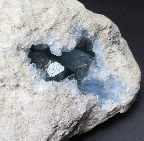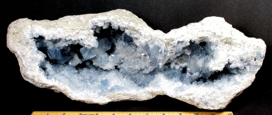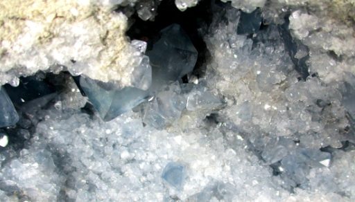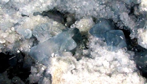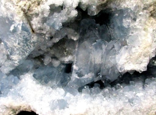 Celestite is a mineral form of Strontium Sulfate which is a metal. The metal is mixed with Carbon and Sulfur which is used for the red “fire” in fireworks, flares and road signals. Celestite occurs as Crystals and in compact massive and fibrous forms. It is mostly found in sedimentary rocks and is often associated with Gypsum, Anhydrite and Halite. Pale blue Crystal specimens are found in Madagascar.