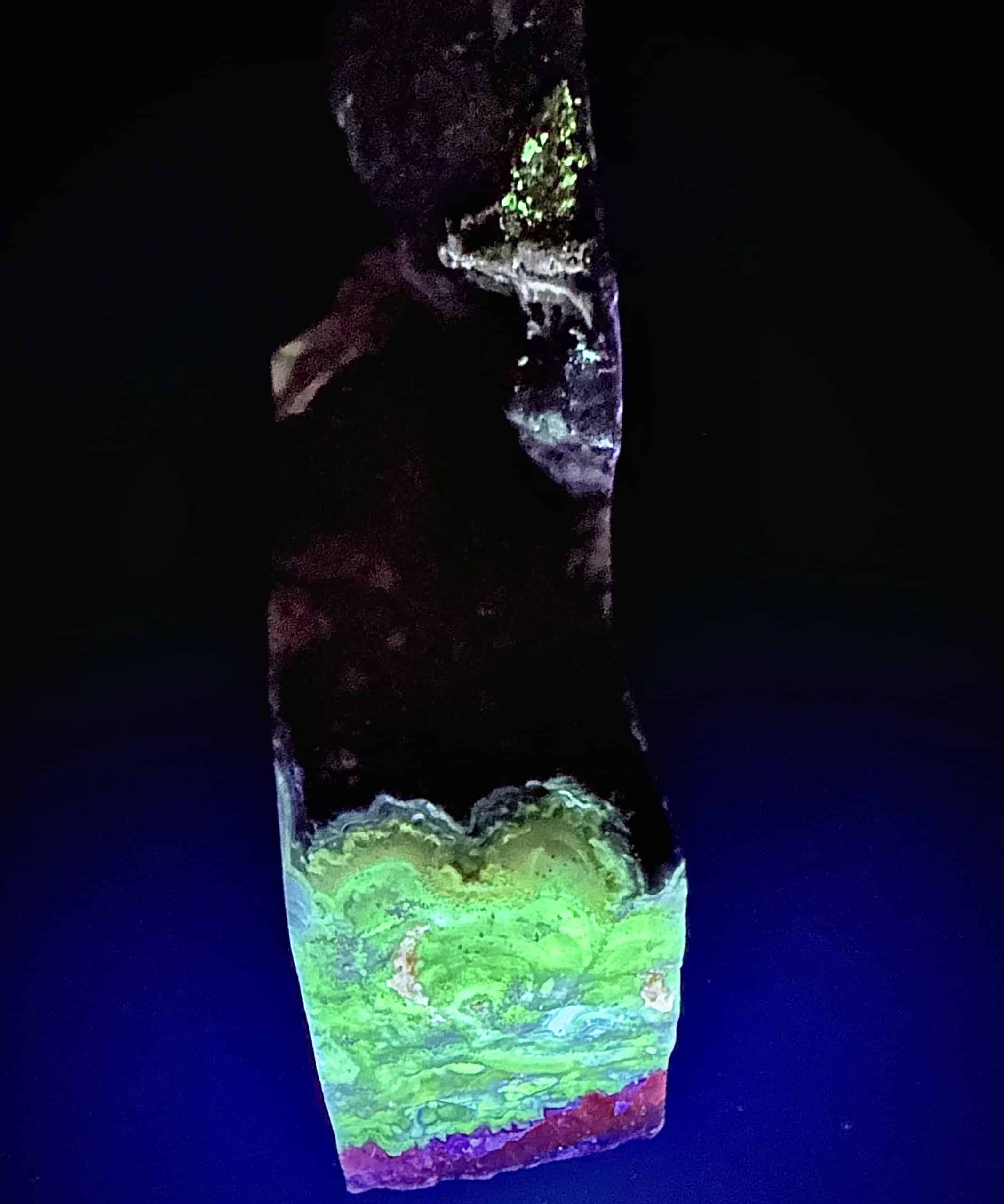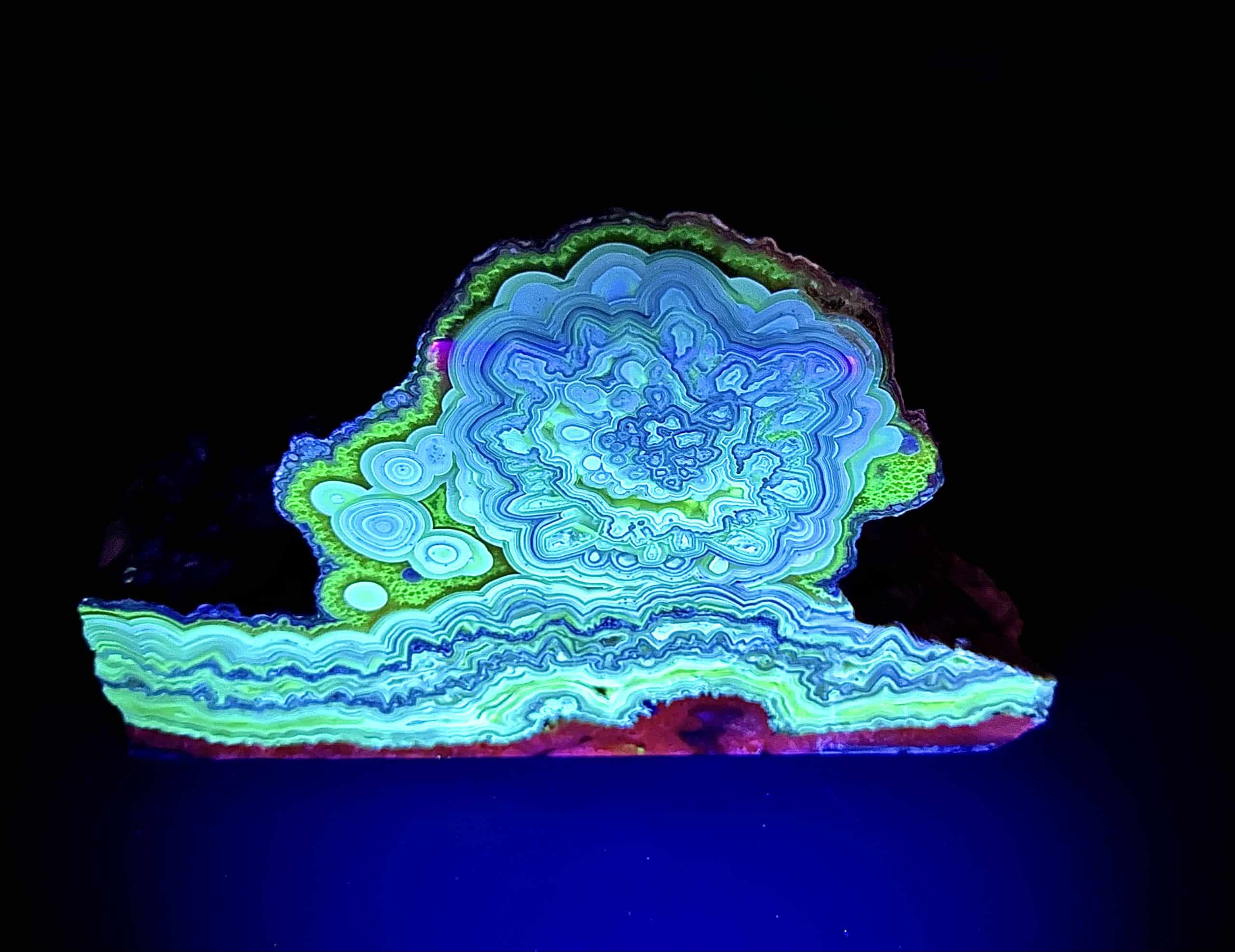 Here is an exceptional Mexican Lace Agate from an unknown location in Mexico. This beauty has a unique design and appearance in the different colors and the excellent lace banding ranging from red. white and cream to various grays and browns with different accents in the banding.  It measures 10″ x 2 1/4″ x 6 7/8″ tall and has a great polish.  This amazing rock will fluoresce a gorgeous green and blue under a UV/SW light as seen in the last photos. This fabulous, rare agate is the sole creation from our Lapidary department.