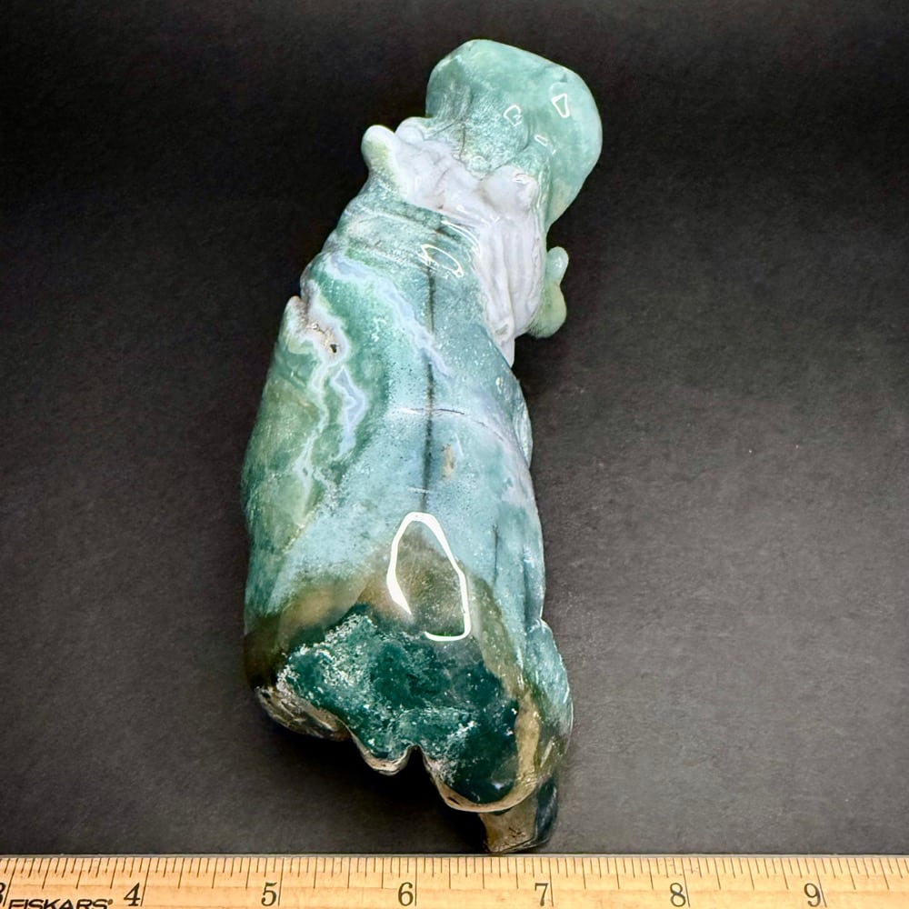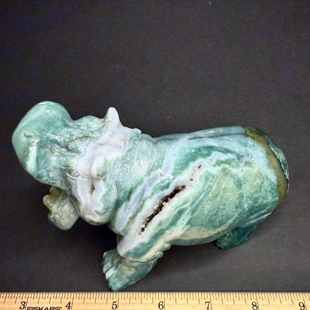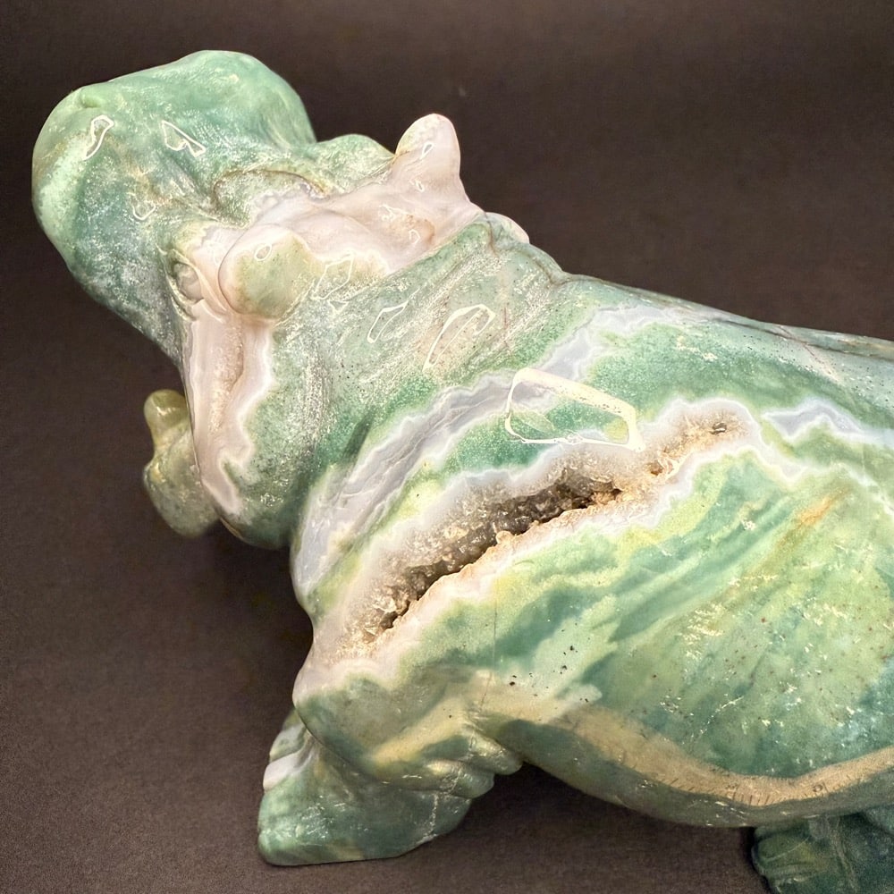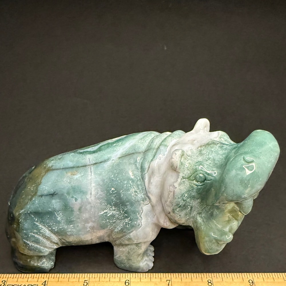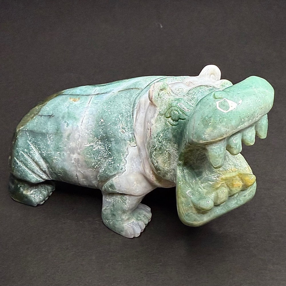 CV100: Moss Agate Hippopotamus   Locality: Obscure. Selection: Carved, polished.