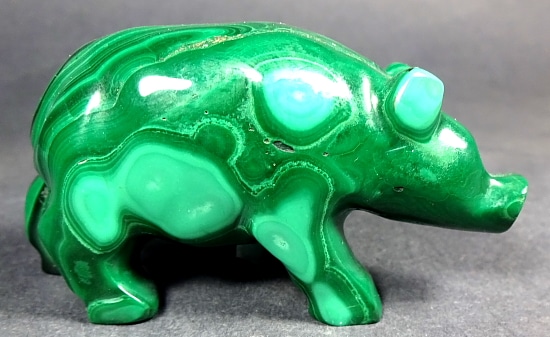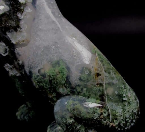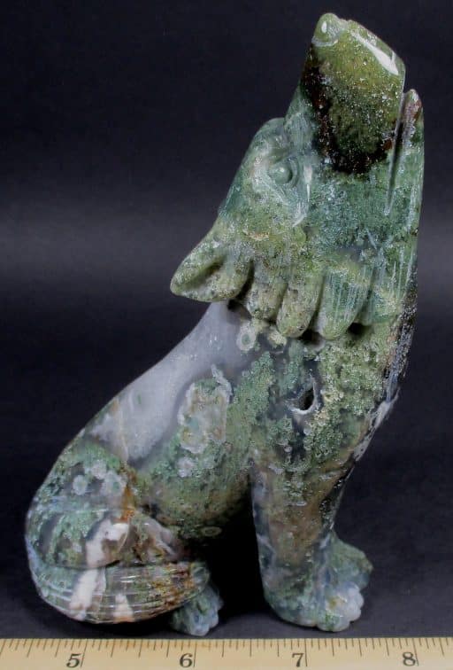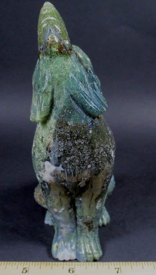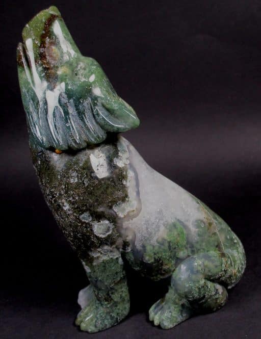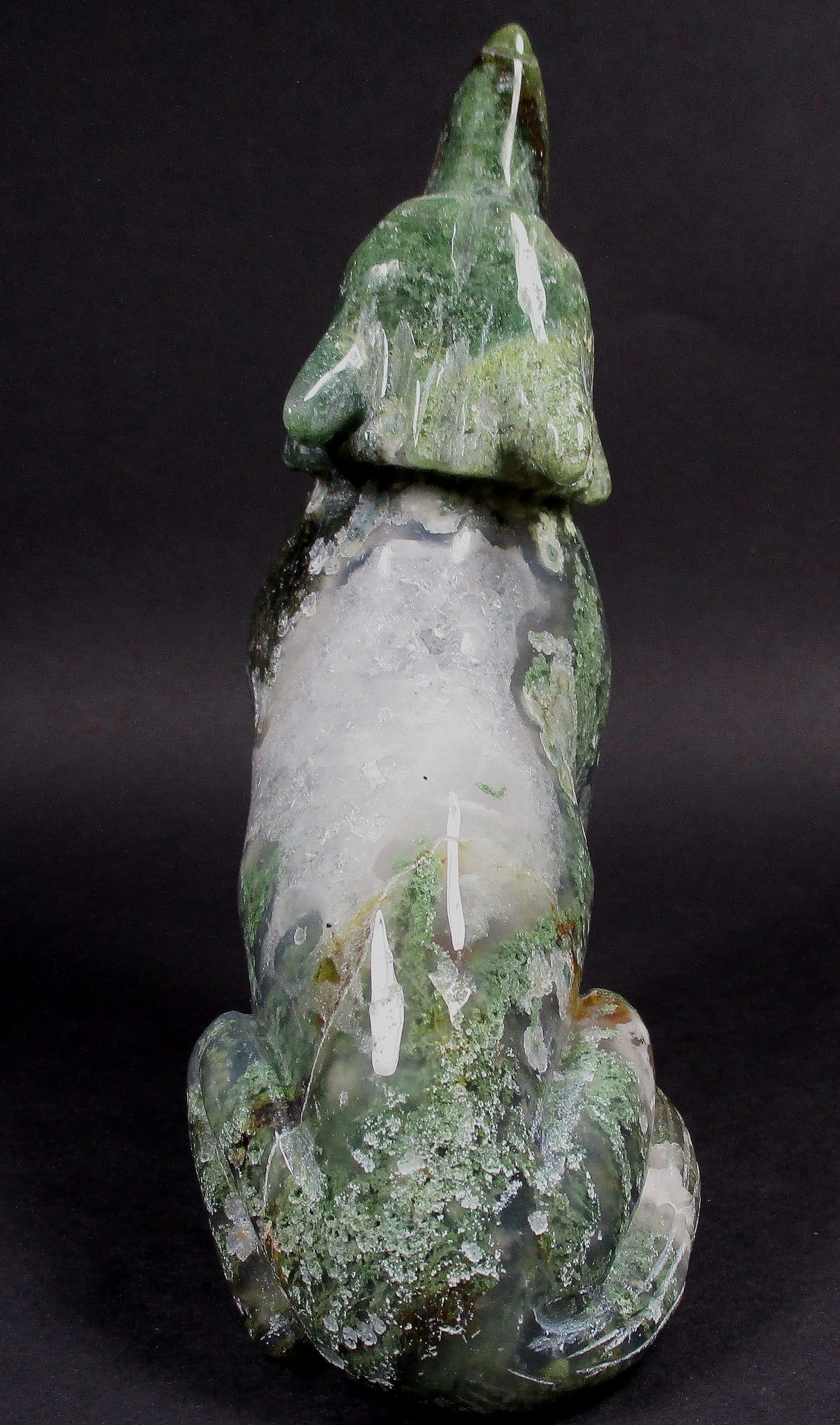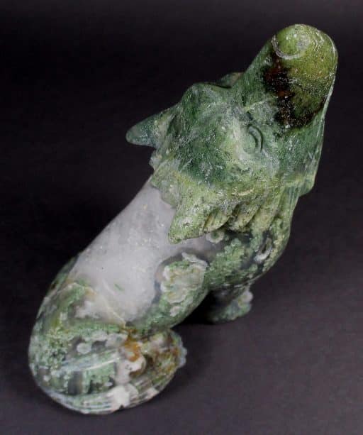 CV310: Green Tree Moss Agate Wolf Carving – This item offers a superior visual display of the high variation in green tones and mineral inclusion combinations.