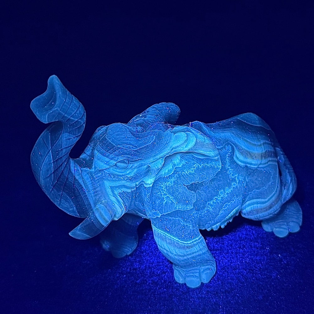 Appearance: Carved and has a matte finish except the trunk which is polished. Exceptional detail, color with a dazzling open crystal cavity and mesmerizing banding. Turns a bluish color under a UV light. UV fluorescent (shot with uvBeast 365nm(nanometer) Black Light UV flashlight).