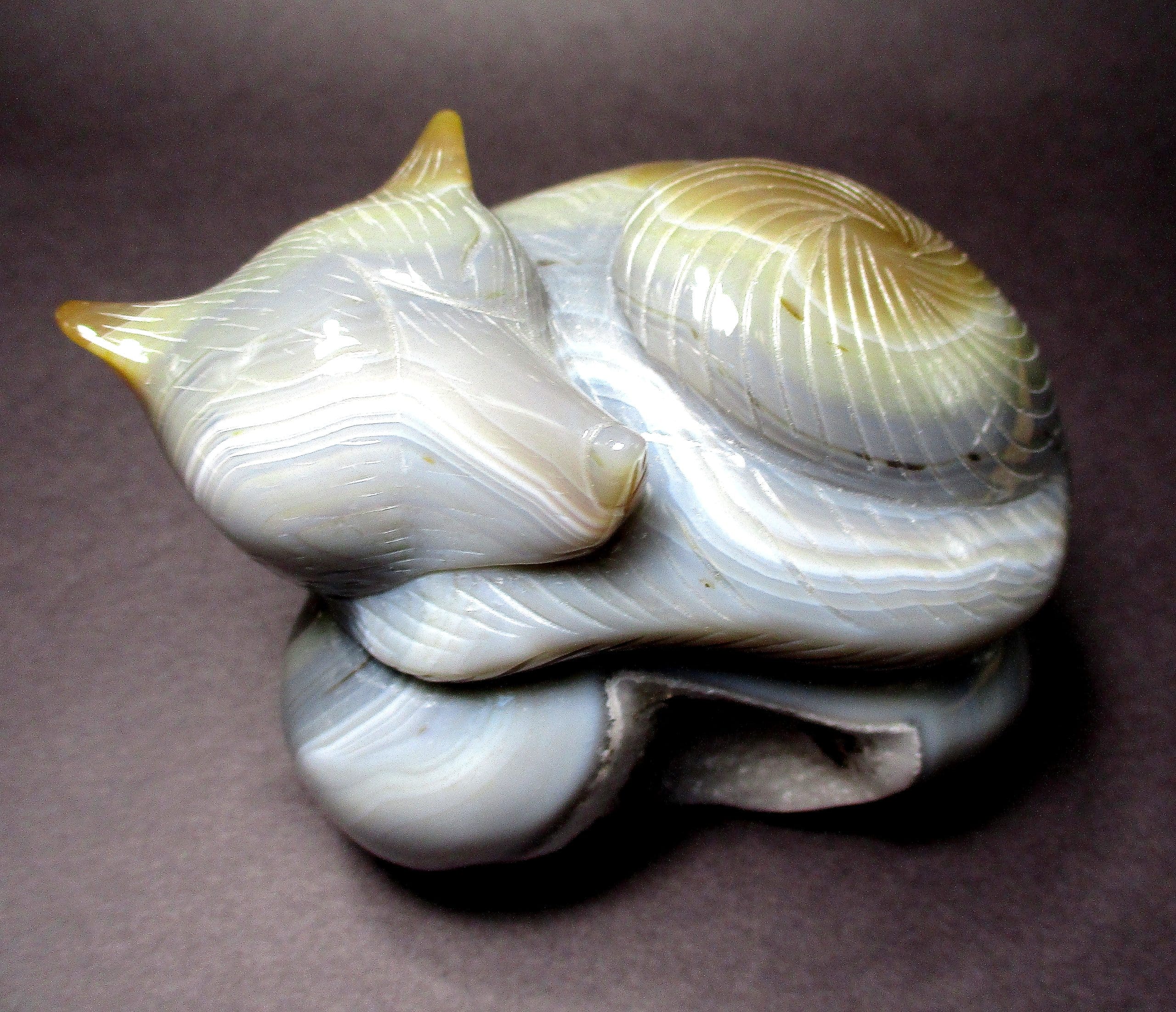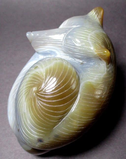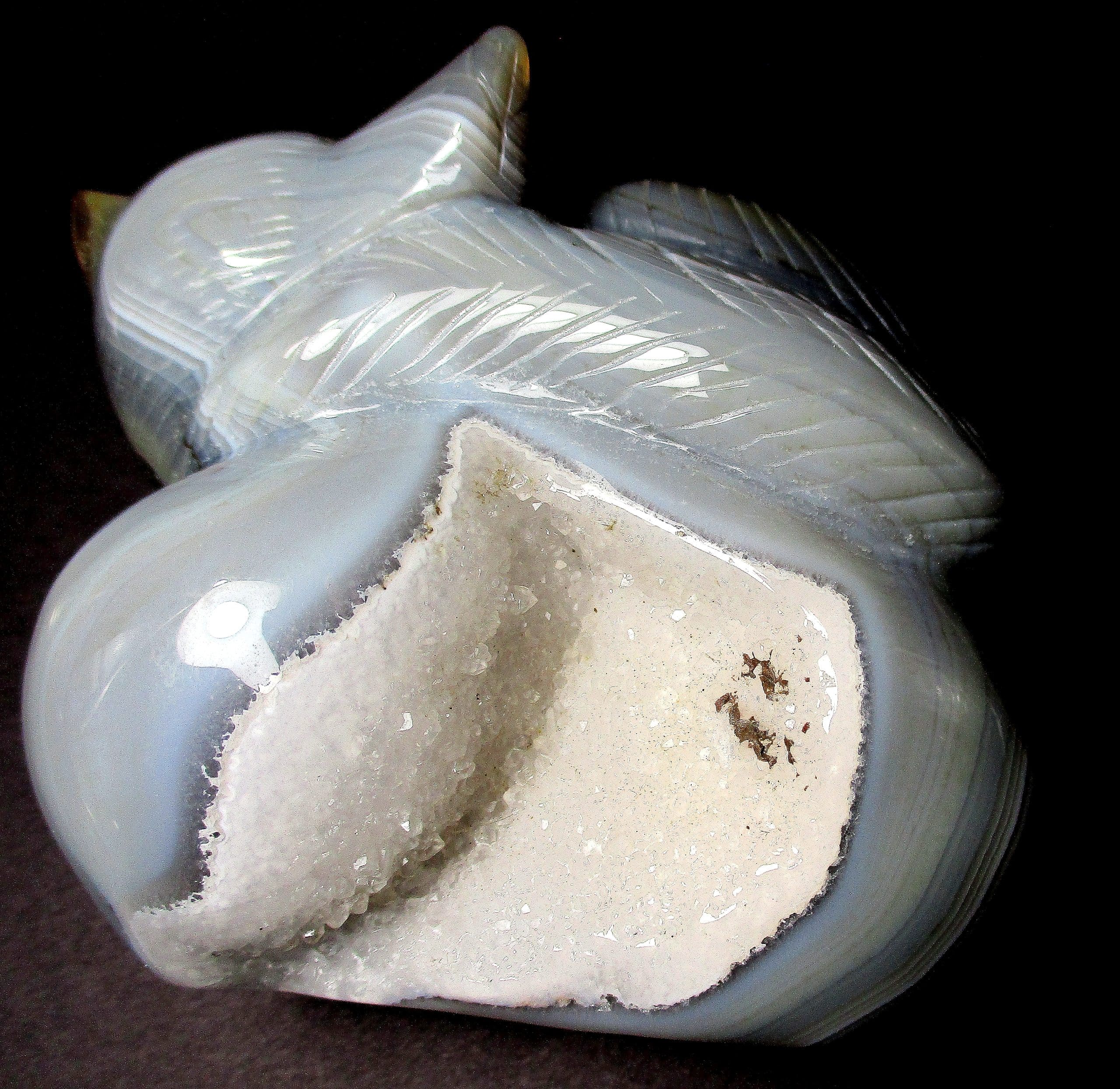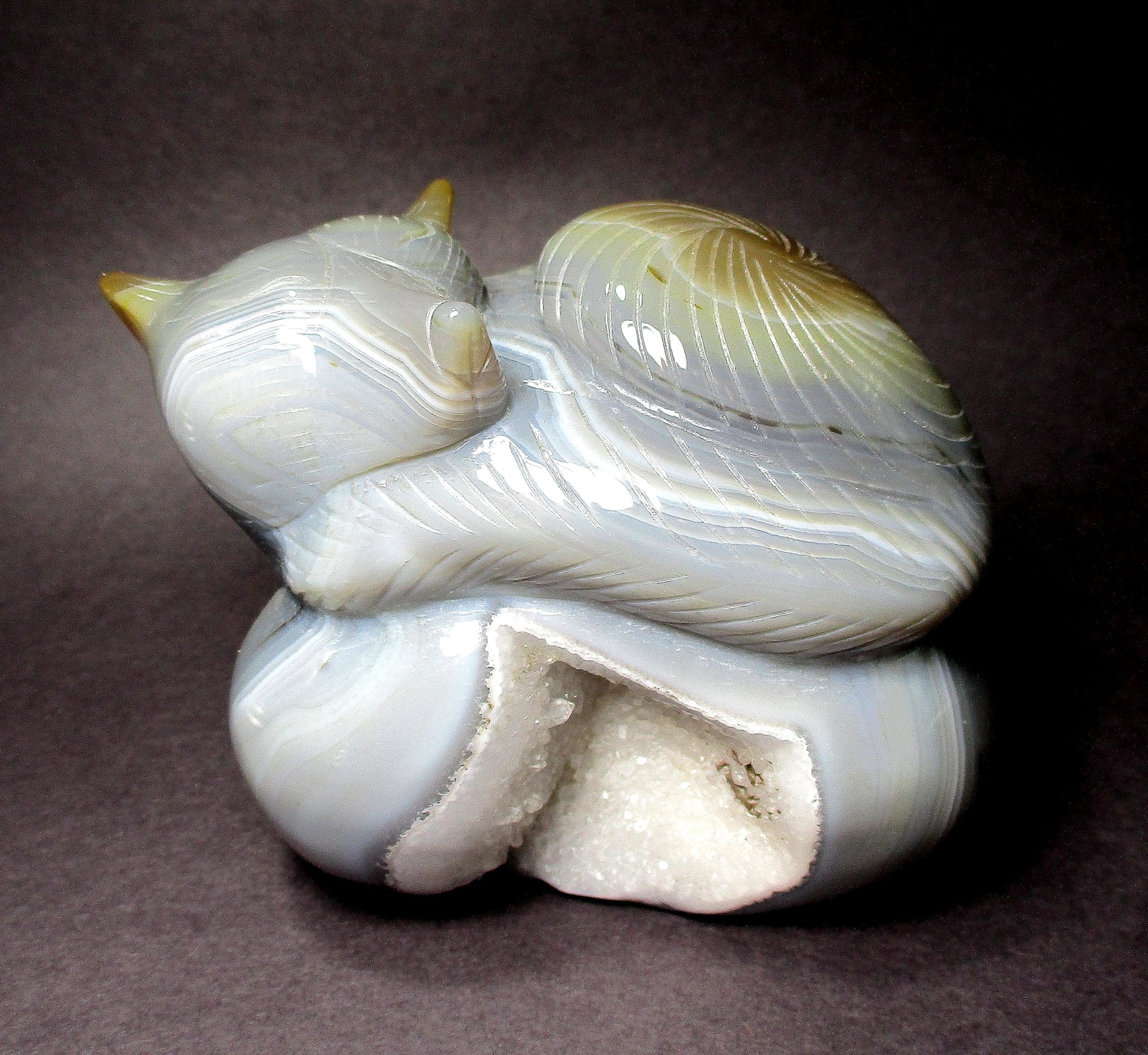 Appearance: Carved and polished to a high shine. Soft colors, cool banding and sparkling crystal.