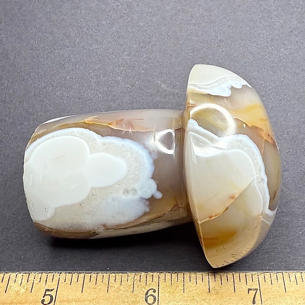 Agates mostly occur as nodules in volcanic rocks or waters containing Silica in solution which is possibly derived from the decomposition of Silicates in the lava. The Siliceous matter is deposited in regular layers resulting in the banded or striped formation. It is very unlikely that you would ever find an exact duplicate of any type of Agate, Brazilian or other.