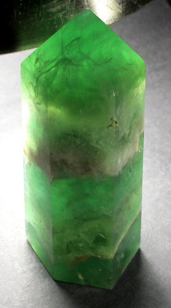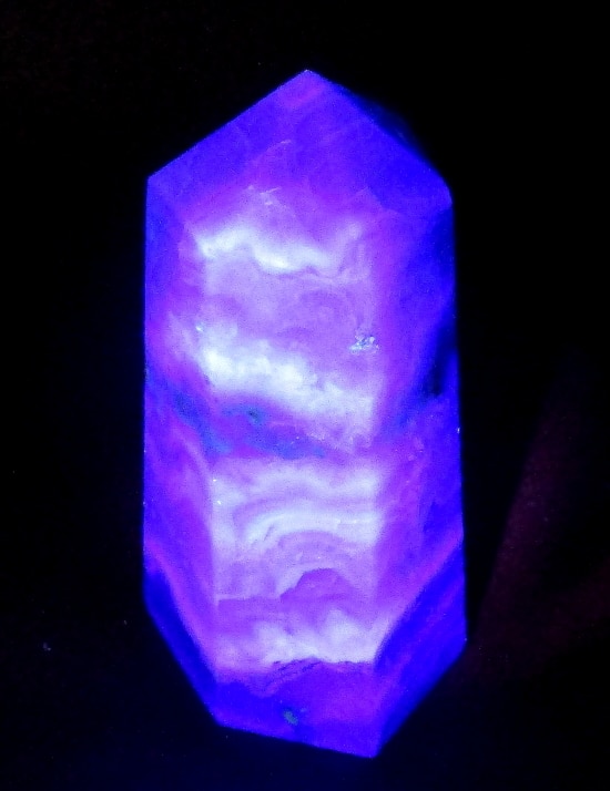 Fluorite, also known as fluor-spar, is a mineral composed of Calcium Fluoride. It is a widely occurring mineral and is often found with metallic minerals such as Galena and Sphalerite, but also with Barite, Quartz and Calcite. It may fluoresce strongly in ultraviolet light. Although green is the most common color, it can also be red, purple, blue, yellow and white.