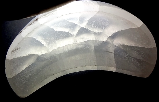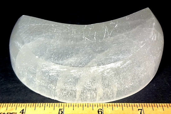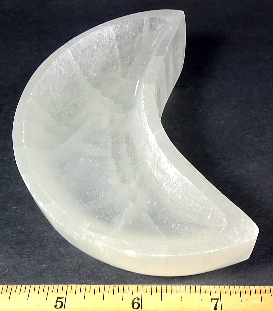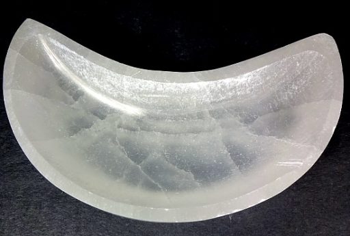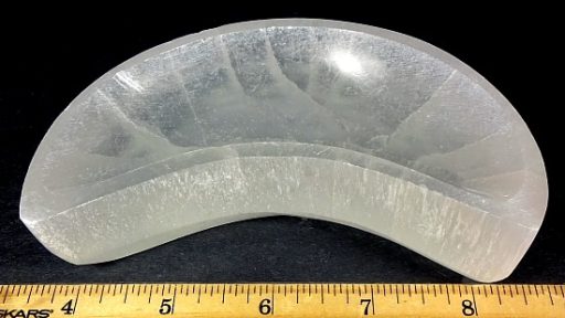 Here’s a new item, a nice functional Half Moon Shaped Dish carved from Selenite. It measures approximately 4 3/4″ x  2 1/4″ x  1 1/4″ tall. This carving has a high shine and a brilliant white color.