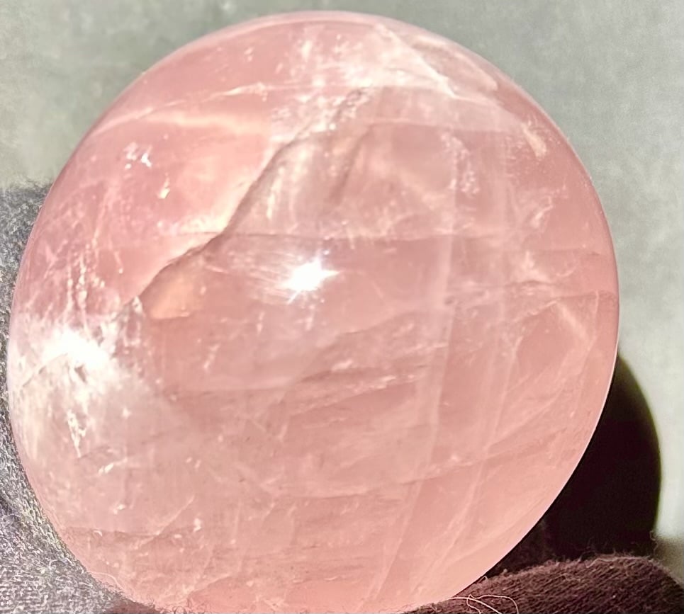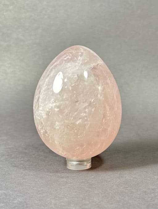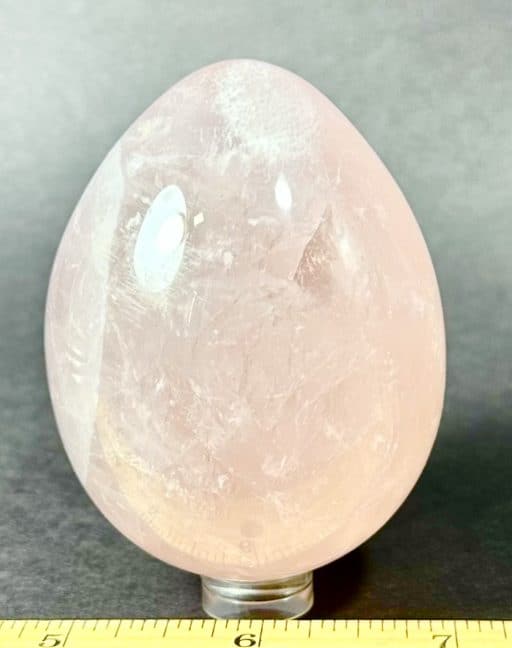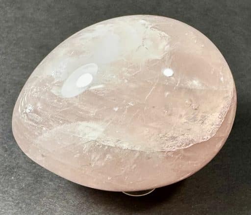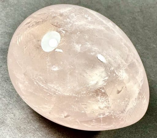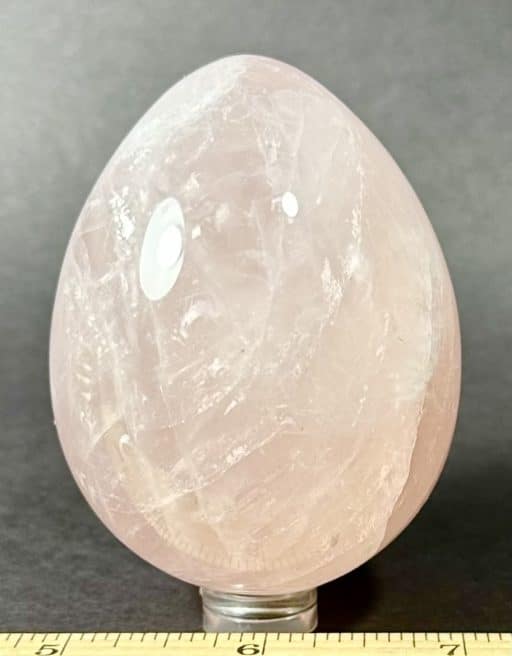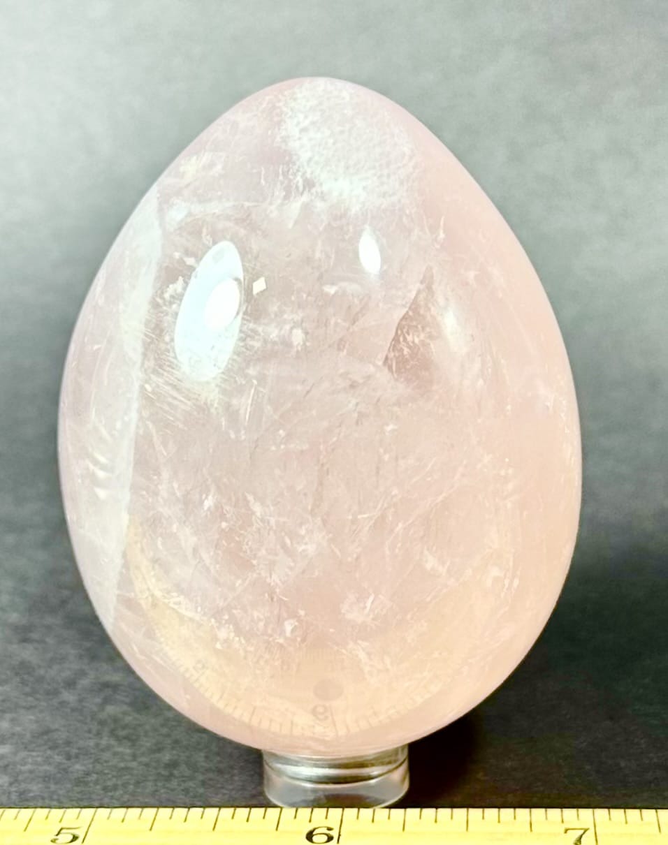 Egg100: Rose Quartz – Locality: Madagascar. Selection: Polished. Appearance: It has a pretty pink color, lots of neat inclusion and subtle “rainbow” reflections. It even has a cool 4 pointed “star” when rotated in bright light (which is very difficult to capture in a photo).