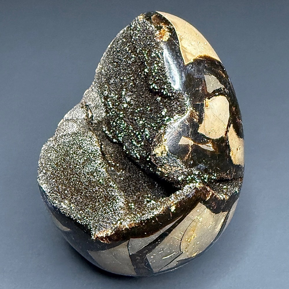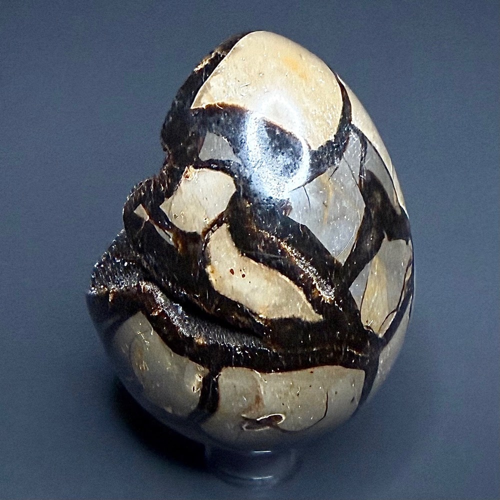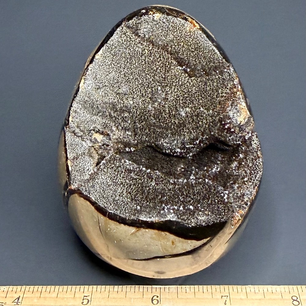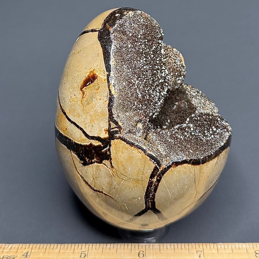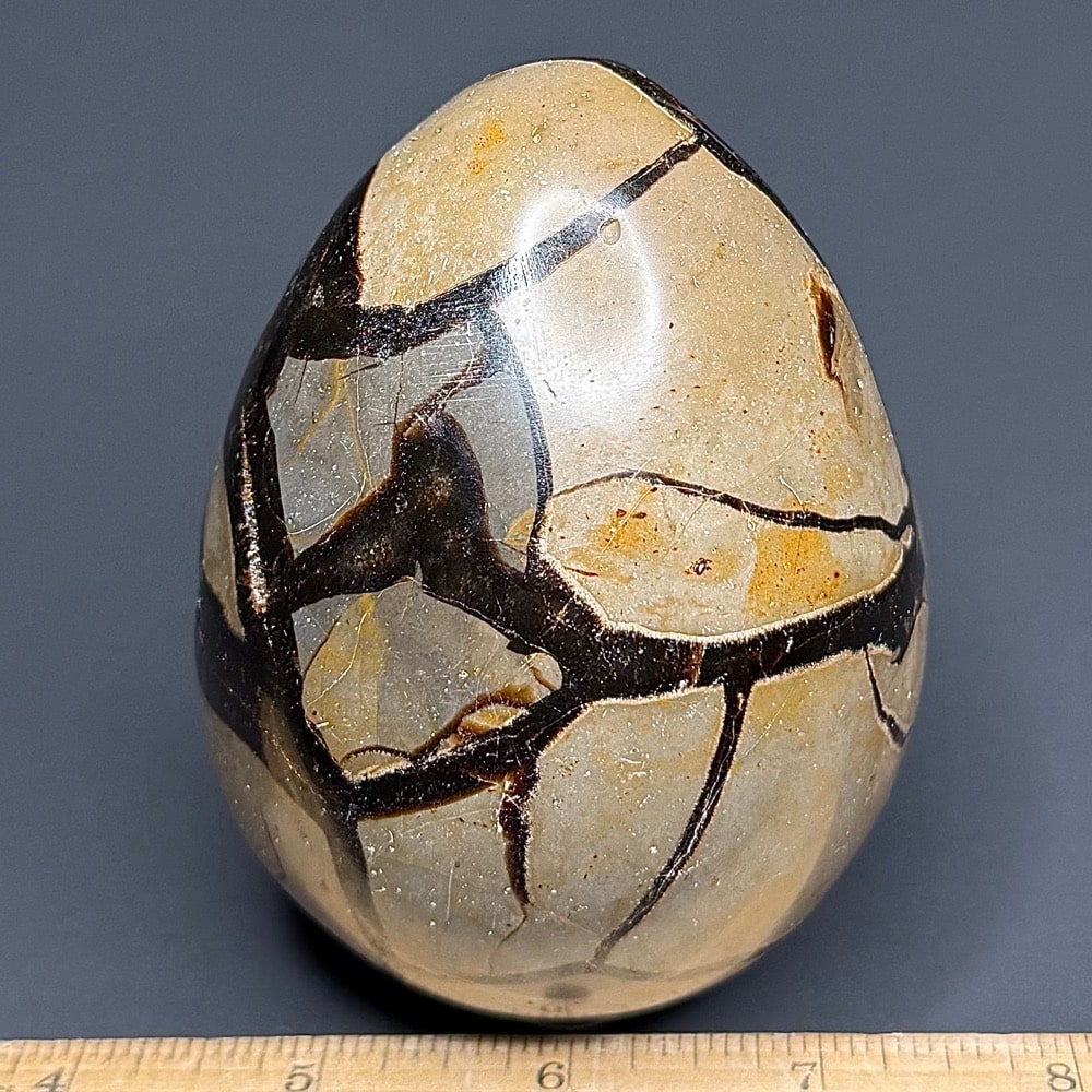Septarian, also known as a type of Concretion, is a volume of sedimentary rock in which a mineral cement fills the porosity. Concretions are often ovoid or spherical in shape. They form within layers of sedimentary strata that has already been deposited. It is composed of a Carbonate mineral such as Calcite, a Silica such as Chert, Flint or Jasper or an Iron Oxide such as Goethite or Hematite. It is commonly found in Shale, Siltstones and Sandstones.