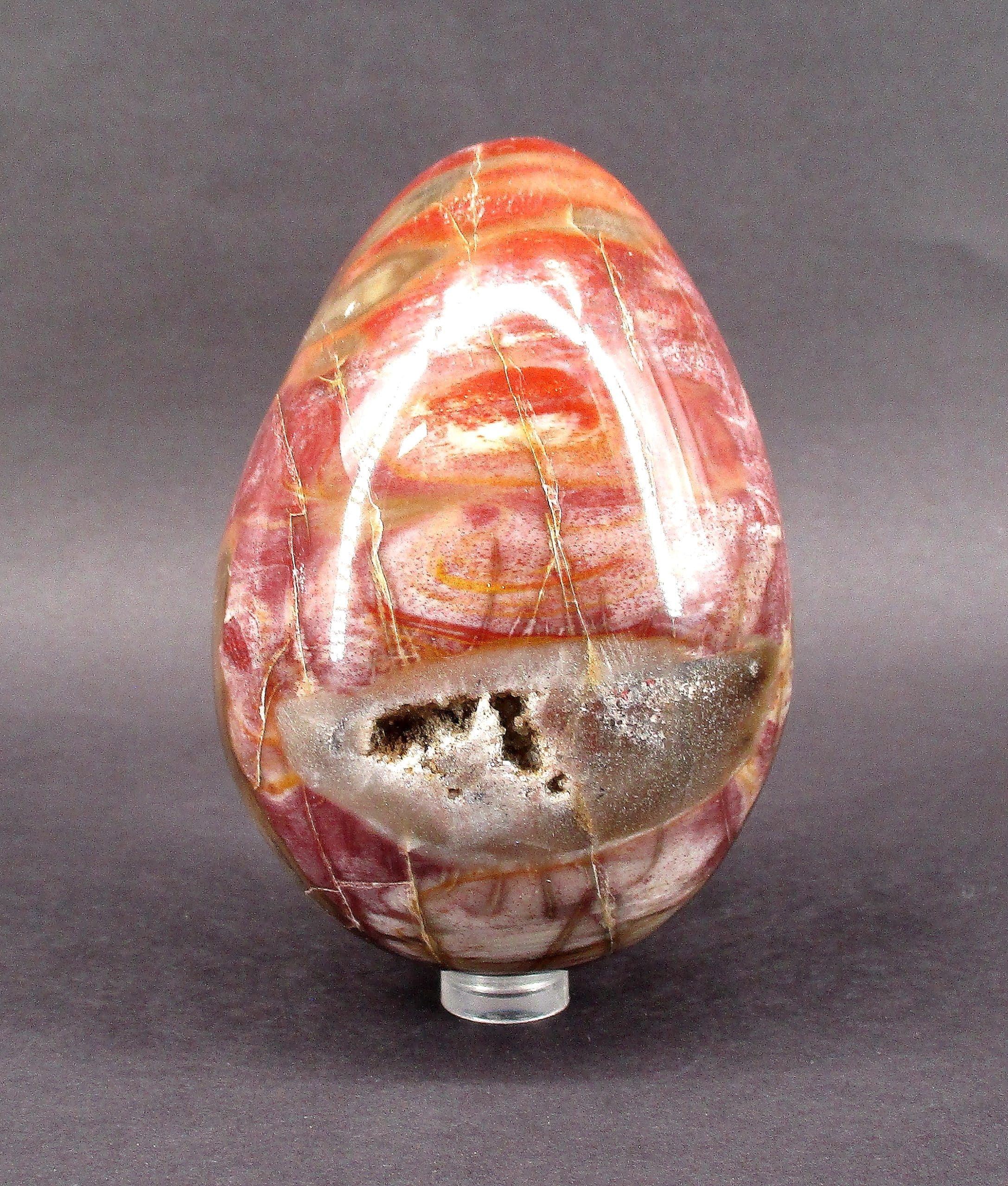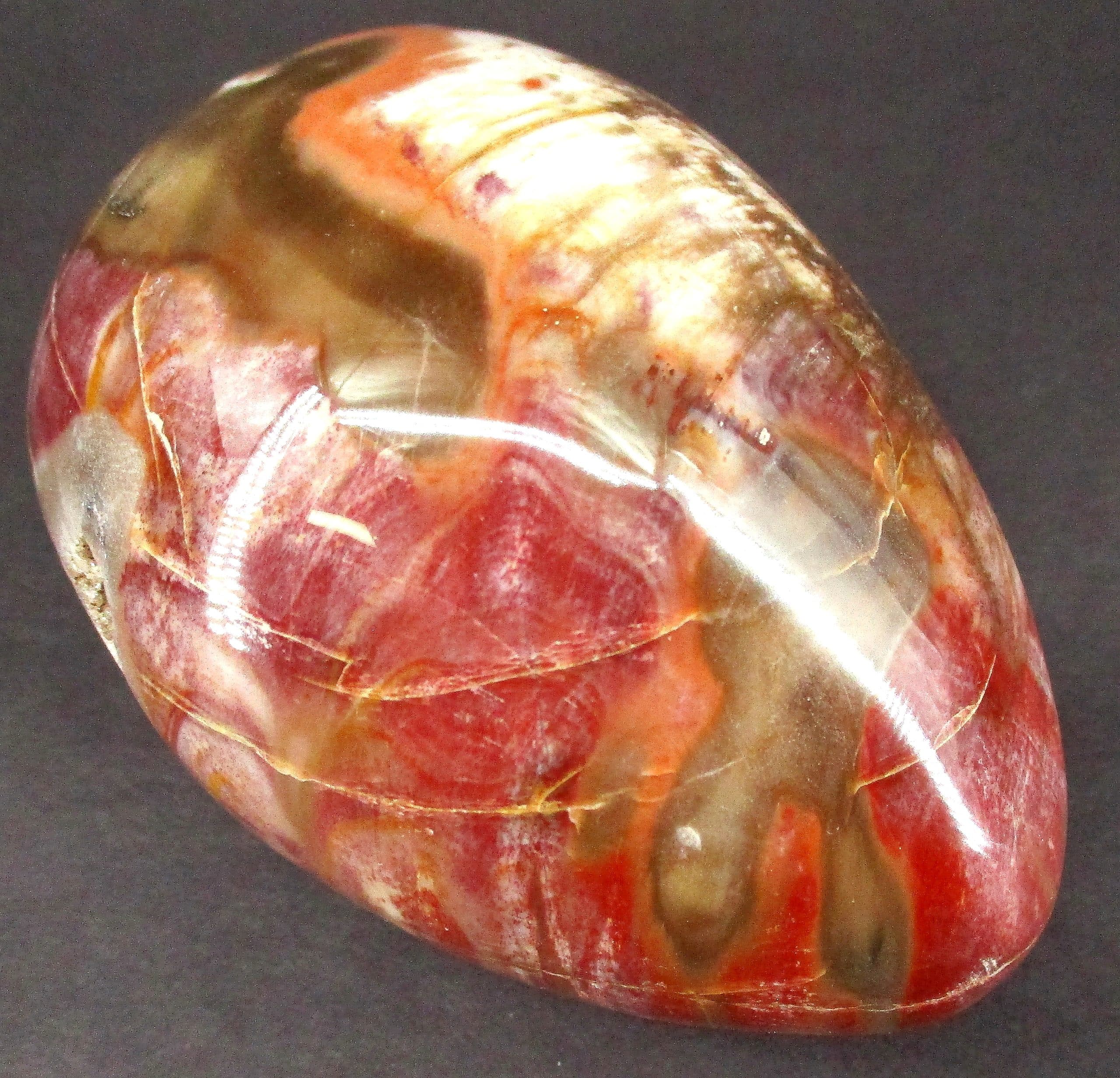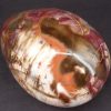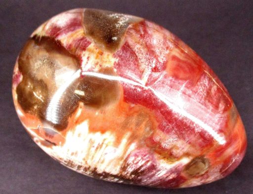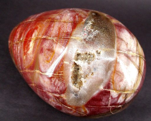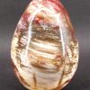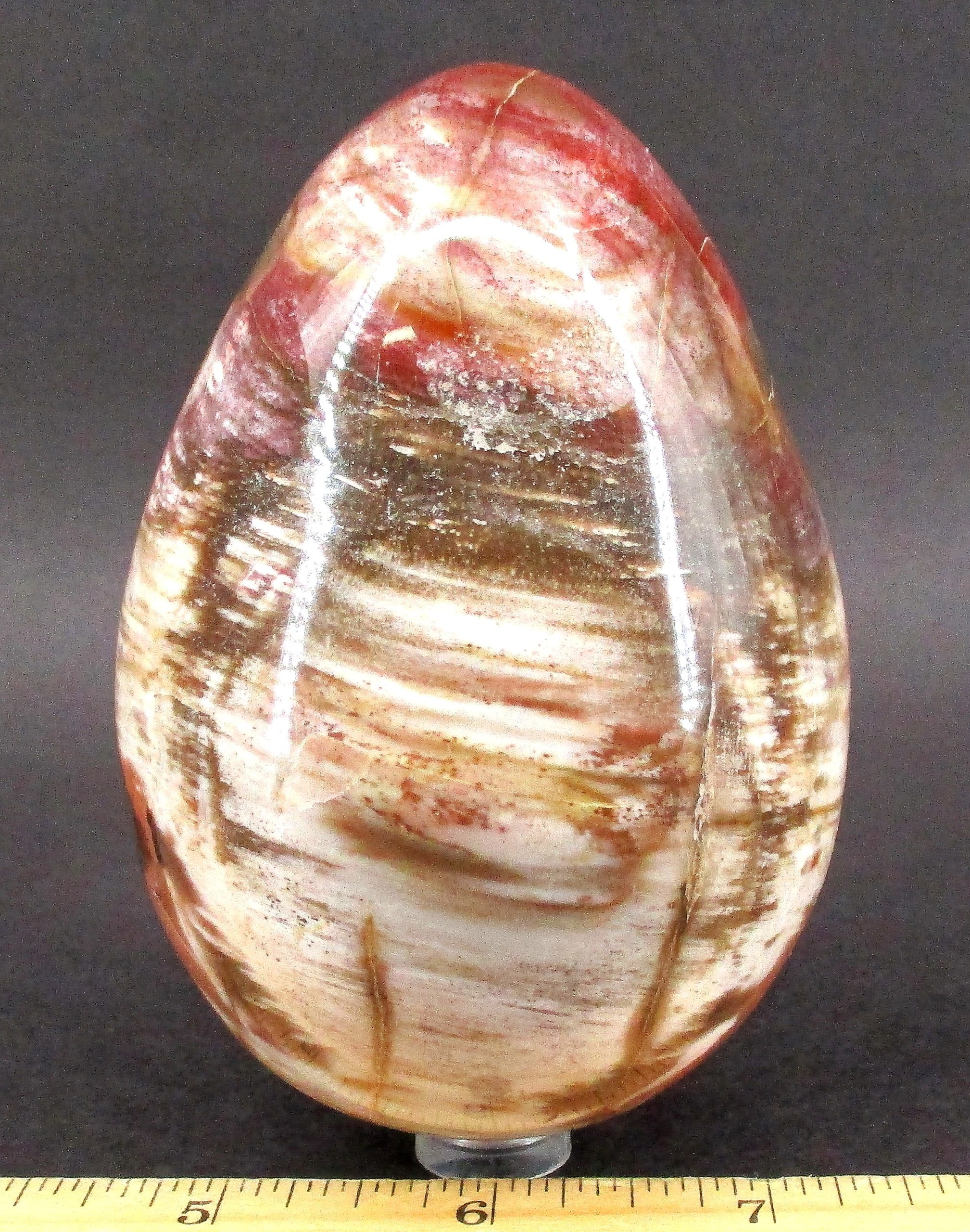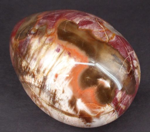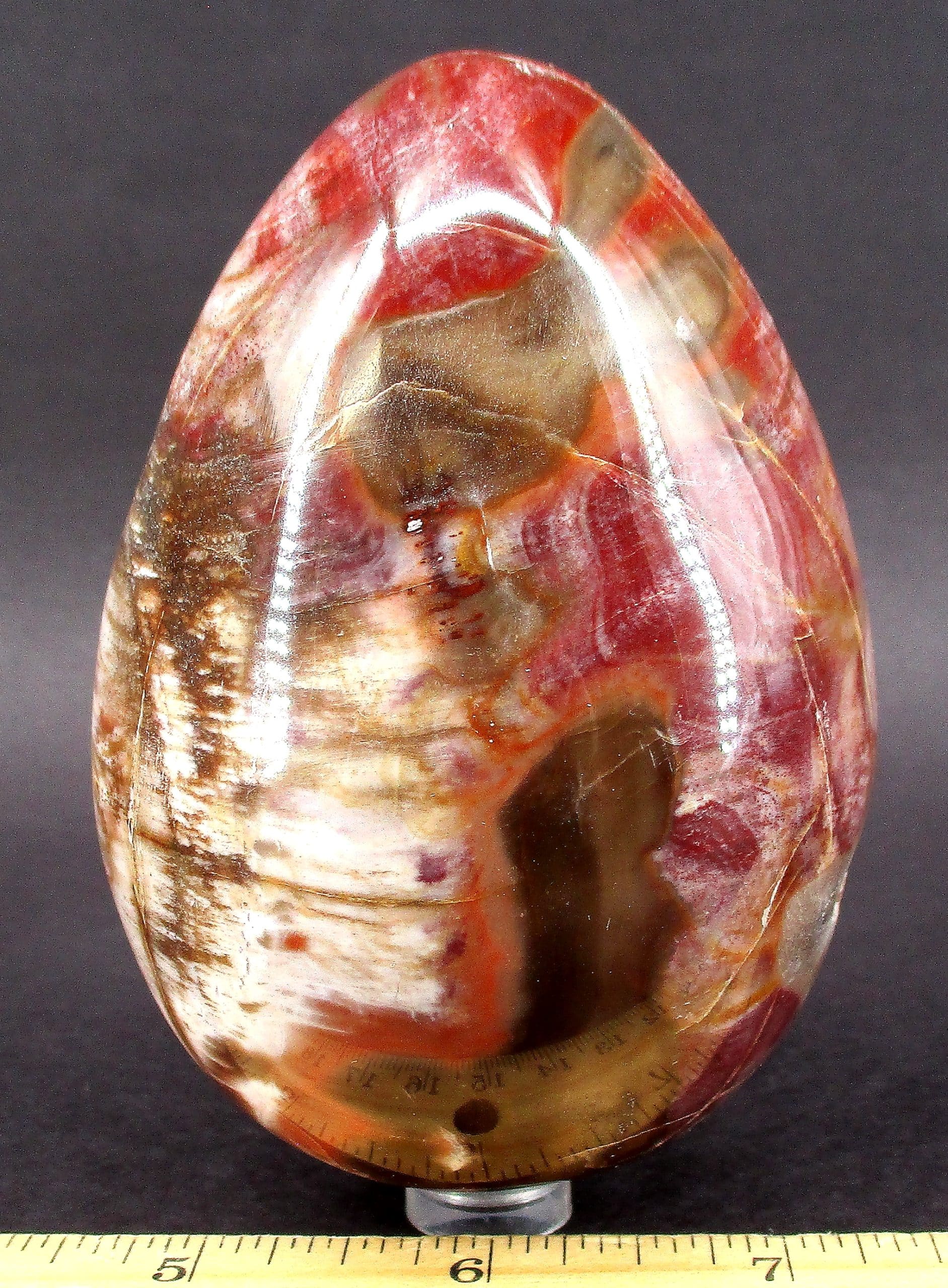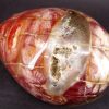 Here is a very nice larger Petrified Wood egg. It measures 3 5/8″ tall x 2 5/8″ in diameter with a nice polish. This egg has a beautiful color combination of Reds, White and Browns in a gorgeous design. It would make a great addition to your collection. This type of material is known for the occasional internal fractures and flat areas which are common to Petrified Wood. A beautiful egg indeed!