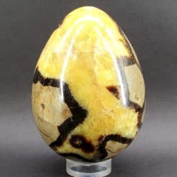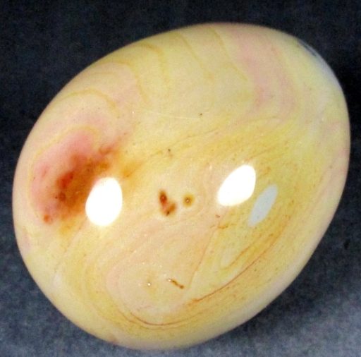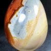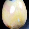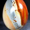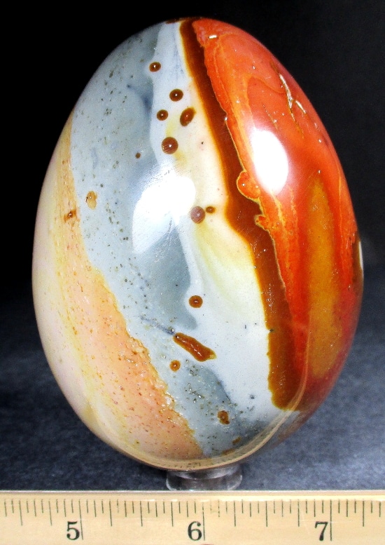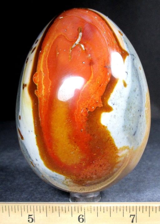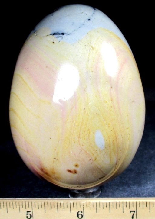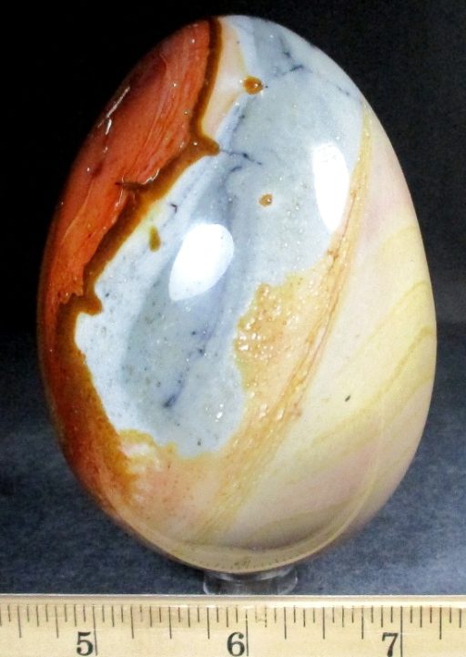 This is an exceptional Poly-Chrome Jasper egg with an interesting pattern.  It measures 3 1/2″ x 2 3/8″  with a good polish.  This egg has a great combination of contrasting bold and pastel colors in a captivating design. This material is from Madagascar.  Beautiful!