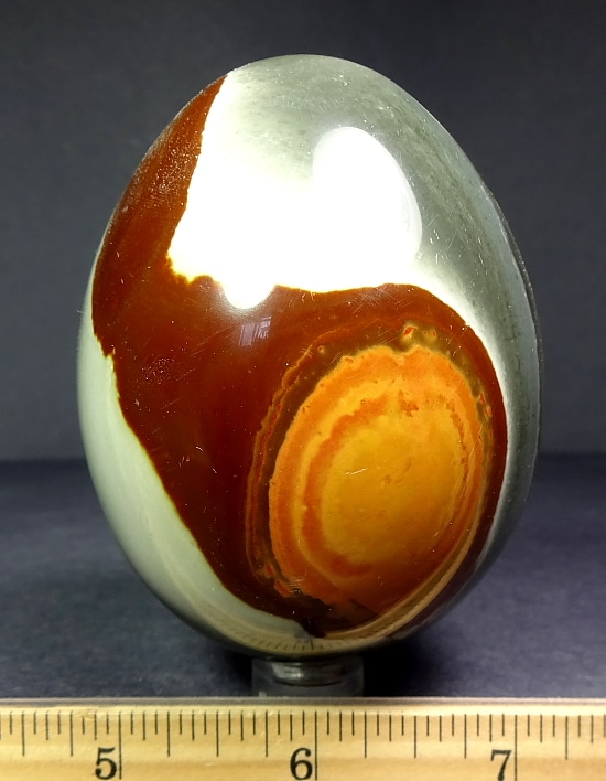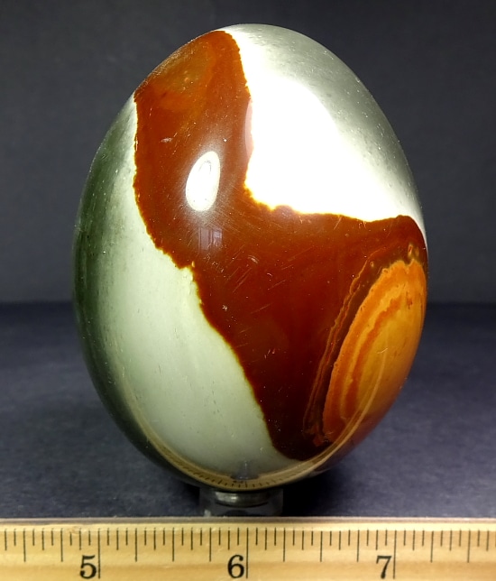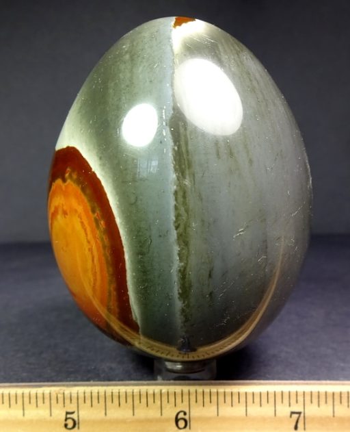 This is an exceptional and unique Poly Chrome Jasper egg from Madagascar.  This egg measures 3 1/8″ tall x 2 3/8″ in diameter and has a great polish.  It has amazing design and fabulous color. A unique addition to your collection.