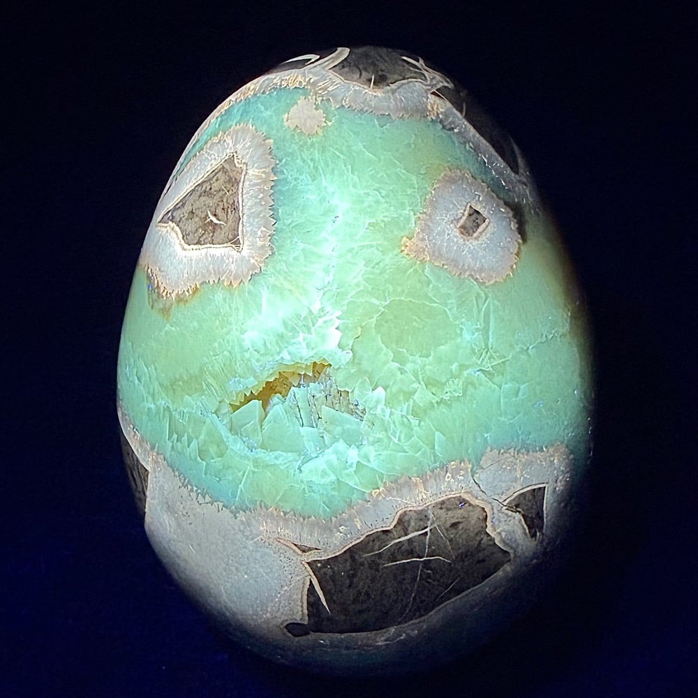 Appearance: Cut from Septarian Nodule.  Concretion interior minerals – Calcite and Aragonite. UV fluorescent (shot with uvBeast 365nm(nanometer) Black Light UV flashlight).