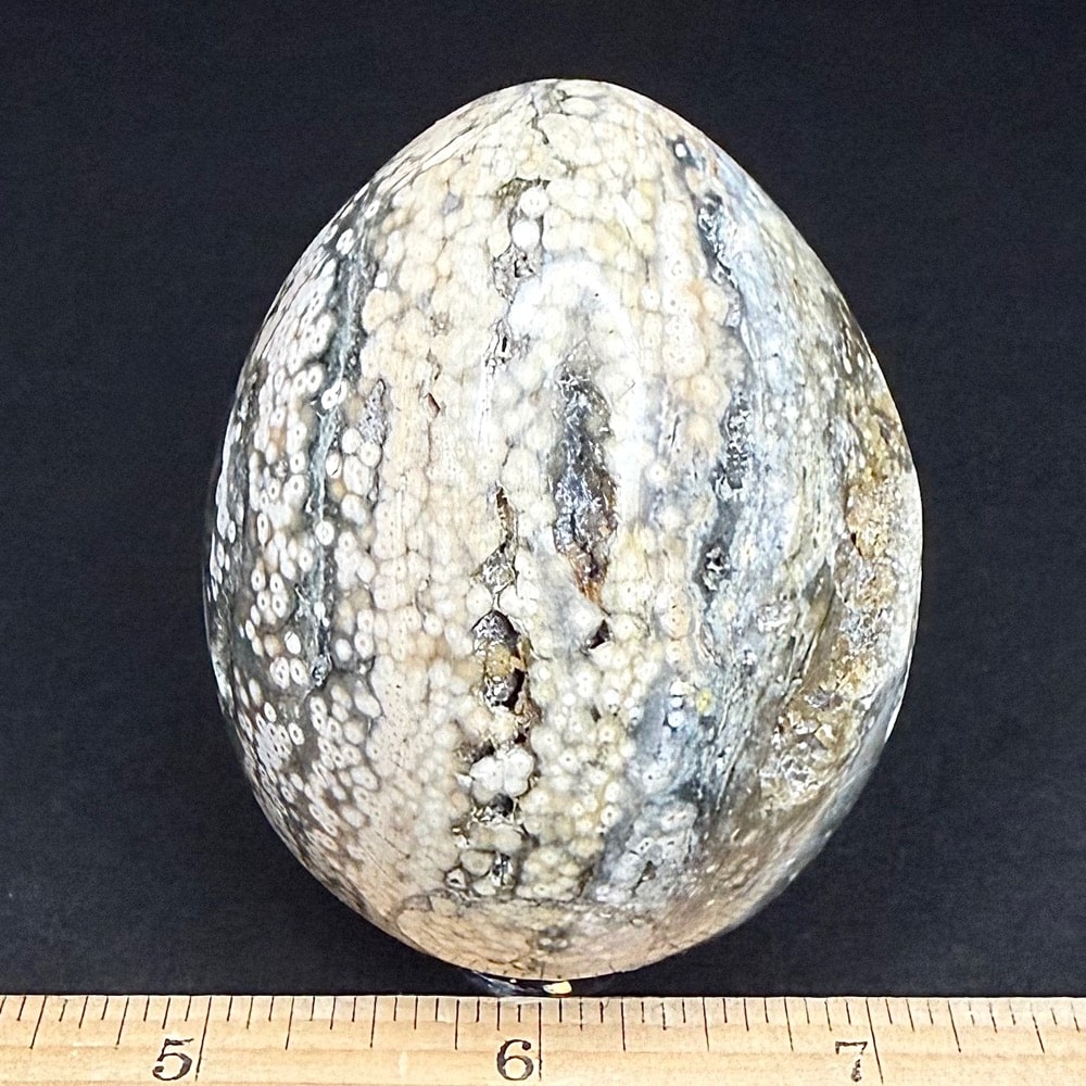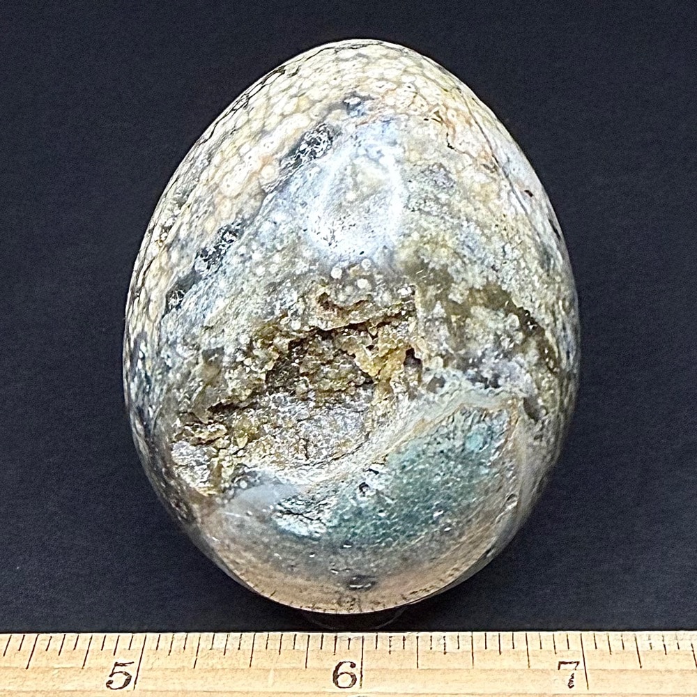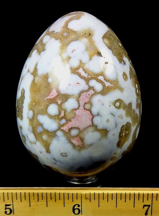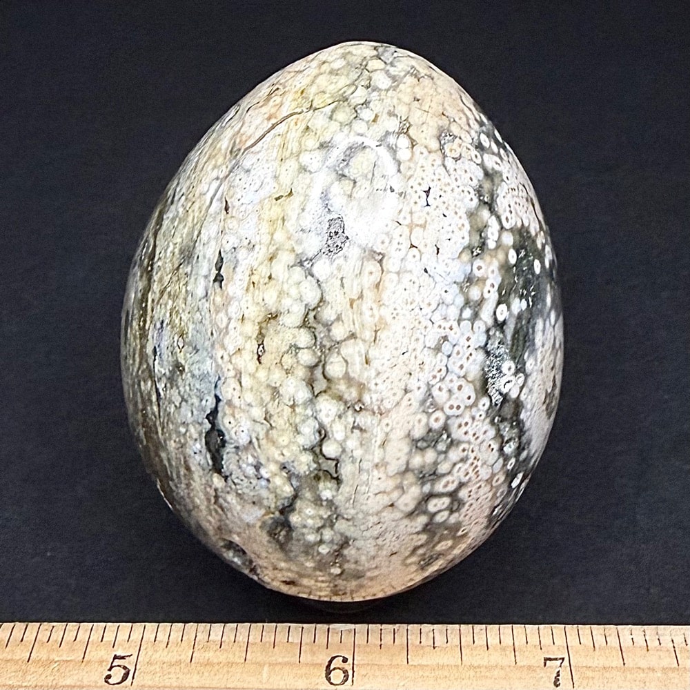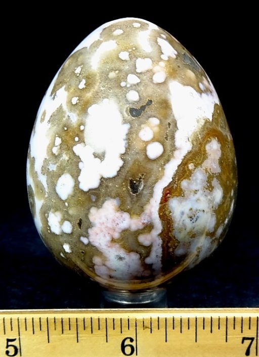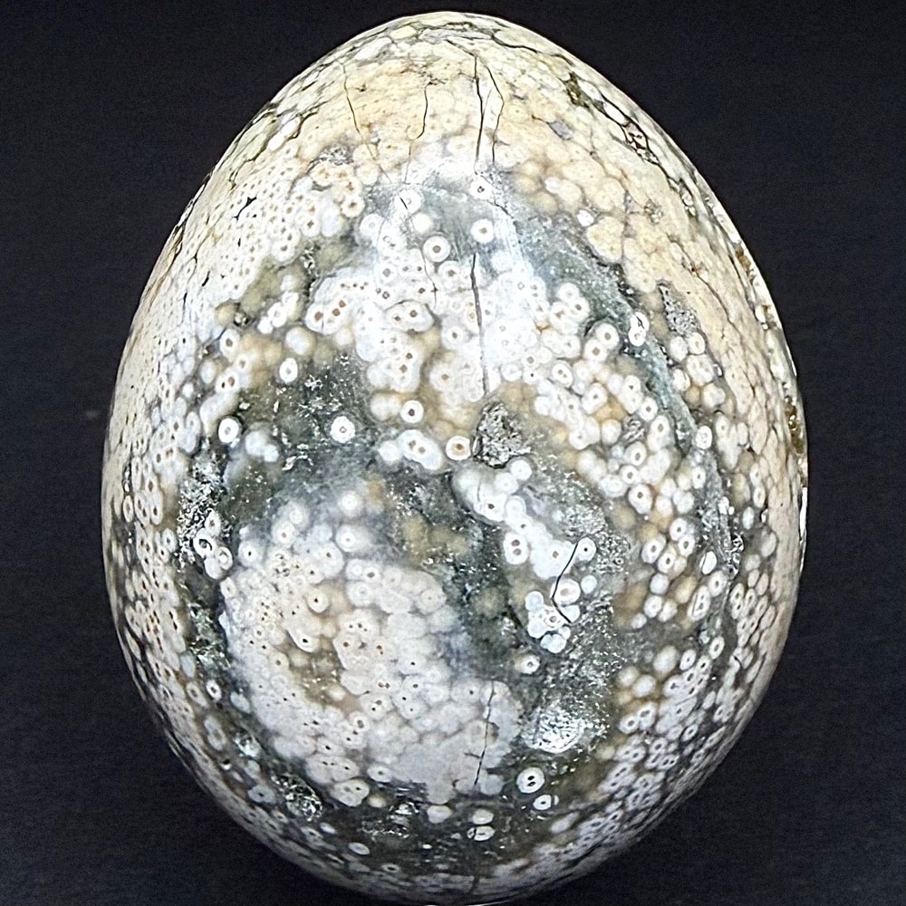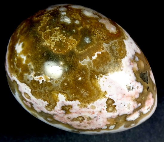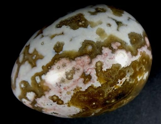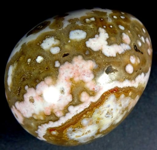 The Ocean Jasper deposit, even though it was found only a few years ago, is nearly gone and the material is becoming hard to find. The deposit formed as a Rhyolite flow but has been completely silicified. The Rhyolitic eyes or orbs come in an astonishing array of colors and color combinations. The background can be white, pink, green, red, or yellow. Botryoidal formations as well as white and deep green druzy are also common. This deposit was discovered at the edge of the ocean. It can only be seen and collected at low tide. The area has no road so the material must be transported to civilization by boat. Several other types of jasper are found in that area now but the orbicular Jasper is gone.