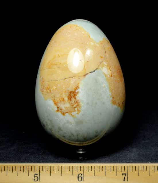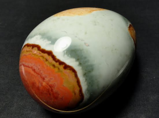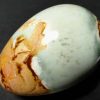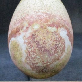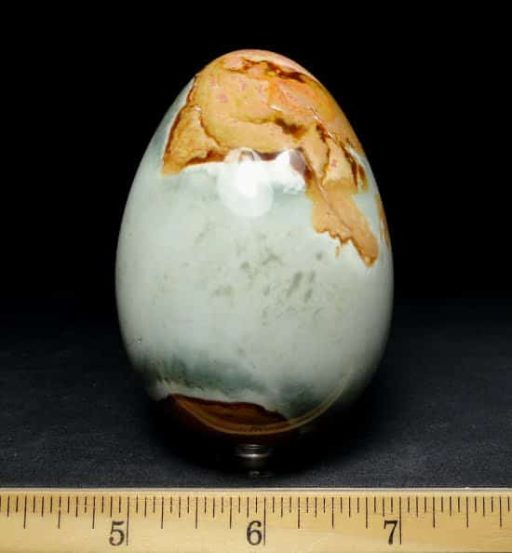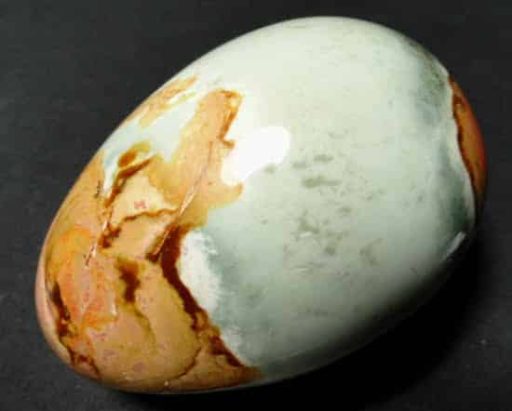 This is an interesting egg carved out of Poly Chrome Jasper.  This awesome egg measures 3 1/8″ tall  x  2 1/4″ in diameter and has a high shine. The Poly Chrome egg has a beautiful pastel color combination of Blue, Pink, Beige, Brown and Orange in an  interesting design.  Very cool!