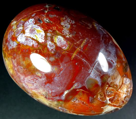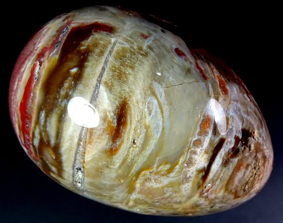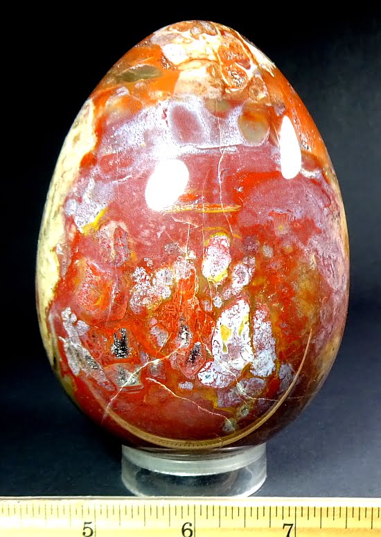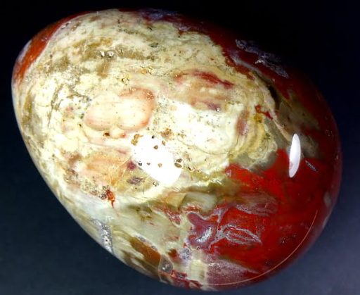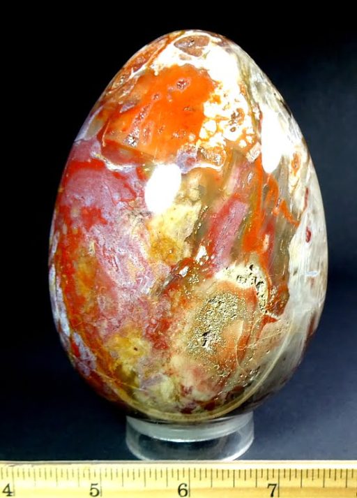 Here is a very nice larger Petrified Wood egg from Madagascar. This egg measures 4 3/8″ tall x 3 1/8″  with a nice polish. This egg has a beautiful color combination of Reds, Cream, Browns with pretty crystal areas all in a gorgeous design. This type of material is known for the occasional internal fractures and flat areas which are common to Petrified Wood.  It would make a great addition to your collection.