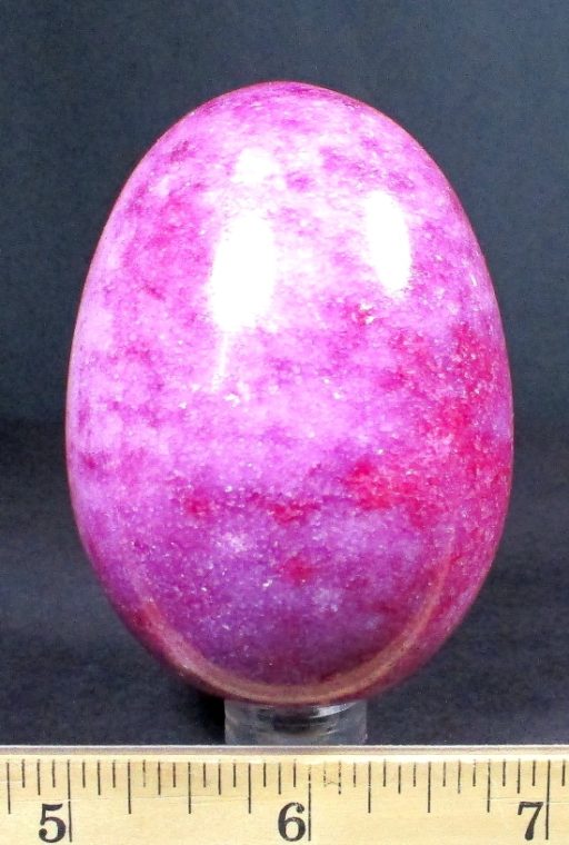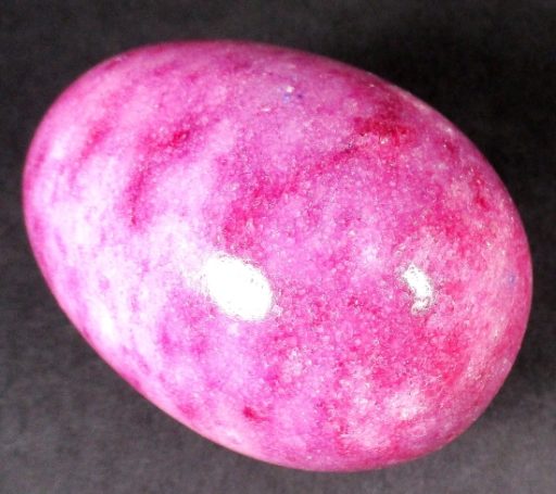 Color-enhanced Tie Dye Pink Marble egg.  It measures 2 5/8″ x nearly 1 7/8″ and has a nice polish.  These eggs are from a new batch of original, unique items from our last shopping trip.