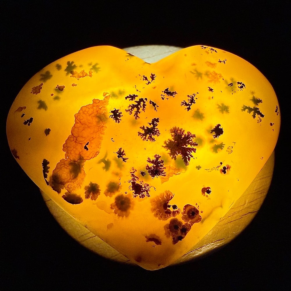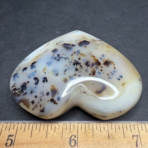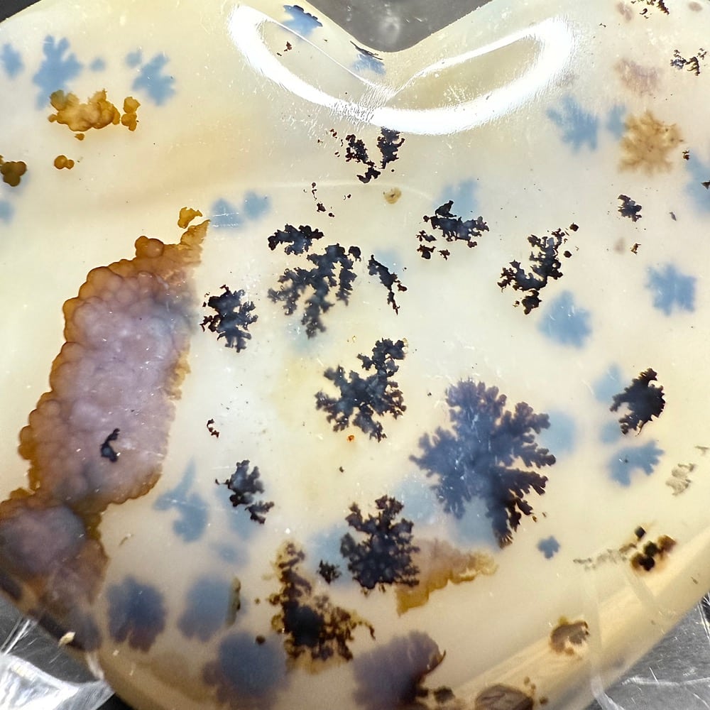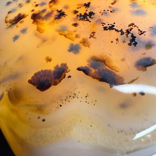 Agate from India comes in a variety of types in Blackskin, Whiteskin or Yellowskin. The most popular are those containing moss. Most of the moss agate, (called suabhaji), comes from the Bud-Kotra area in Morvi in the area around Khambat (“Camaby”) in Gujarat Province, India. They are usually found buried about 2 feet under the surface and must be dug up. When cut and finished they take an excellent polish. The agate is normally clear or clouded with inclusions of dark-green or red-brown moss.