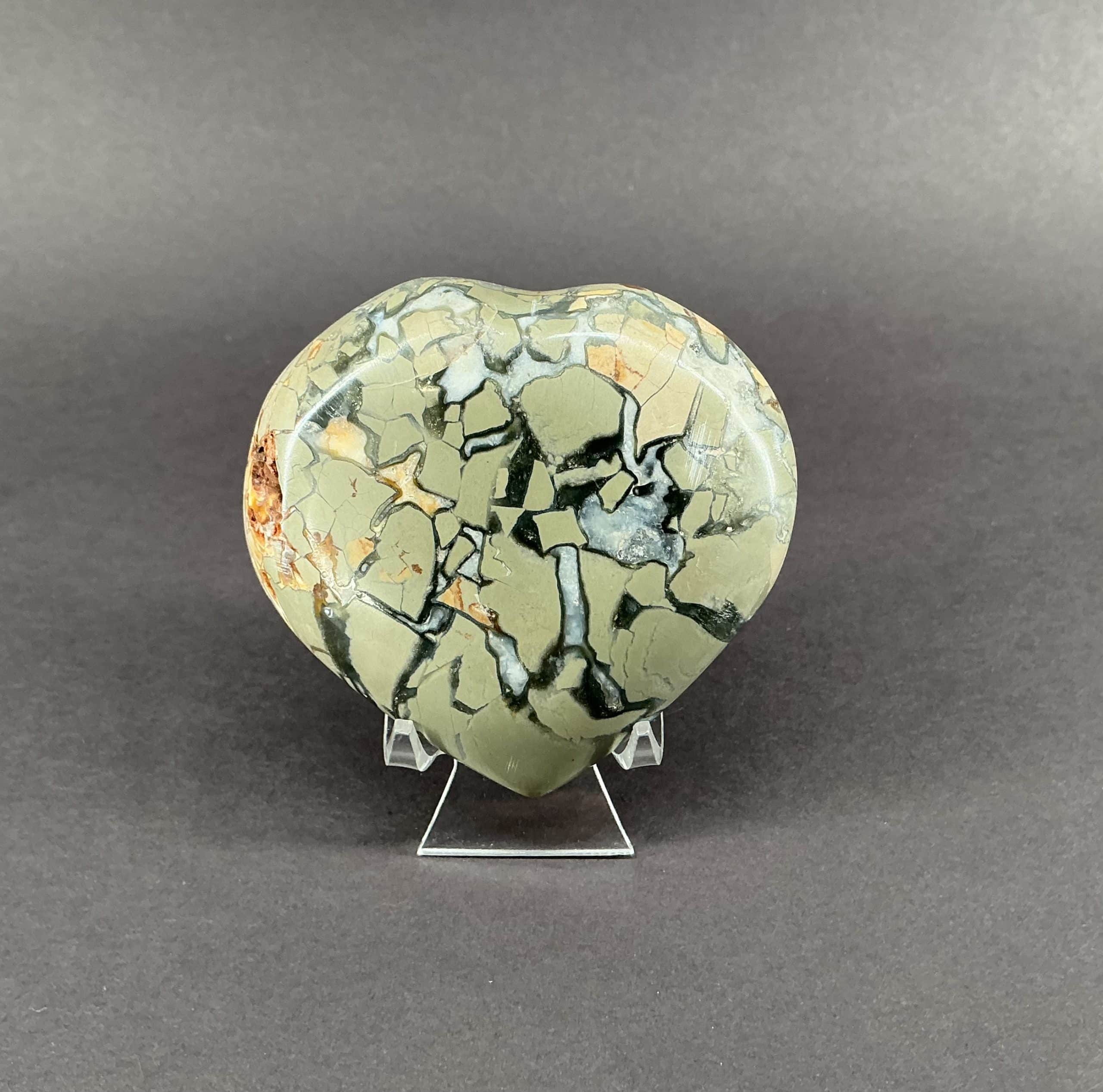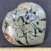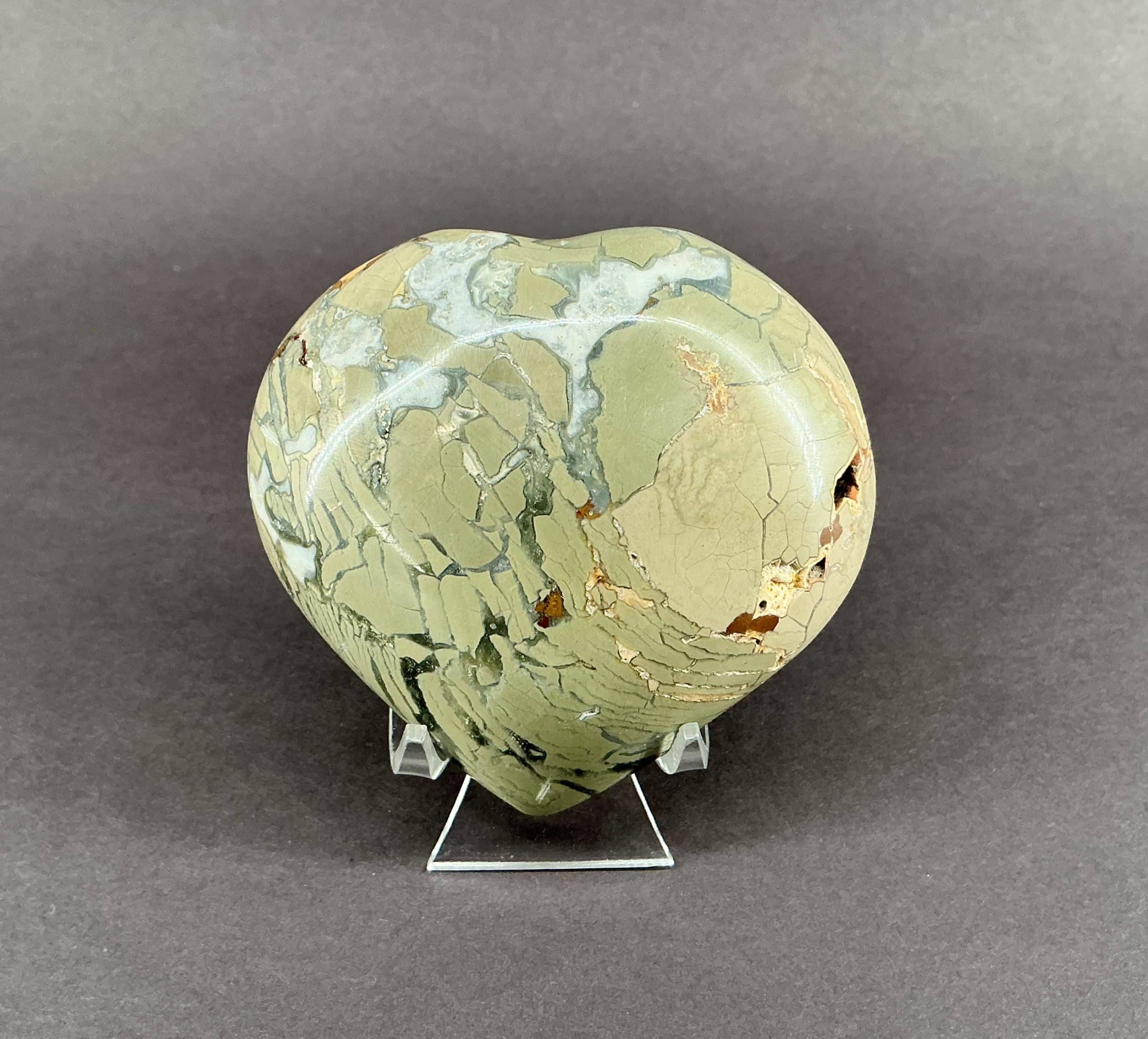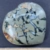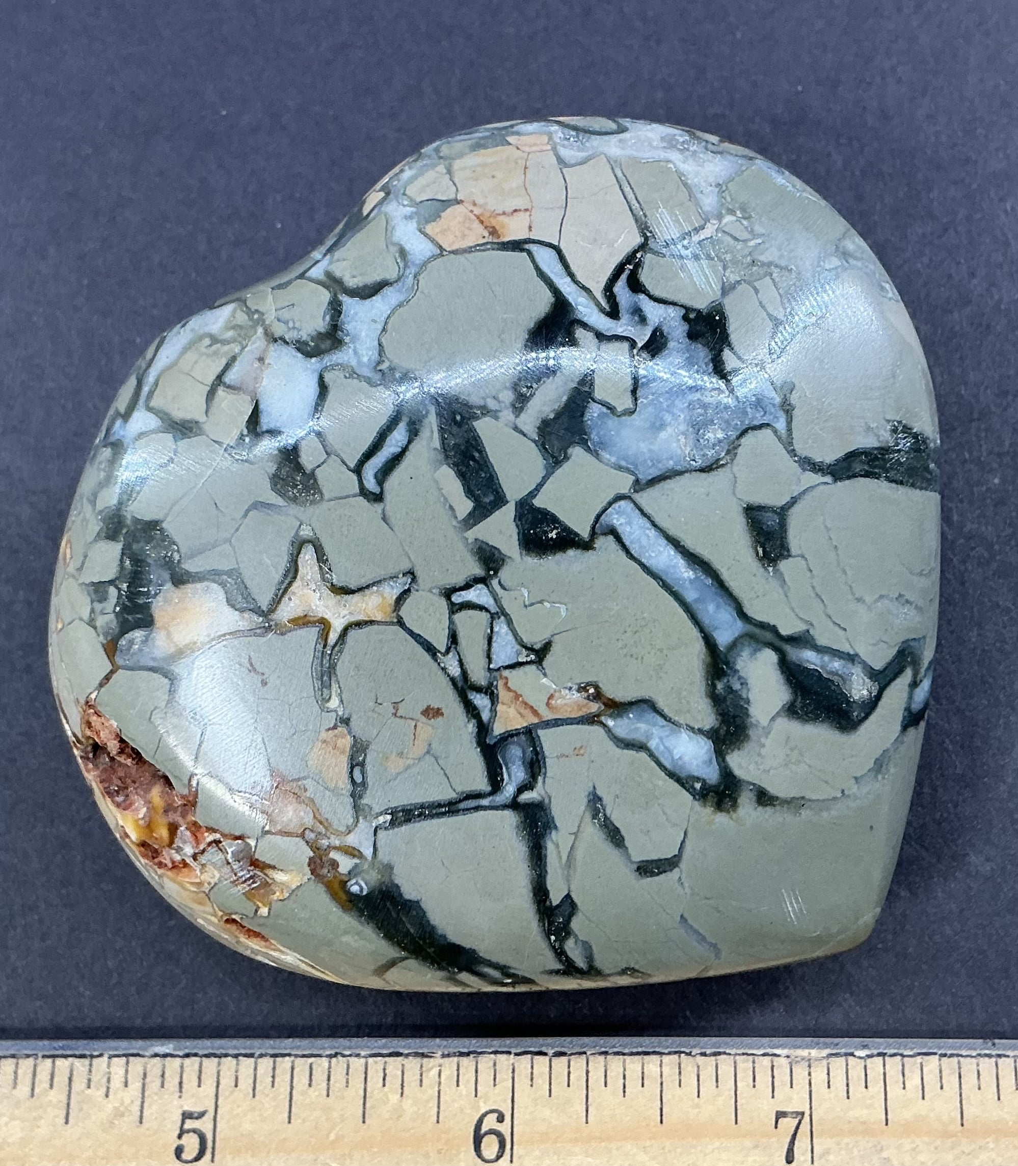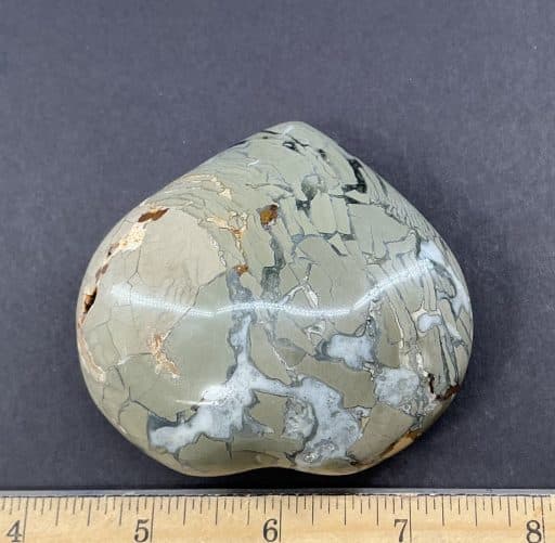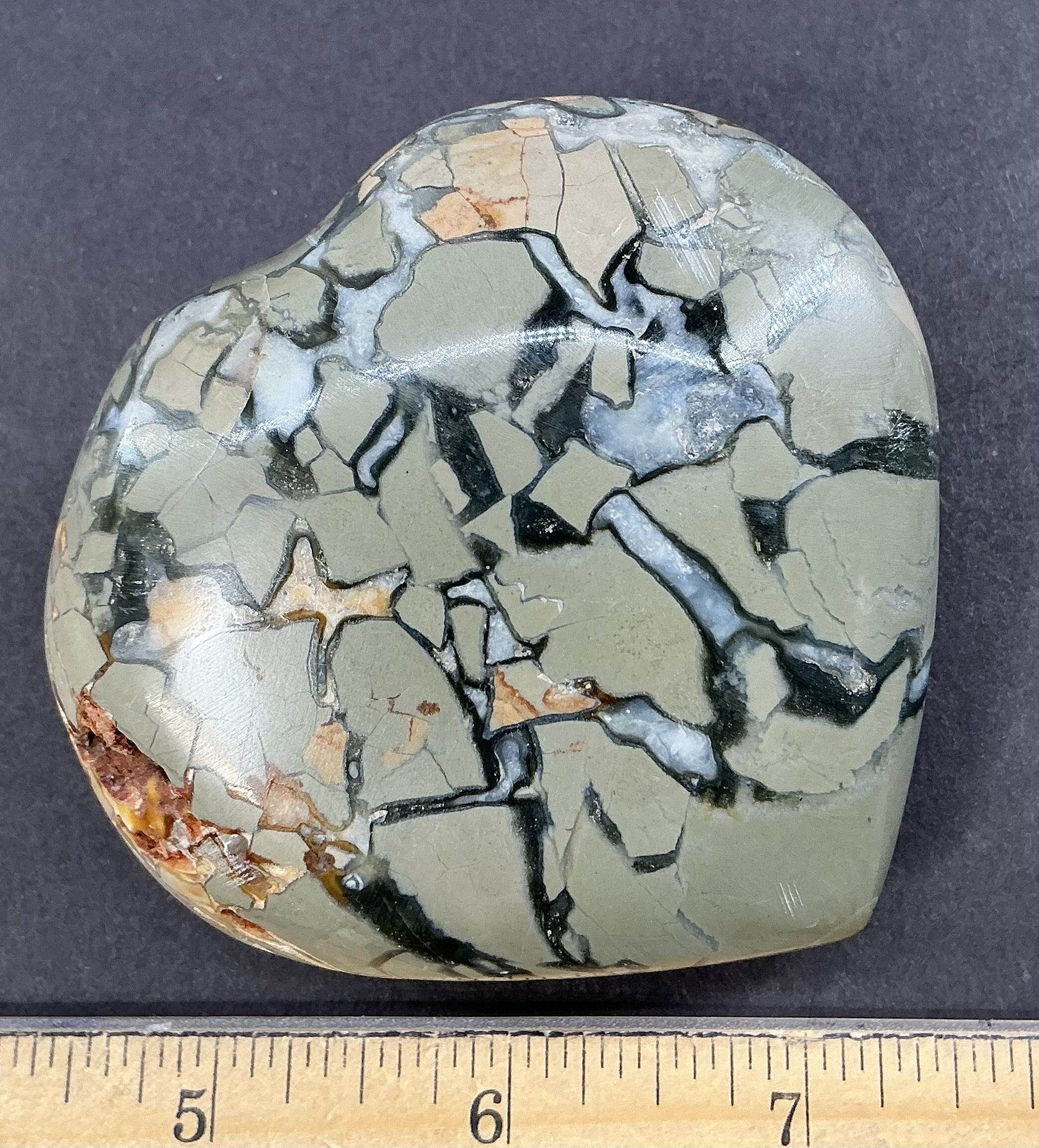 There are many types of jasper. Brecciated jasper is jasper that has been broken up internally and cemented together with chalcedony. The most common form is red or yellow jasper cemented with grey chalcedony, but there are many other color variations. The brecciation often leaves angular lines of jasper cut across the stone. Brecciated jasper can appear to be similar to breccia, a sedimentary rock composed of rock fragments in a cementing fine-grained matrix.