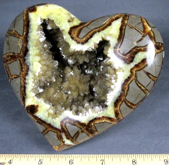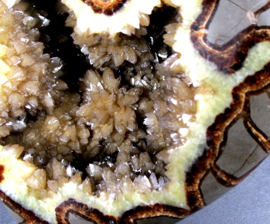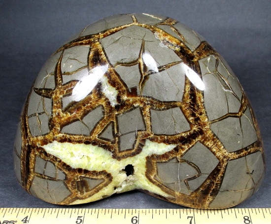 Septarian, also known as a type of Concretion, is a volume of sedimentary rock in which a mineral cement fills the porosity.  Concretions are often ovoid or spherical in shape.  They form within layers of sedimentary strata that has already been deposited.  It is composed of a Carbonate mineral such as Calcite, a Silica such as Chert, Flint or Jasper or an Iron Oxide such as Goethite or Hematite.  It is commonly found in Shale, Siltstones and Sandstones.
