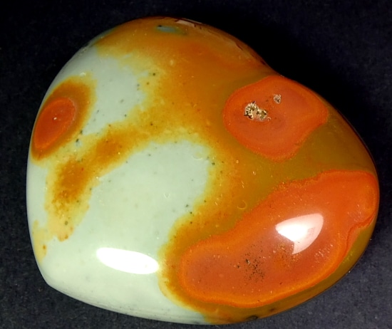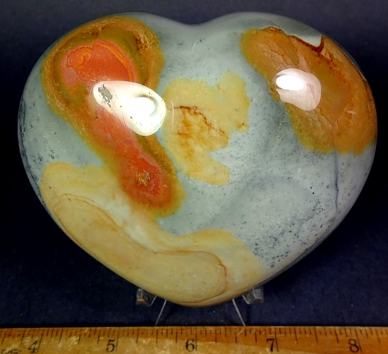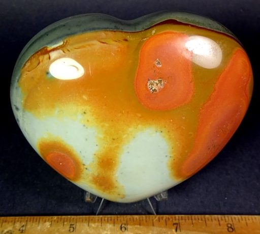 This is a pretty gemstone heart carved from Polychrome Jasper.  This gorgeous and colorful Heart measures 3 7/8″ wide x 3 3/8″ tall x 1 1/2″ thick and has a nice polish.  This is a wonderful heart that would make a great gift or a good addition to a collection.