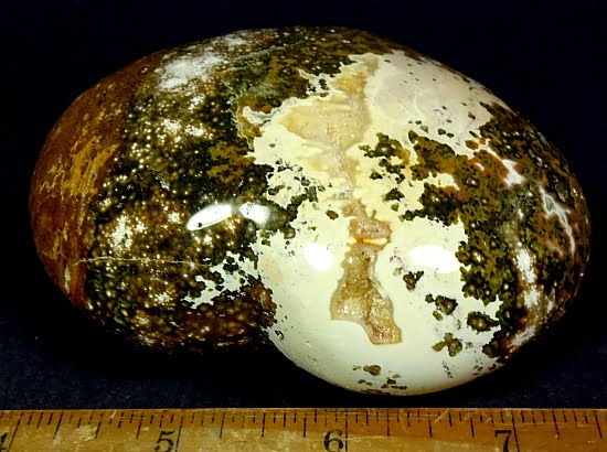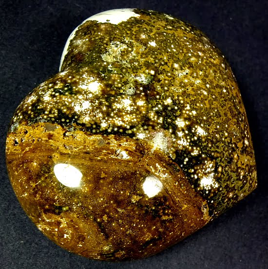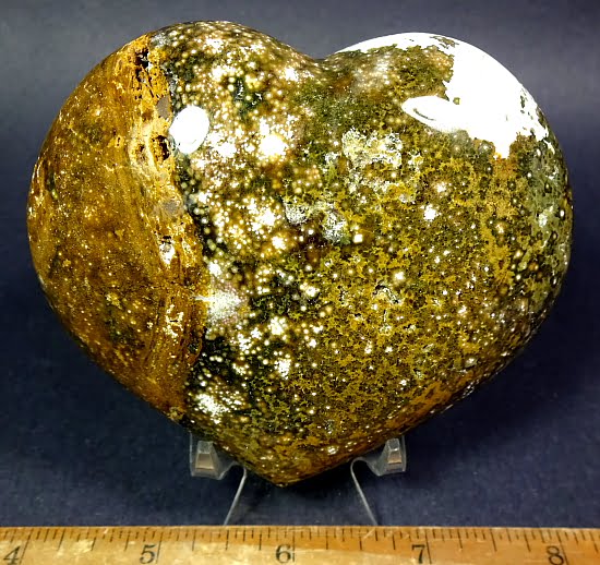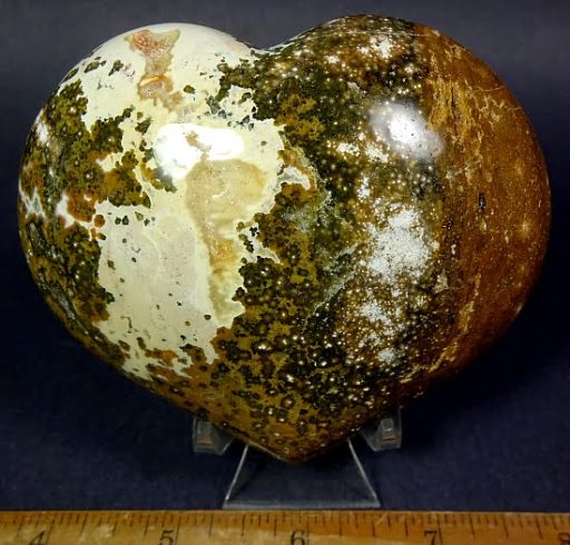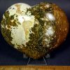 This is a very pretty and different gemstone heart carved from Sea Jasper. It measures 3 3/4″ wide x 3 1/4″ tall x 1 1/2″ thick and has a nice polish.  It has several small sparkly natural cavities scattered about with a gorgeous color scheme enhancing the overall beauty.  Something different for that special person or to add to the collection.