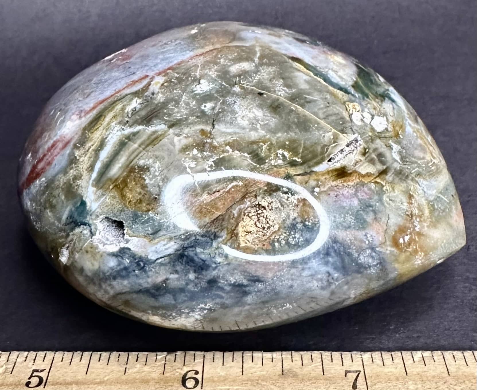 Jasper, or spotted stone, is an opaque, impure variety of Quartz that is usually red, yellow or brown in color.  Some Jaspers simultaneously exhibit several variants such as banding, flow patterns, dendrites or color variations.  This results in what appears to be scenes or images in a cut section of the Jasper.