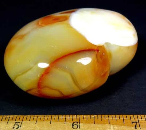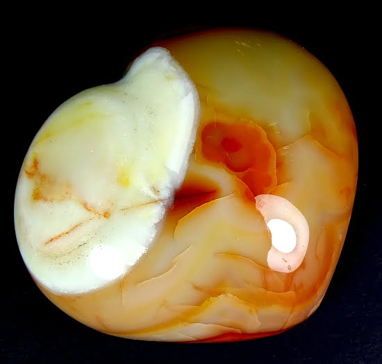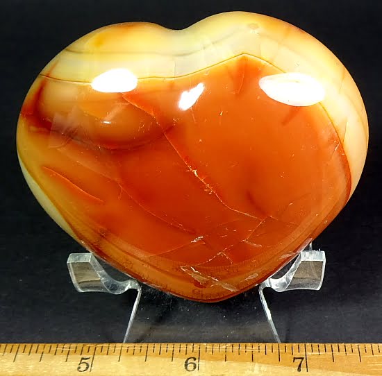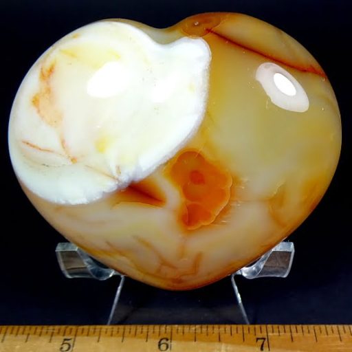 Here is an interesting and amazing find!!  A very unique Carnelian Heart with lots of character unique to this material.  This beautiful Heart measures 3″ wide x 2 5/8″ tall x  1 3/8″ thick.  This very cool  heart with darker colored Red and dark Orange accents contrasted by White and has an excellent design on each side of it.  Close inspection shows some healed fractures, common for Carnelian.  Very nice!
