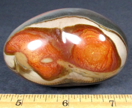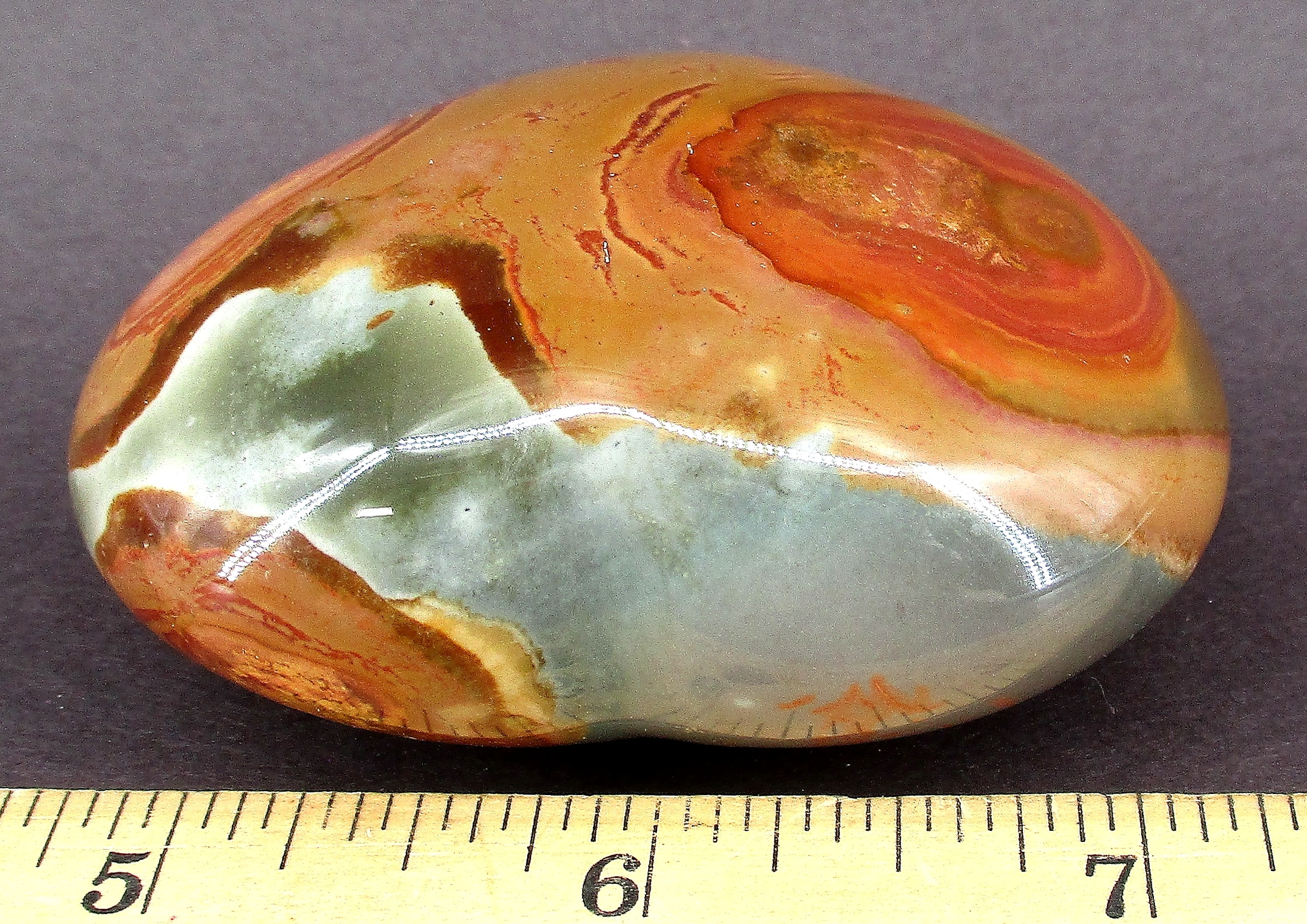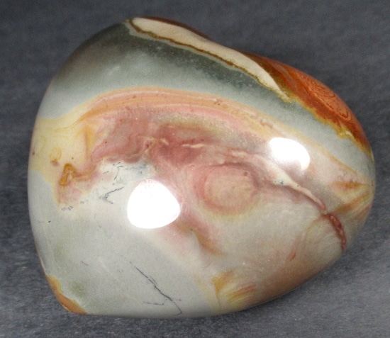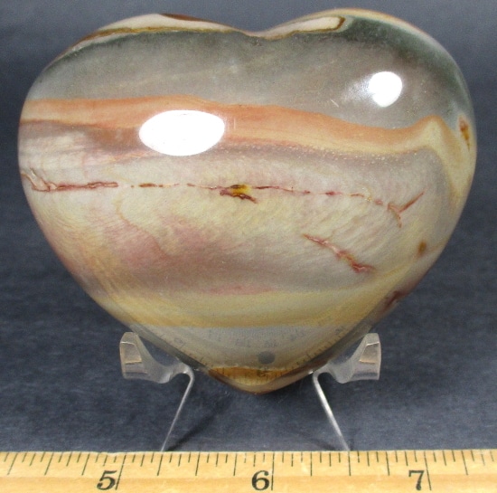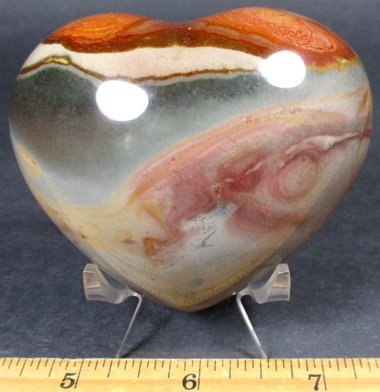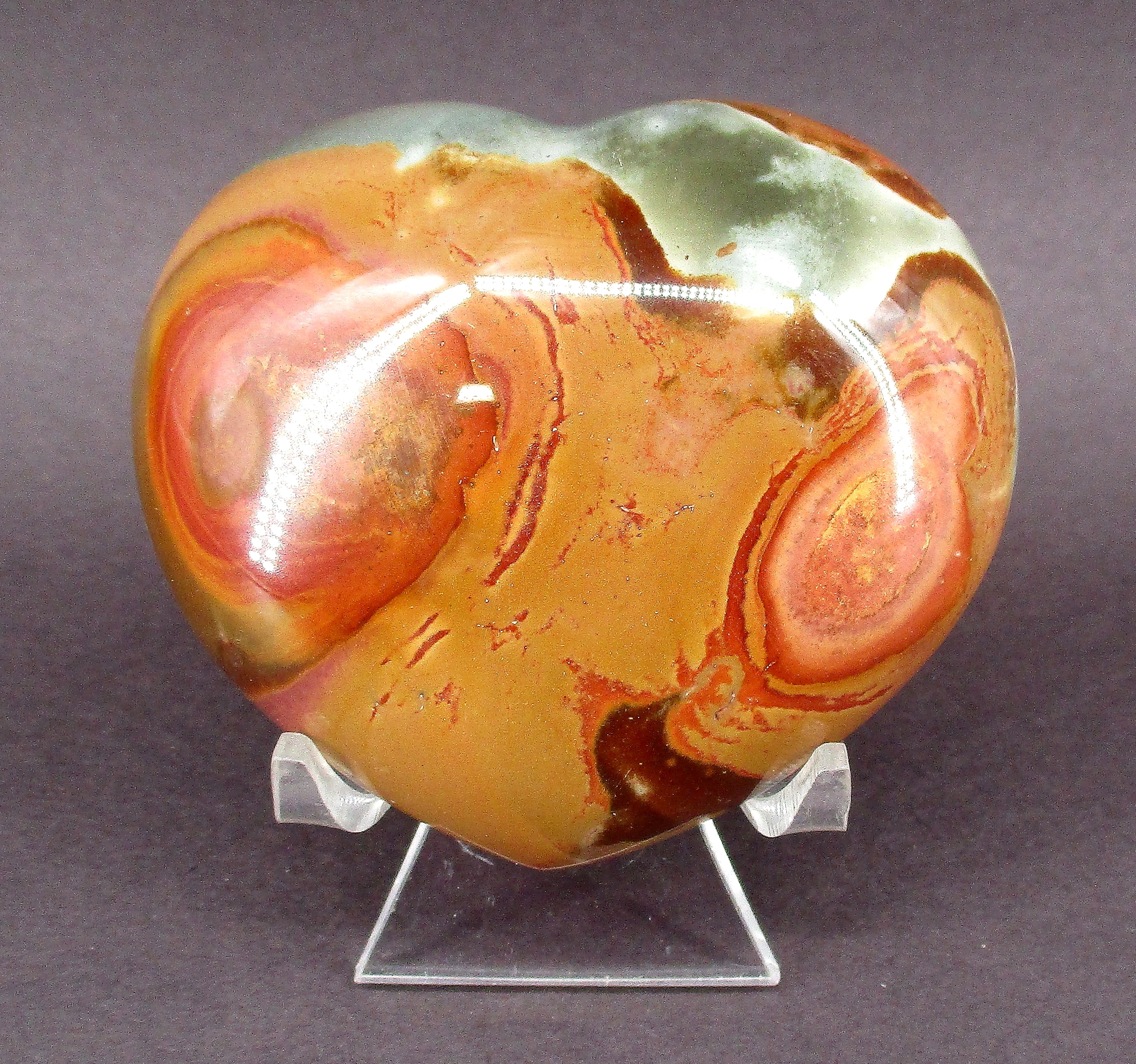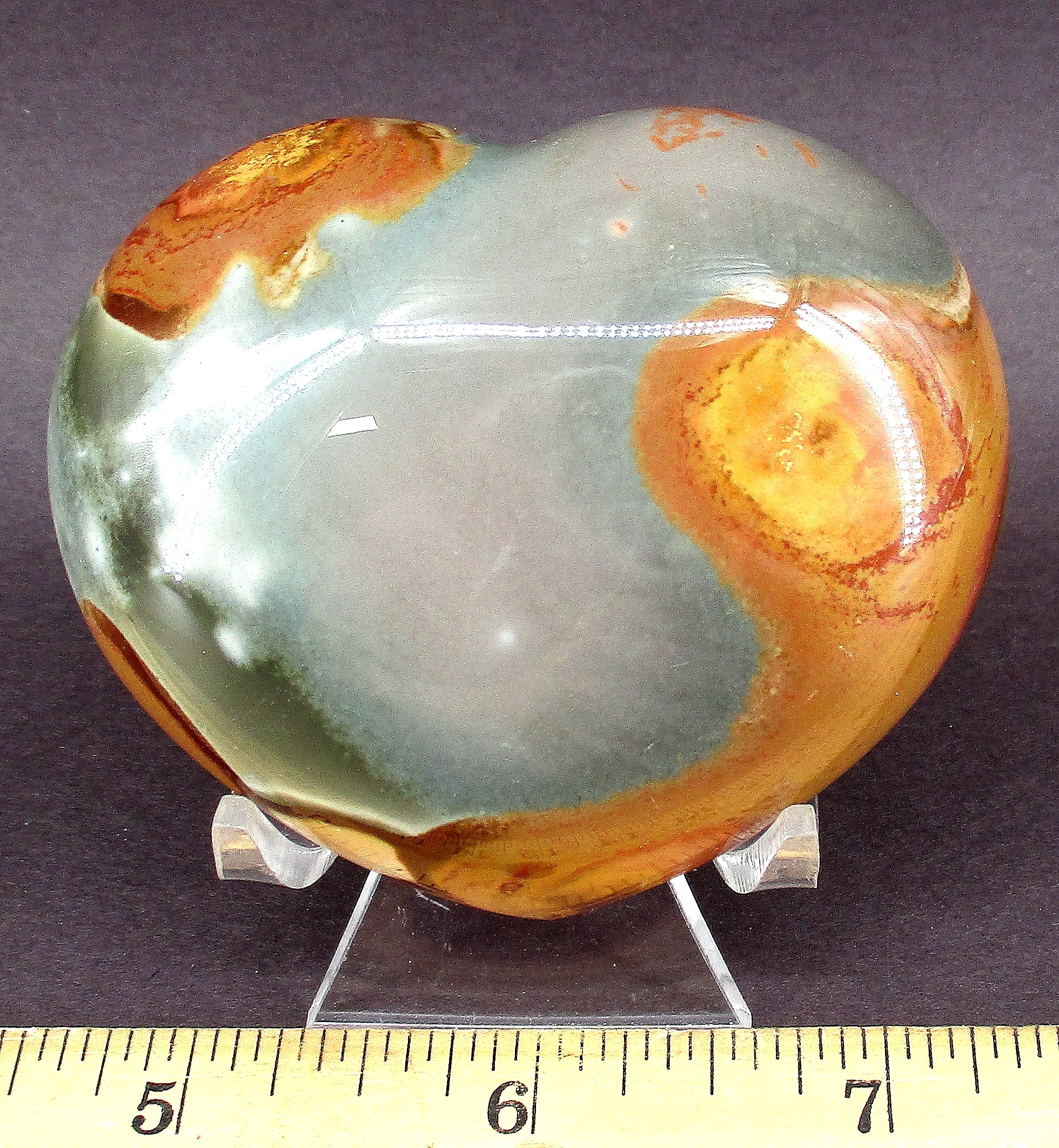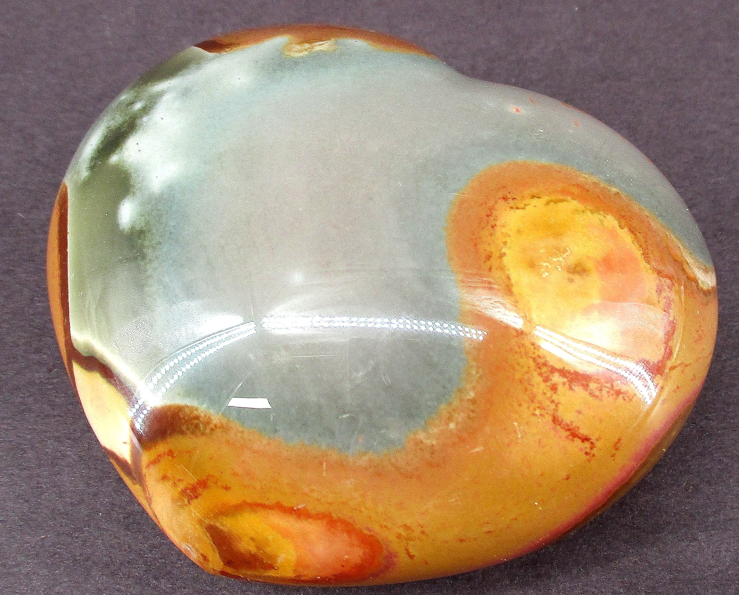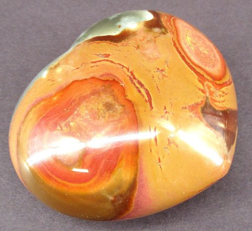 This is a pretty and very unique Poly Chrome Jasper Puff Heart.  It measures 2 1/2″ wide x 2 1/4″ tall x 1 1/4″ thick and has a nice polish.  This lovely heart has an awesome Poly Chrome design and color scheme.  Something different for that special person or to add to the collection.