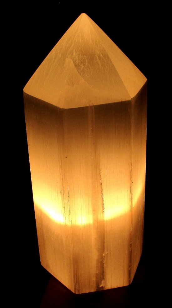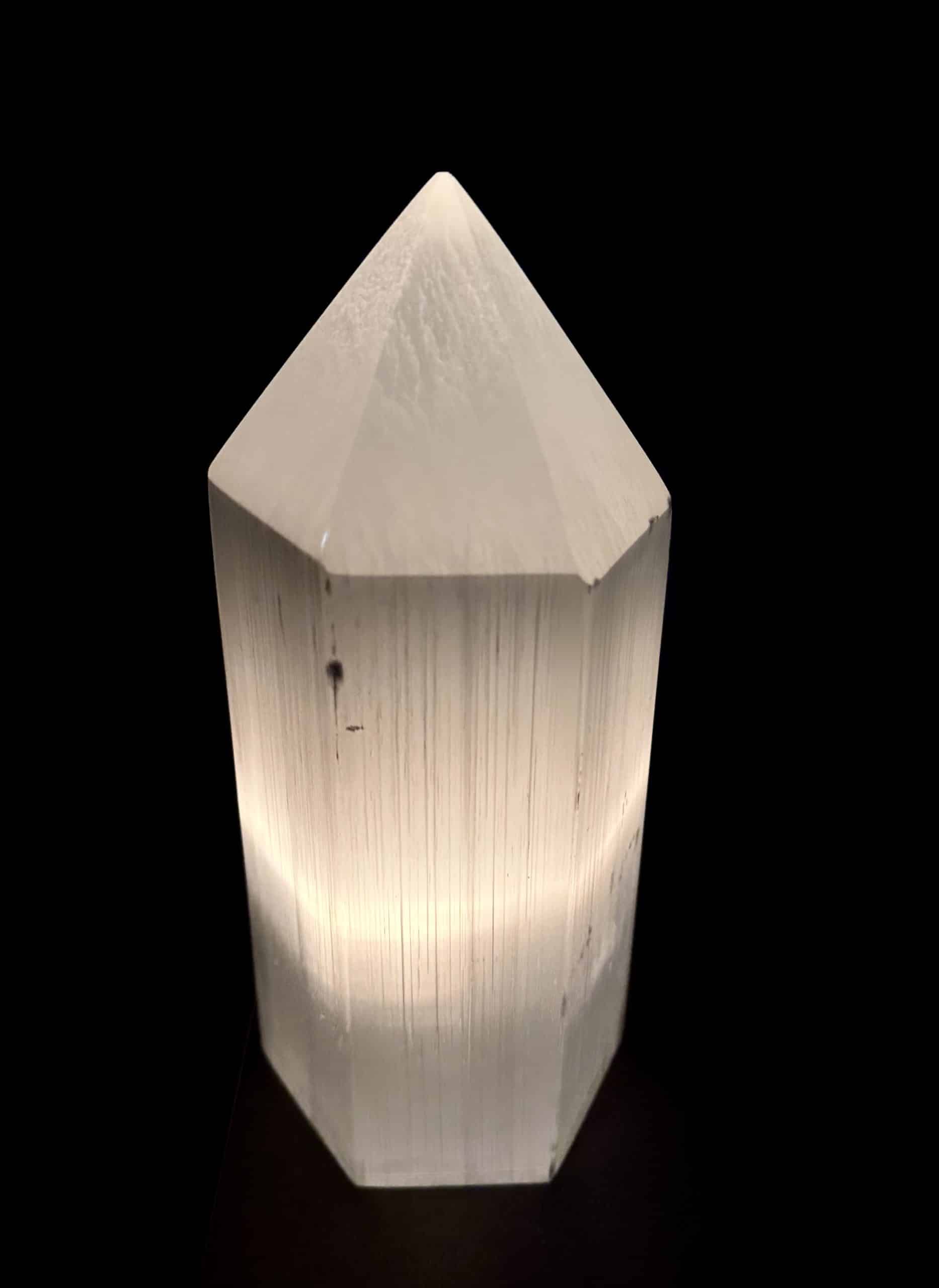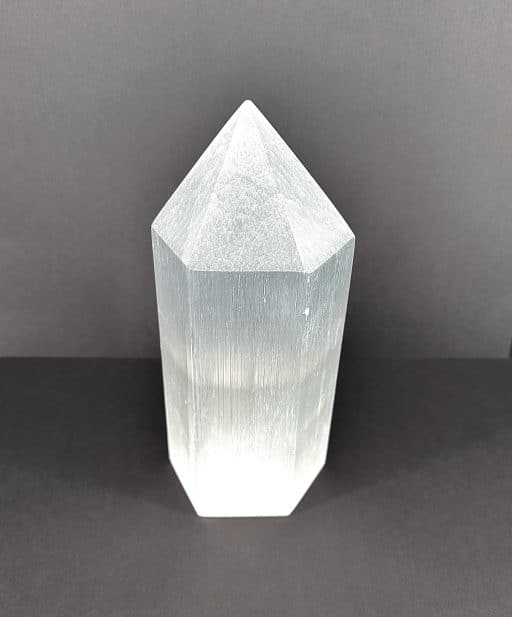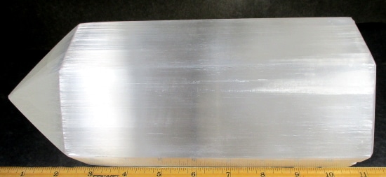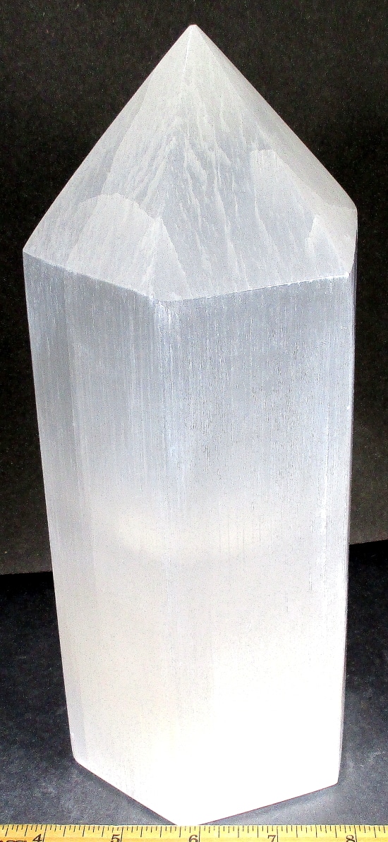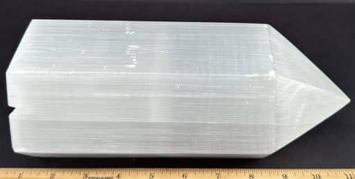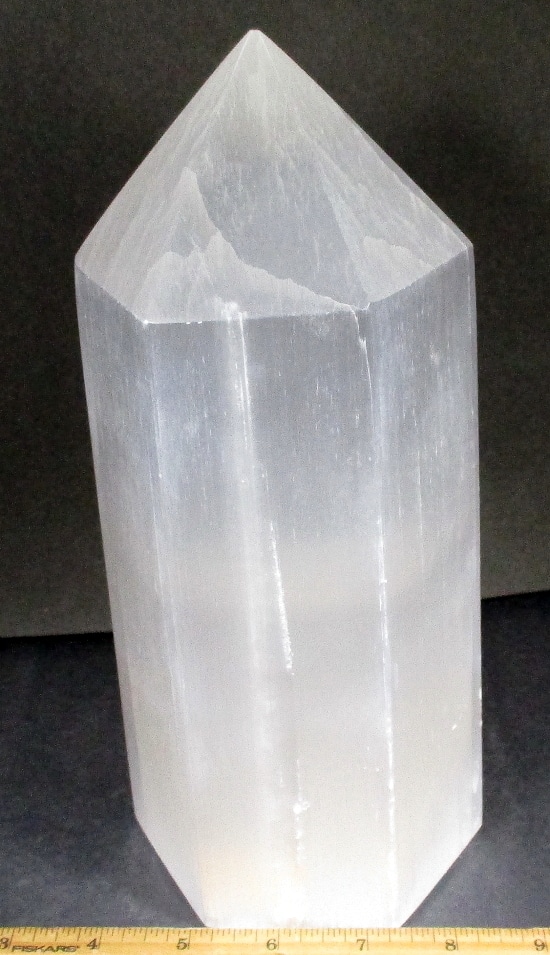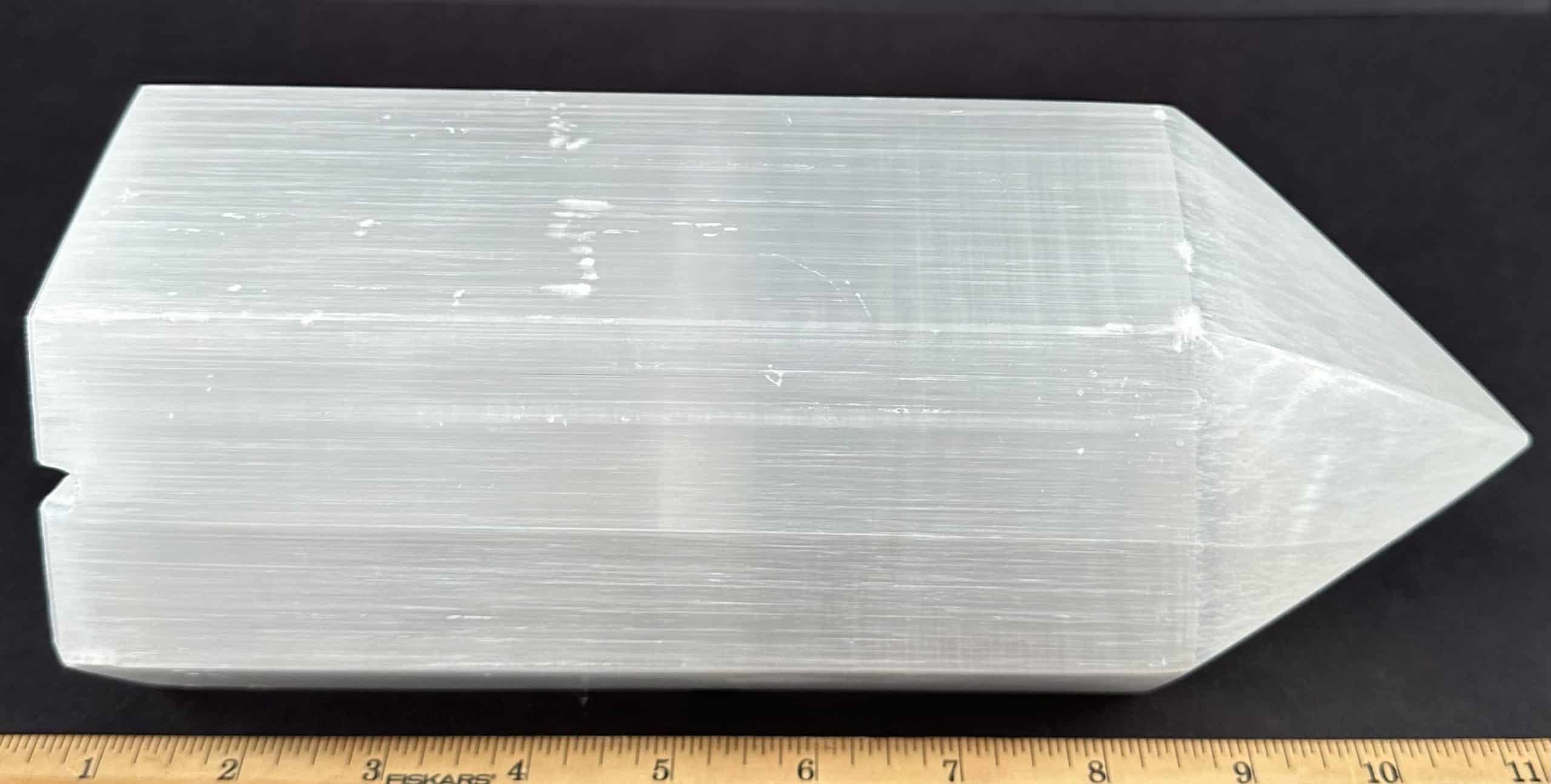Selenite is a Crystalline variety of Gypsum. It is often transparent and colorless. If the Selenite Crystals show translucency, opacity and/or color, it is caused by the presence of other minerals and many be “druzy”. Selenite often appears to have a “cat’s eye” appearance especially with the polished variety. It will often magnify images when the translucency is very clear.