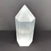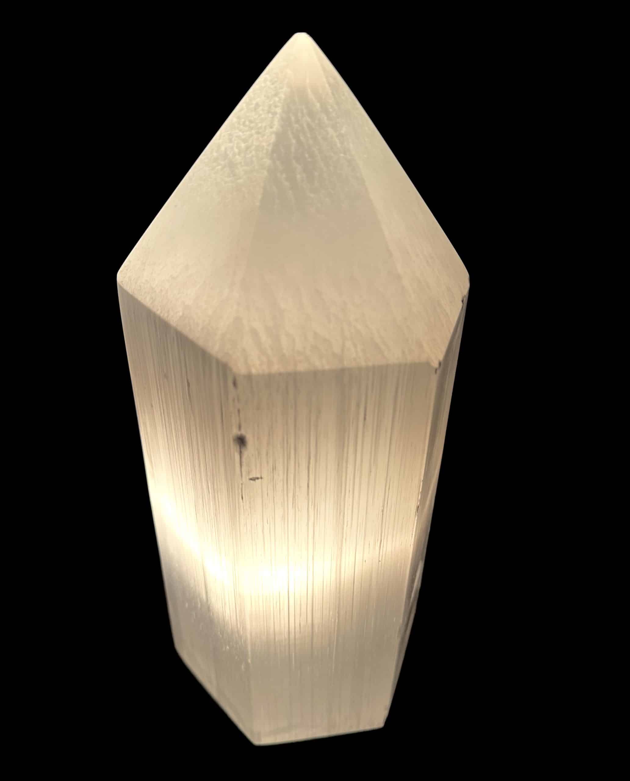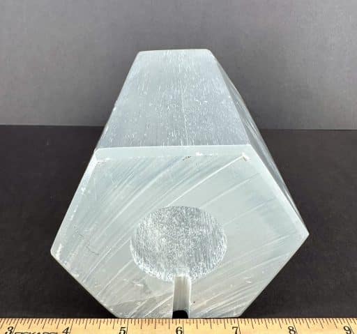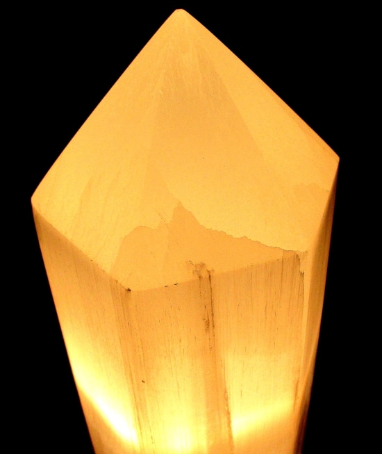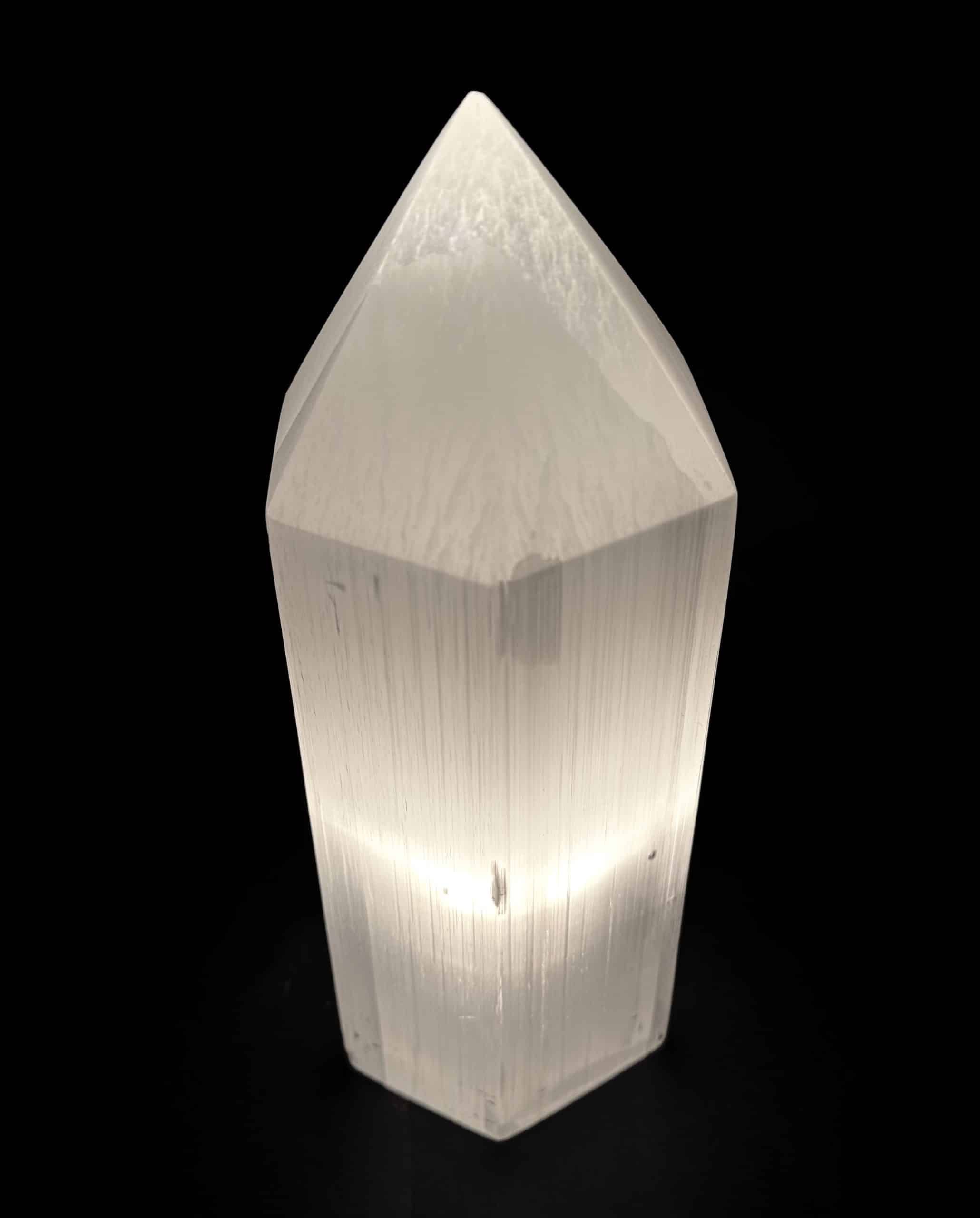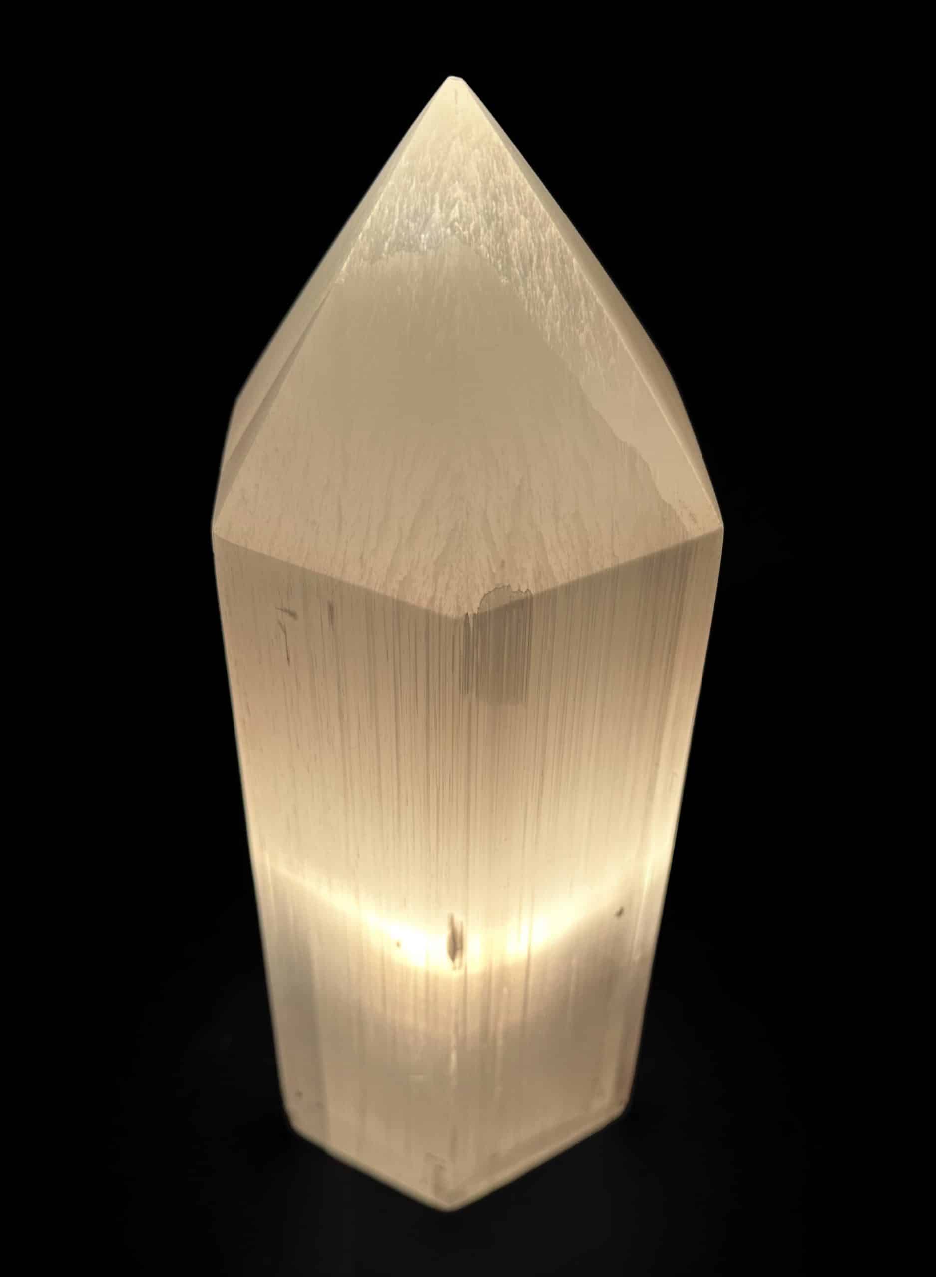 Selenite is a Crystalline variety of Gypsum. It is often transparent and colorless. If the Selenite Crystals show translucency, opacity and/or color, it is caused by the presence of other minerals and many be “druzy”. Selenite often appears to have a “cat’s eye” appearance especially with the polished variety. It will often magnify images when the translucency is very clear.