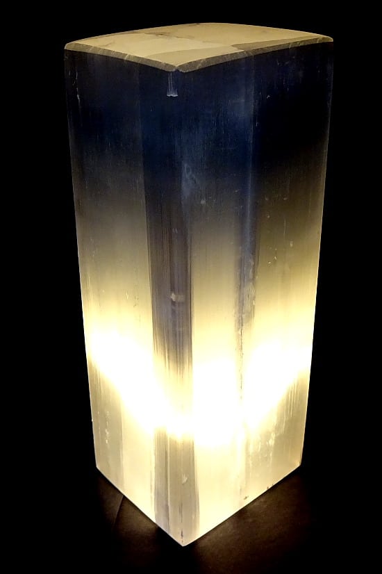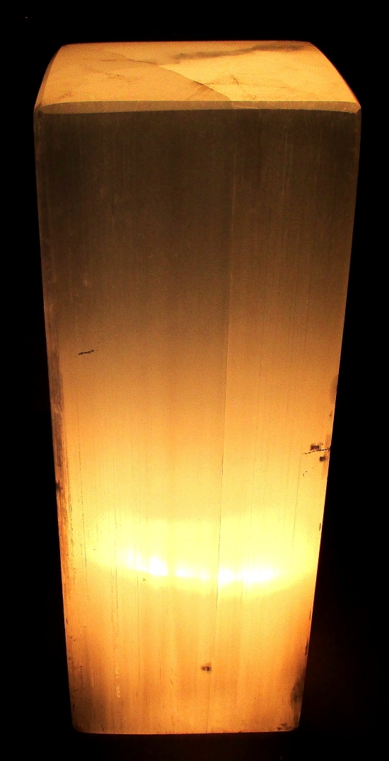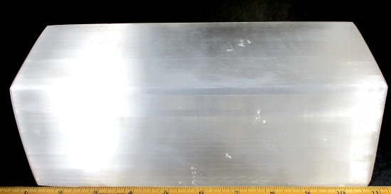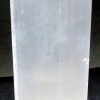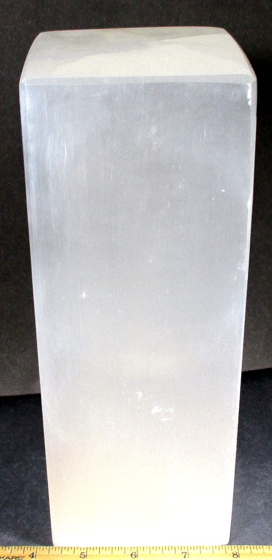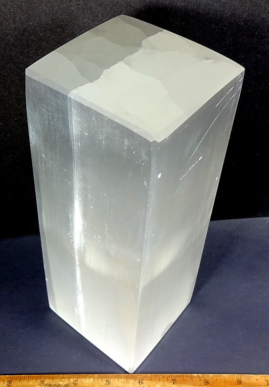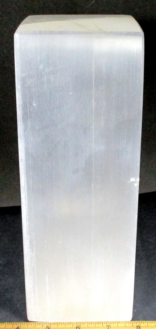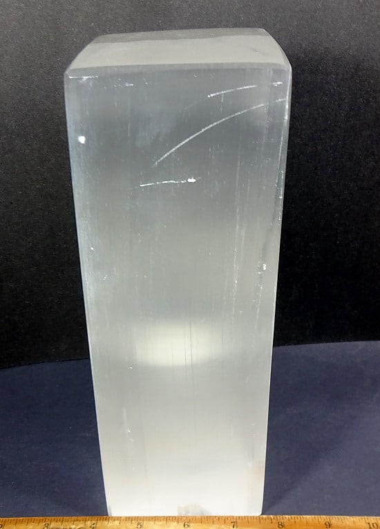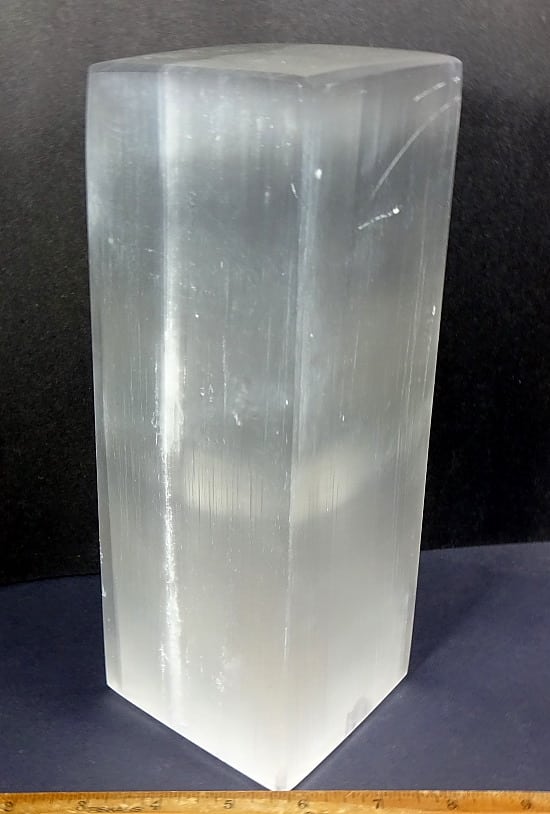 Selenite is a Crystalline variety of Gypsum. It is often transparent and colorless. If the Selenite Crystals show translucency, opacity and/or color, it is caused by the presence of other minerals and many be “druzy”. Selenite often appears to have a “cat’s eye” appearance especially with the polished variety. It will often magnify images when the translucency is very clear.