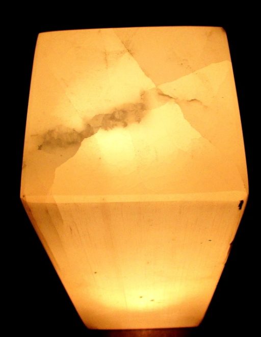 Here is a very nice, above average quality Selenite lamp.  This pretty lamp measures 3 1/2″ x 3 1/2″ wide x 9 7/8″ tall; weighs nearly 9 3/4 pounds and has a nice, polished exterior.  This magnificent lamp displays nicely and comes with a light and cord. The photo shows the light as more yellow when lit up but it’s really white.
