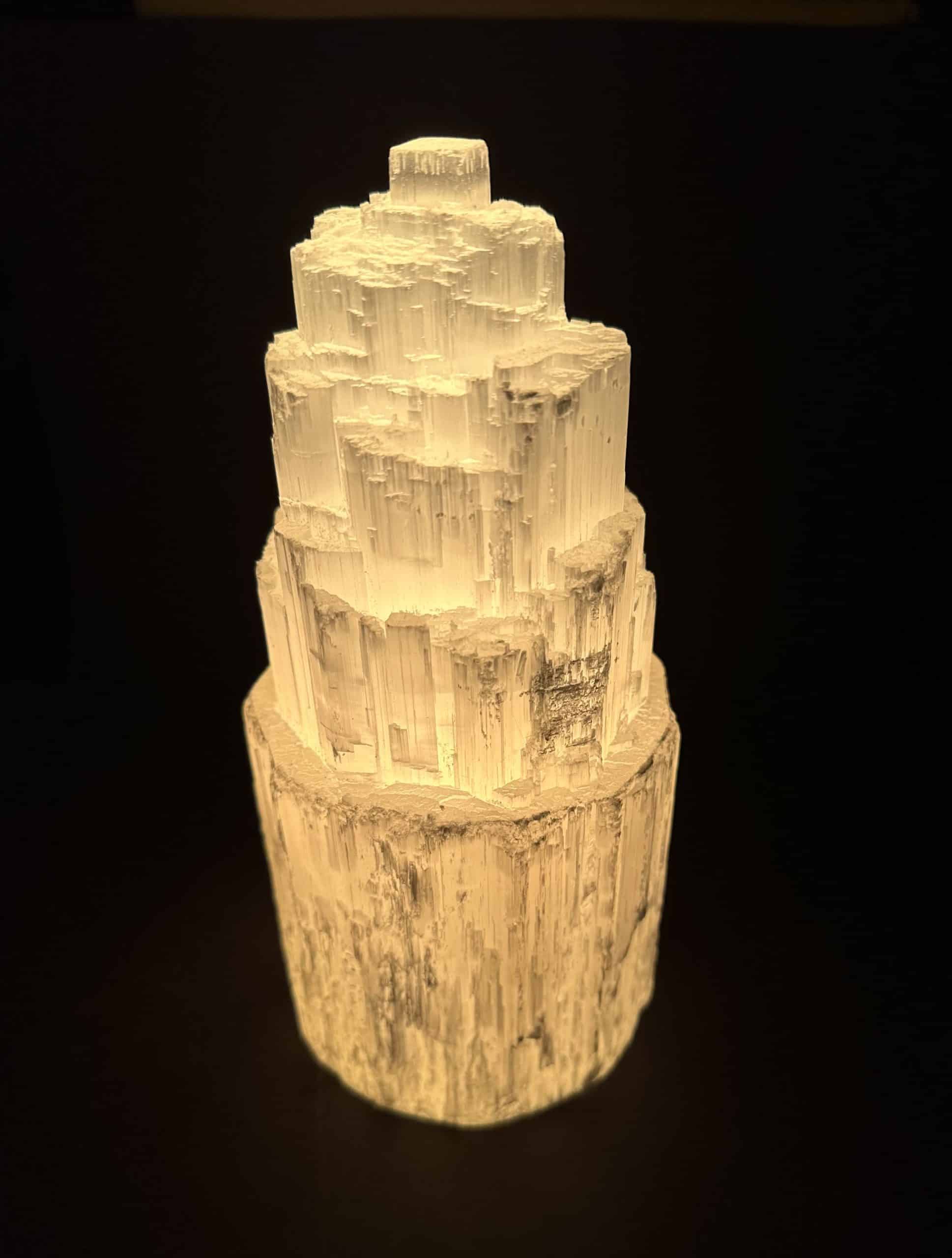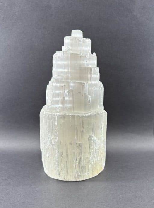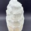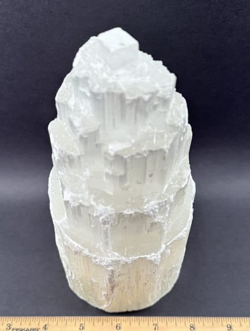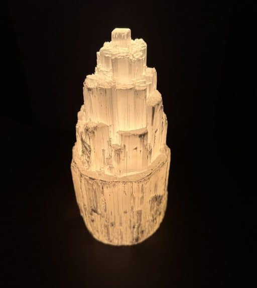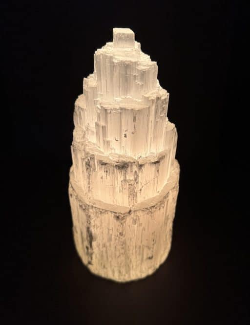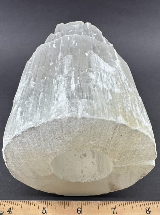 Selenite is a Crystalline variety of Gypsum. It is often transparent and colorless. If the Selenite Crystals show translucency, opacity and/or color, it is caused by the presence of other minerals and many be “druzy”. Selenite often appears to have a “cat’s eye” appearance especially with the polished variety. It will often magnify images when the translucency is very clear. An all time favorite at the Rock Shop