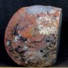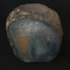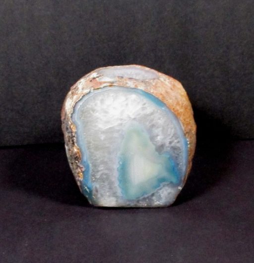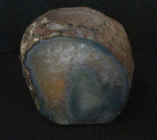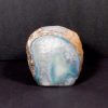 This is a pretty Teal (color enhanced) Brazilian Agate Candle Holder.  It measures 3 1/2″ wide x 3 1/4″ x 3 3/8″ tall and weighs over 2 pounds.  This nice light has a rough exterior with a beautiful, polished agate center in a fabulous design. It has a small chip on the top which is common for this material and has been reflected in the reduced price. Nice!