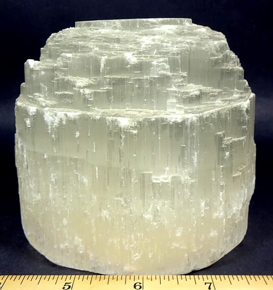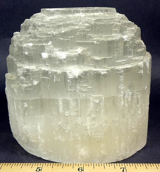 Selenite is a Crystalline variety of Gypsum.  It is often transparent and colorless.  If the Selenite Crystals show translucency, opacity and/or color, it is caused by the presence of other minerals and many be “druzy”.  Selenite often appears to have a “cat’s eye” appearance especially with the polished variety.  It will often magnify images when the translucency is very clear.