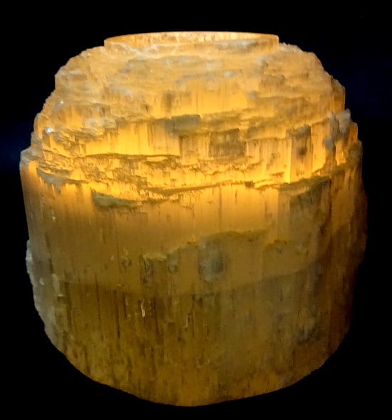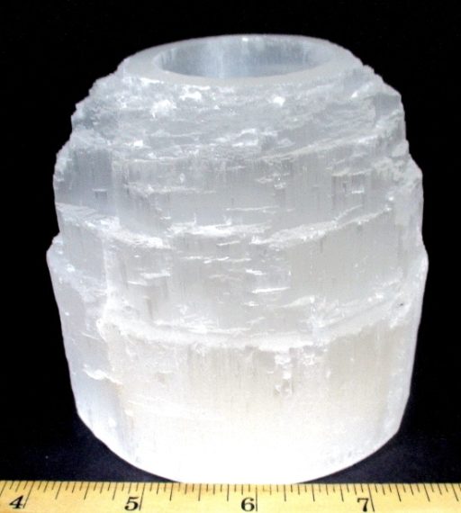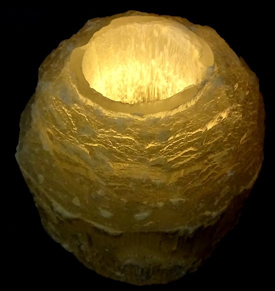 Here is a beautiful, above average quality Selenite Tea Light Candle holder.  It measures 3 5/8″ x 3 1/2″ and has a natural, rough textured exterior.  A great gift for that special person.