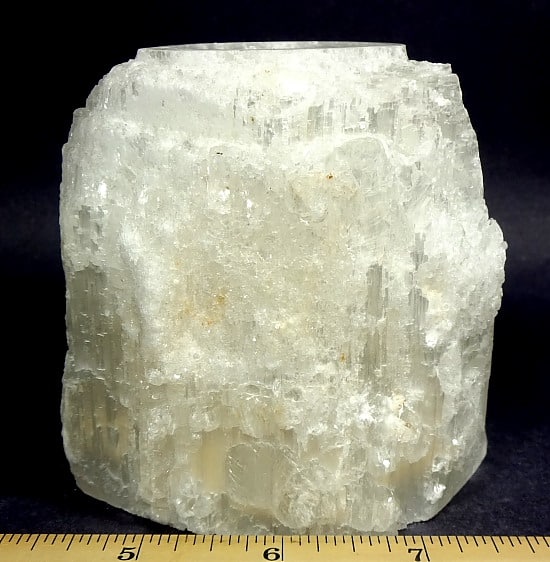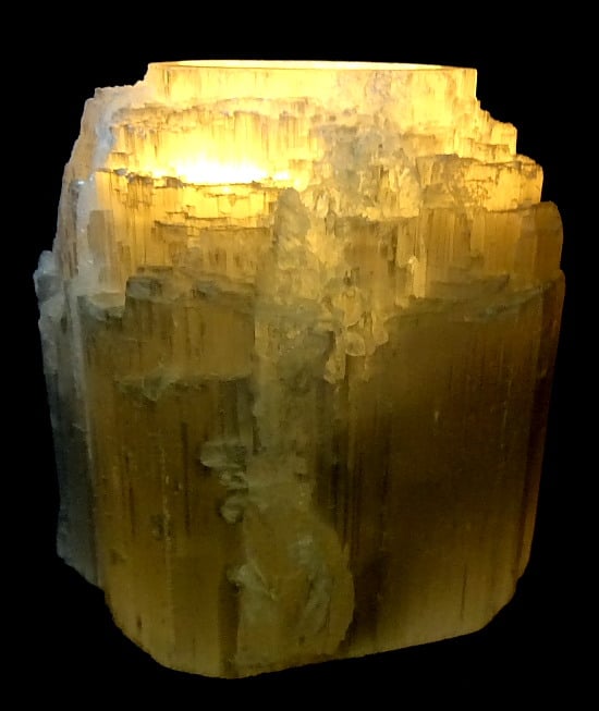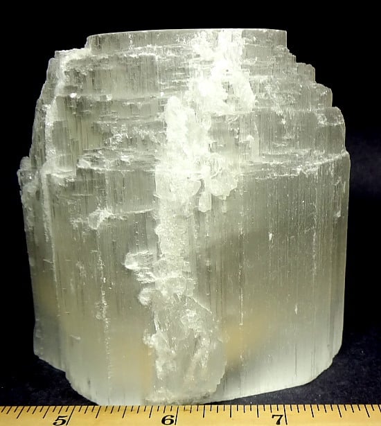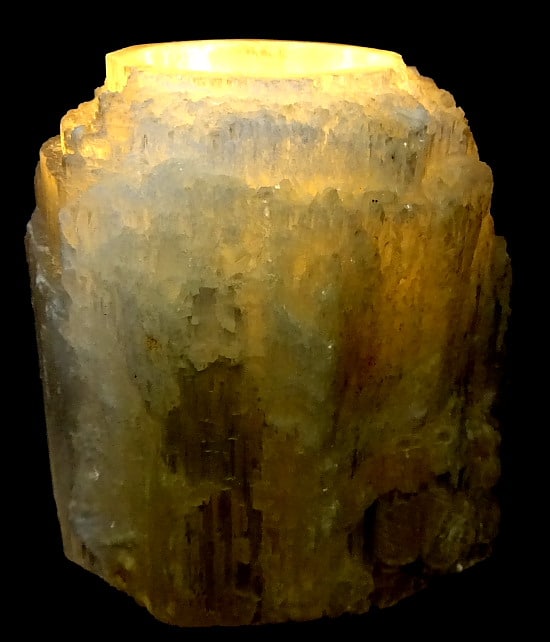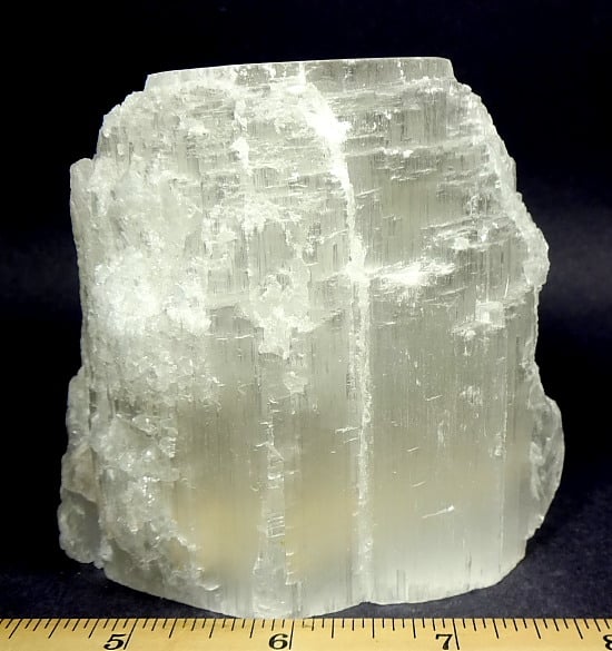 Selenite is a Crystalline variety of Gypsum. It is often transparent and colorless. If the Selenite Crystals show translucency, opacity and/or color, it is caused by the presence of other minerals, and many be “druzy”. Selenite often appears to have a “cat’s eye” appearance especially with the polished variety. It will often magnify images when the translucency is very clear.