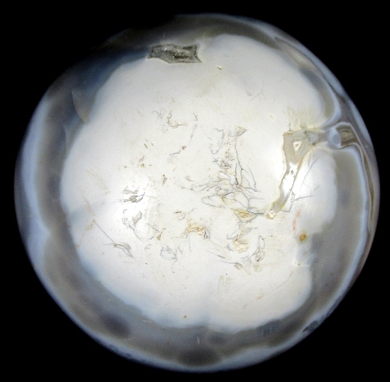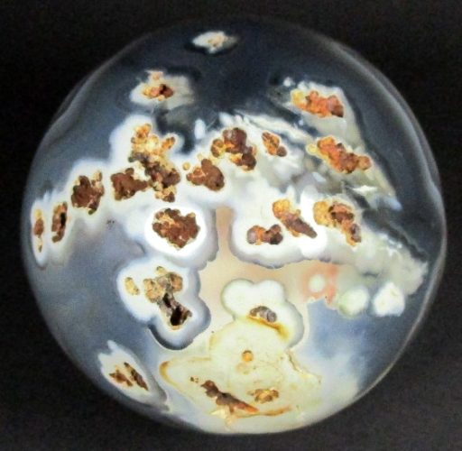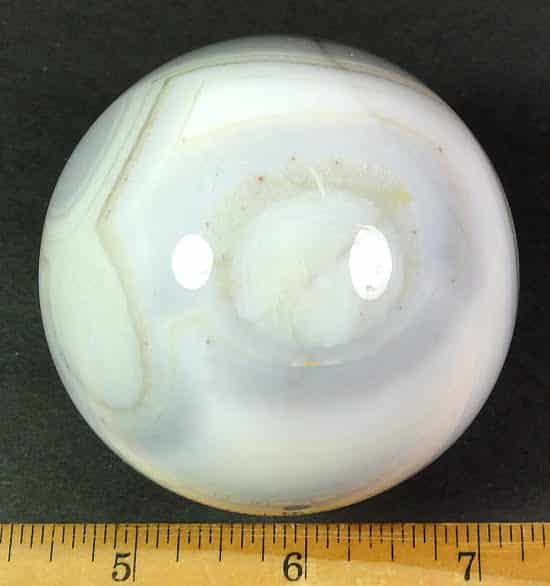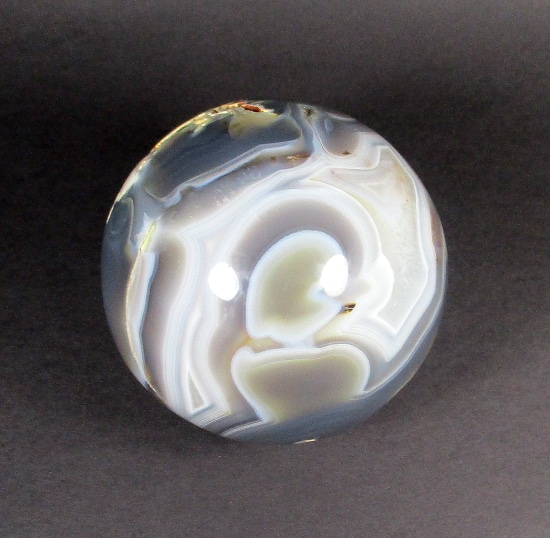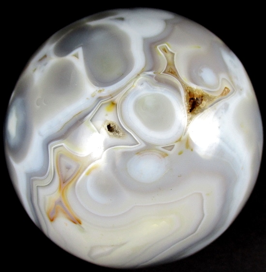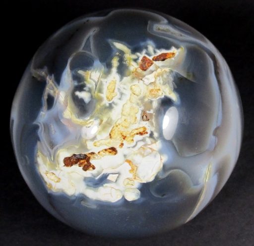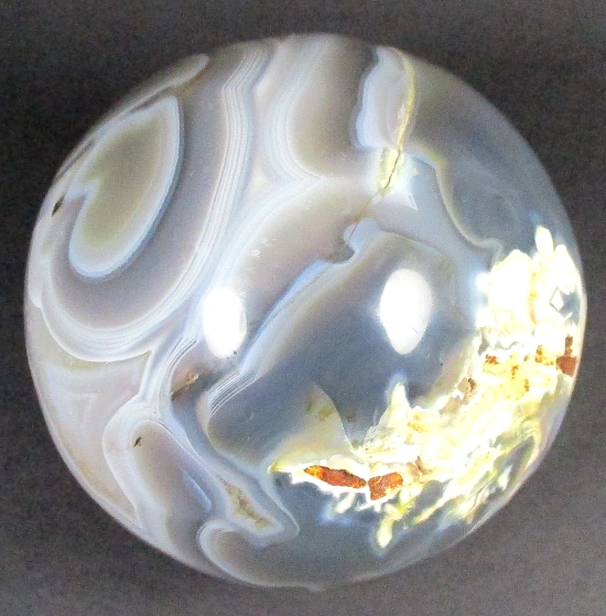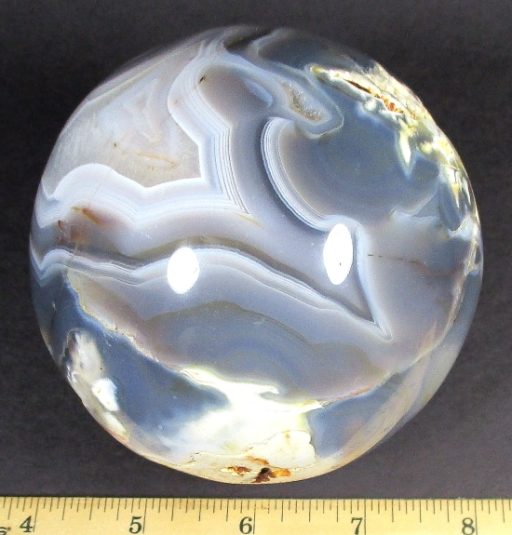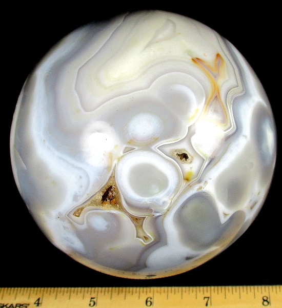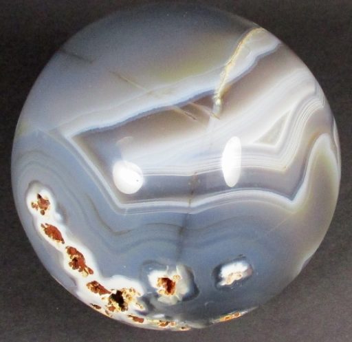 Here is a lovely Agate sphere from Madagascar.  This pretty sphere measures 3 3/8″ and has a nice polish.  There is lots of nice Agate banding around the entirety in a nice design as well as unusual cavities and dazzling crystal. A very unique sphere for your collection. Grab one while you can.