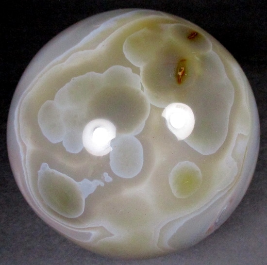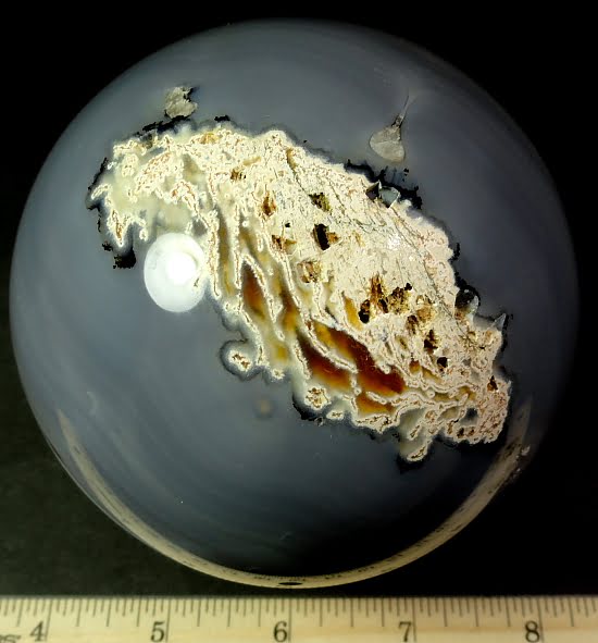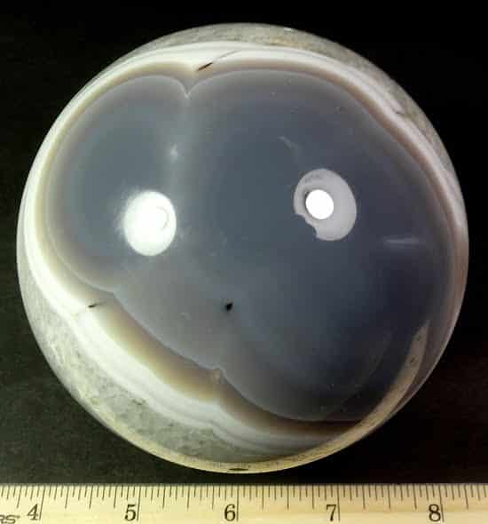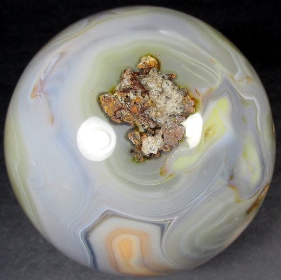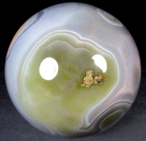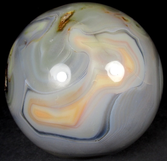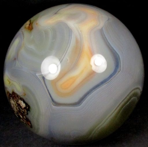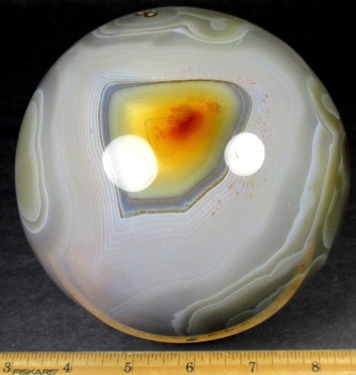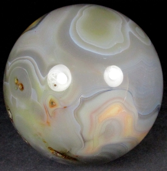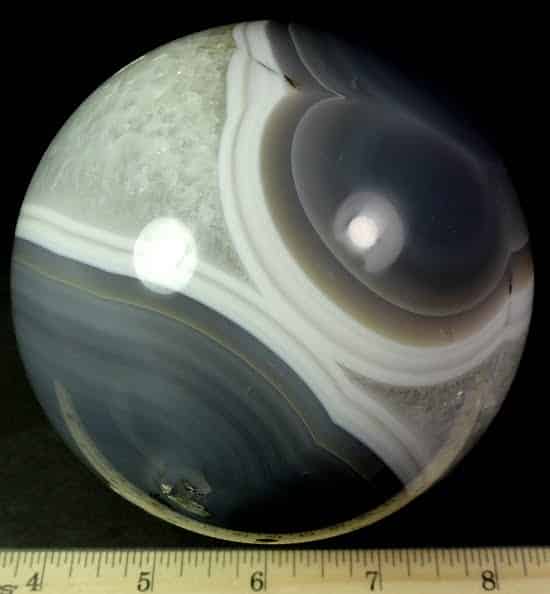 Here is an exceptional, good quality Agate sphere from Madagascar.  It measures 4 1/2″ in diameter weighs over 4 1/2 pounds and has a nice polish. This sphere has fantastic banding, eye catching colors and fabulous design. A one-of-a-kind sphere!