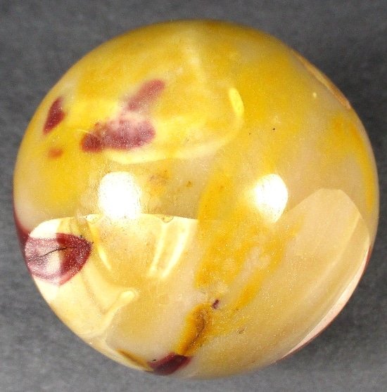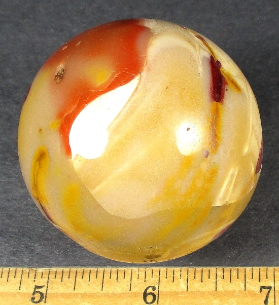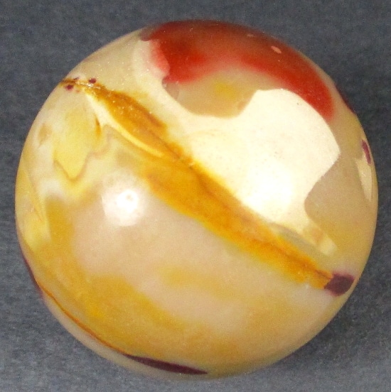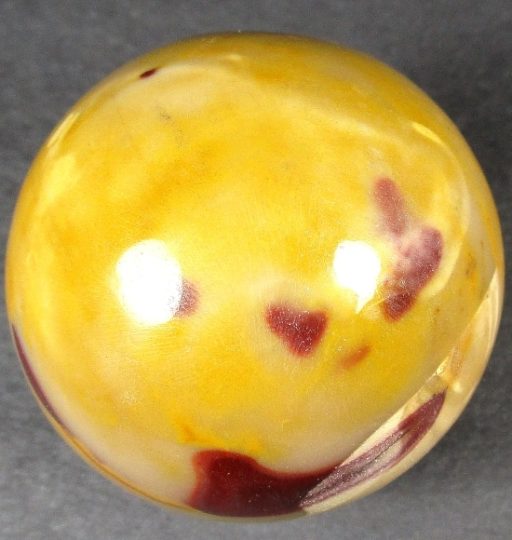 This is a very nice  Mookaite Jasper sphere from Australia.  This sphere measures 1 7/8″ and has a good polish.  This nice sphere has lovely, interesting, brilliant colors and pastel in a very different design. It has been hand polished so is a bit lumpy. A great little sphere!