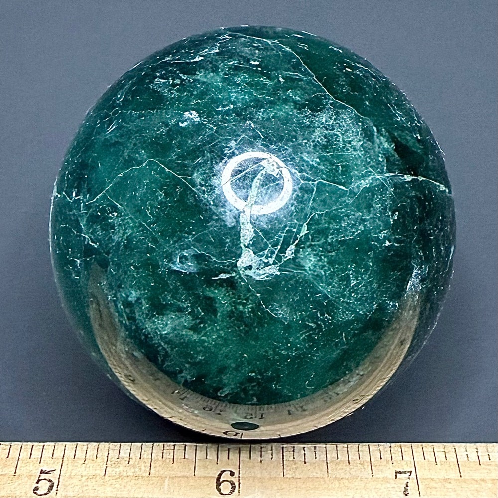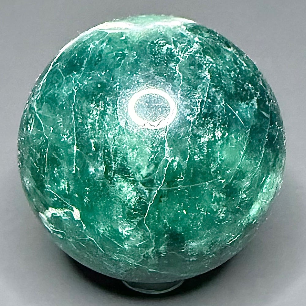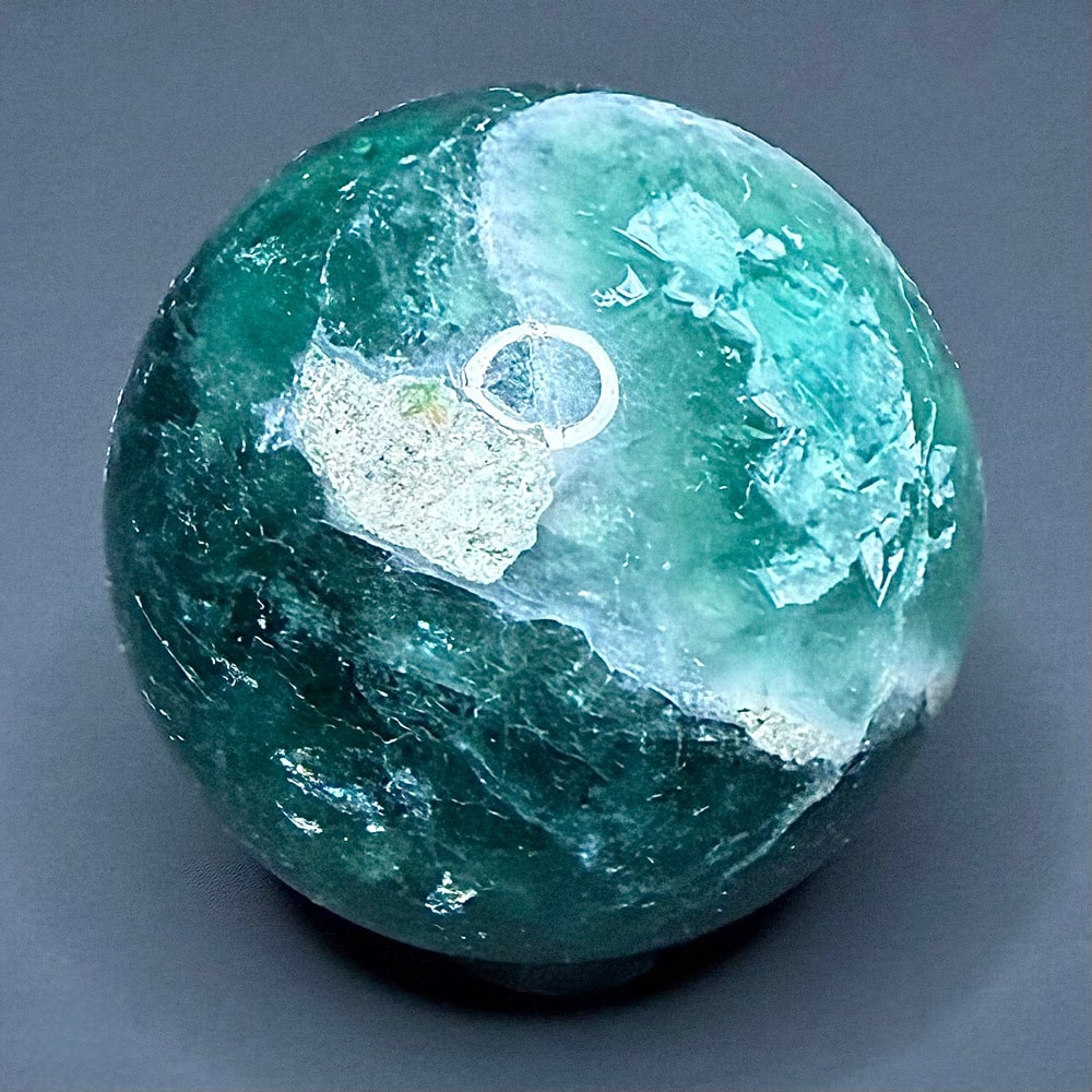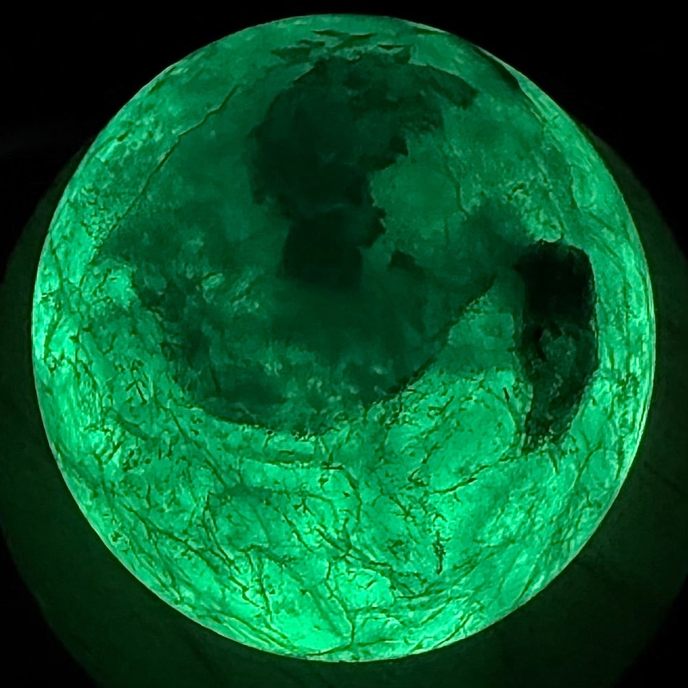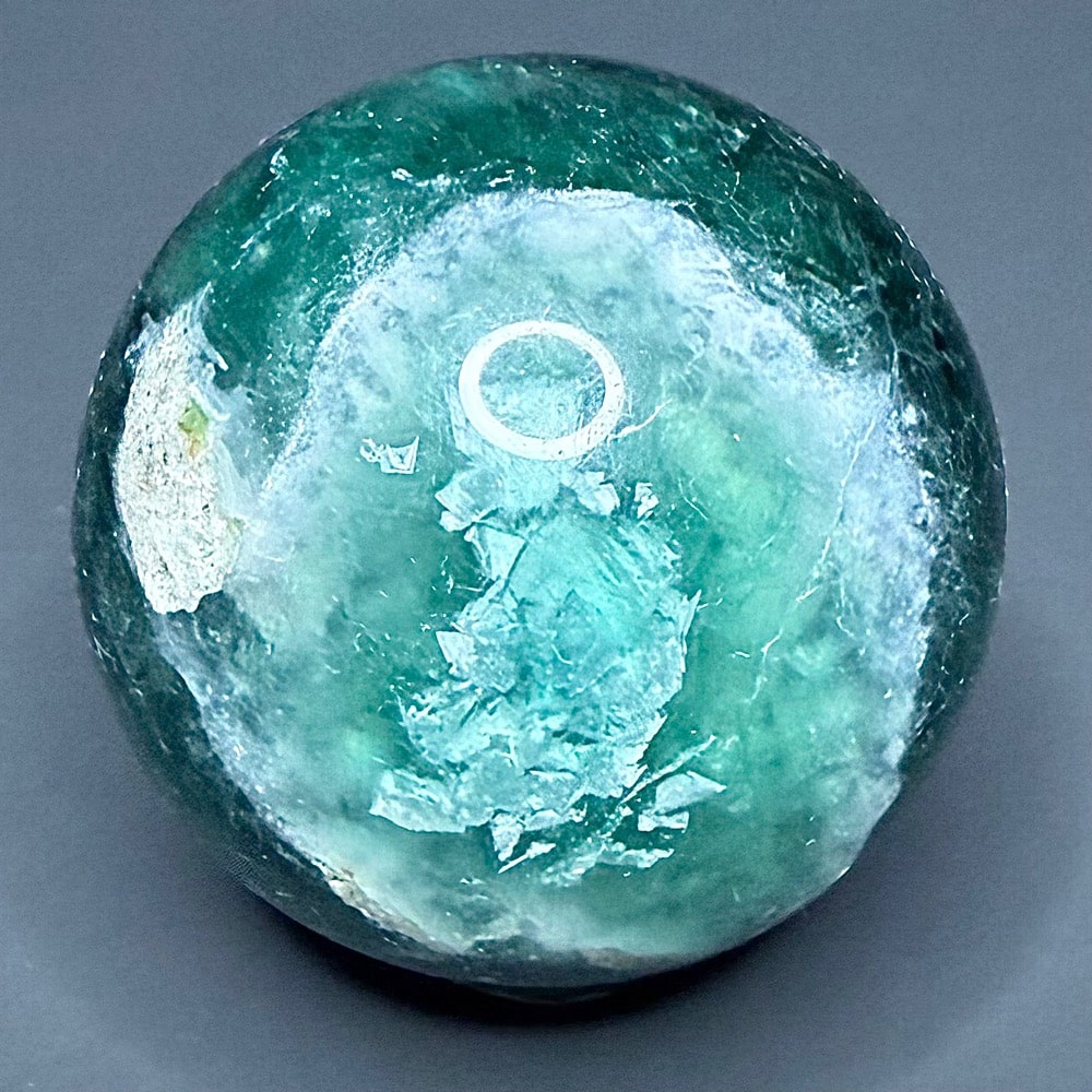 Appearance: It has great colors, exceptional clarity, wonderful inclusions and “rainbow” reflections. Turns a bluish purple under a UV light. UV fluorescent (shot with uvBeast 365nm(nanometer) Black Light UV flashlight). Translucent. There is a fill area, but it does not affect the stability of the sphere and has been reflected in the reduced price.