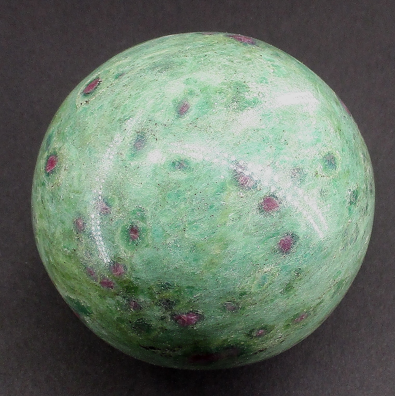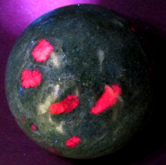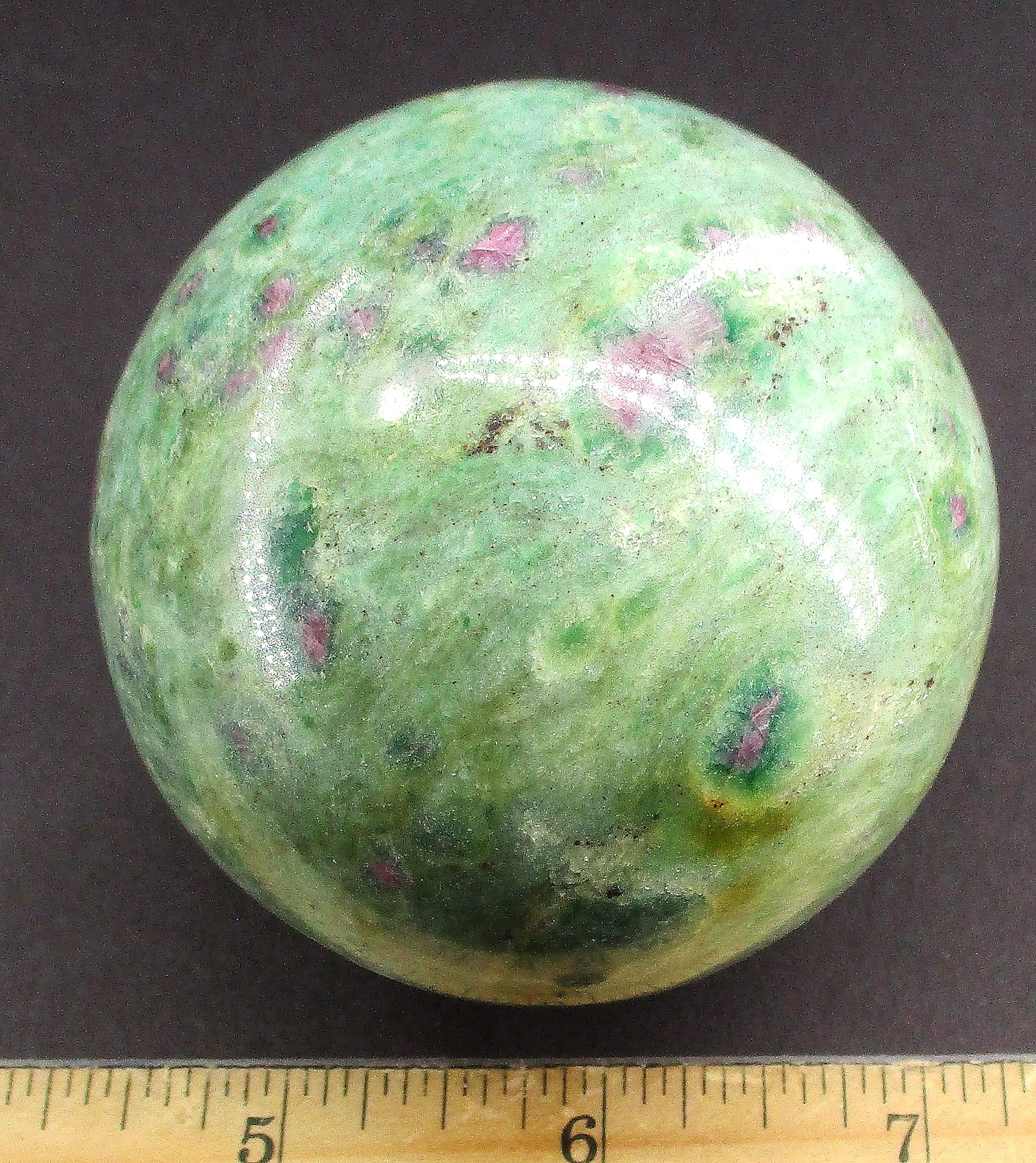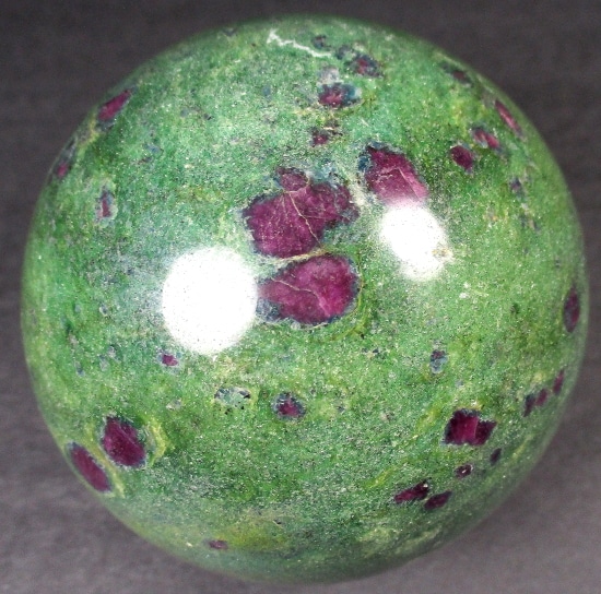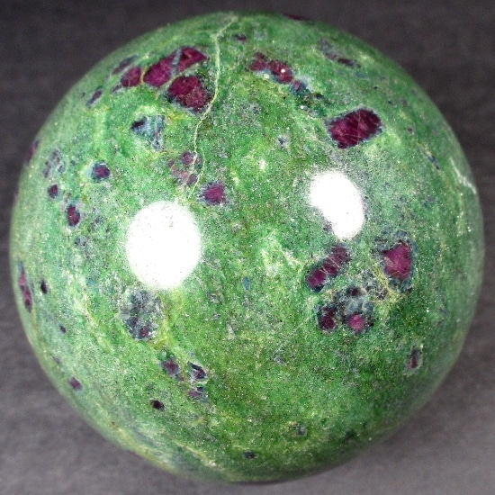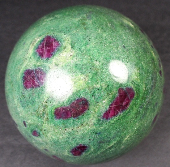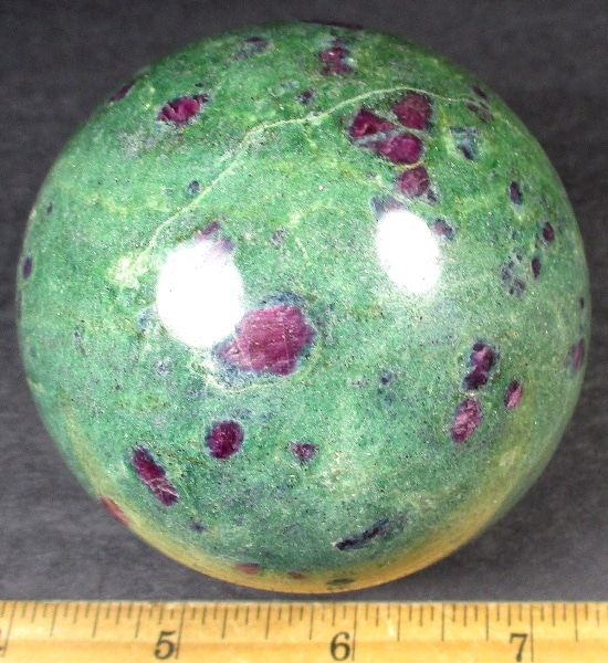 Fuchsite is a green variety of Muscovite Mica. It differs from most other Muscovite by having a variable amount of trivalent Chromium substituting for Aluminum within the mineral. Chromium is the source of Fuchsite’s green color. It sometimes has Ruby Crystals which are completely opaque and unsuitable as gemstones, but are well colored and contrast strikingly against the green matrix of the Fuchsite.