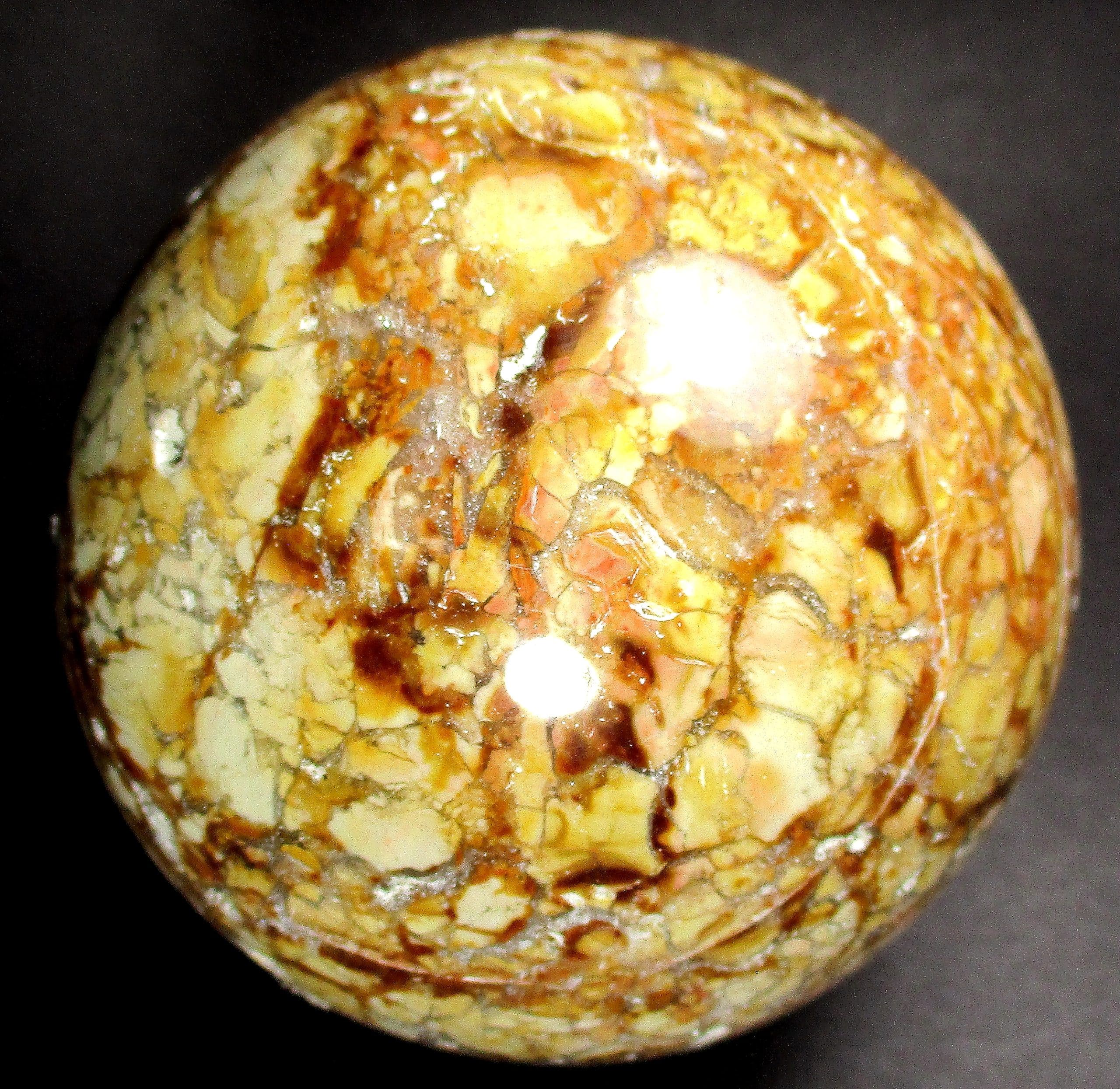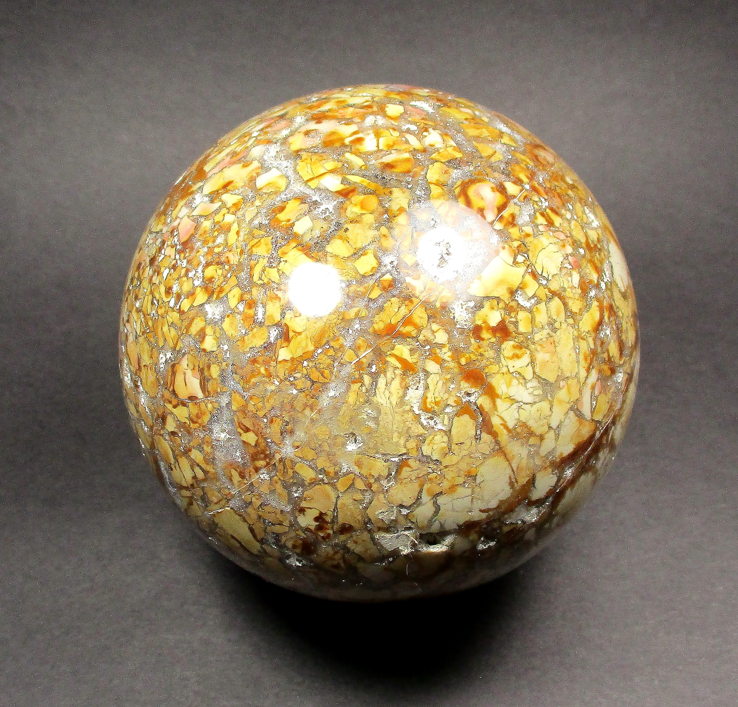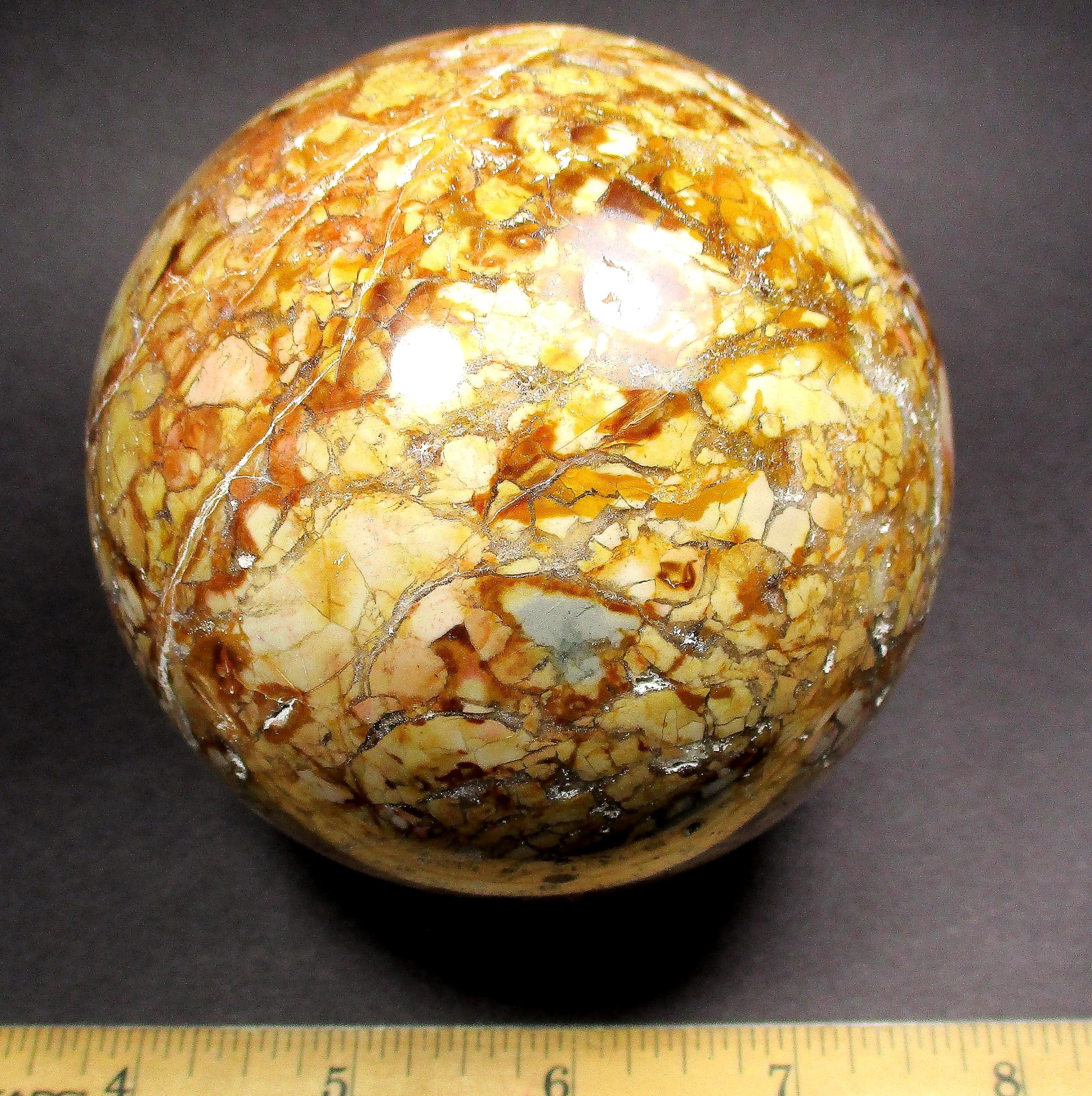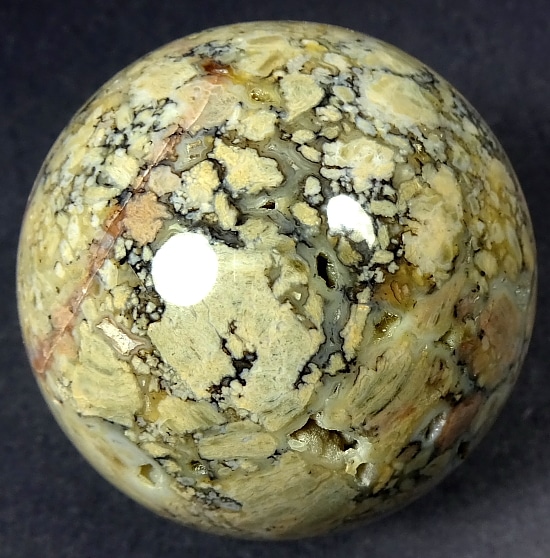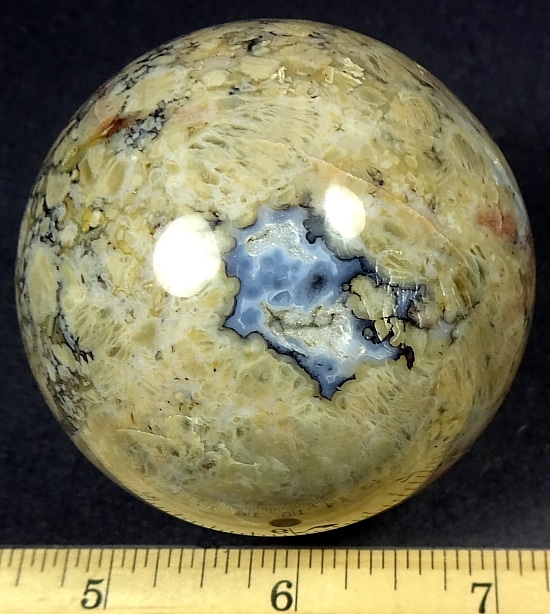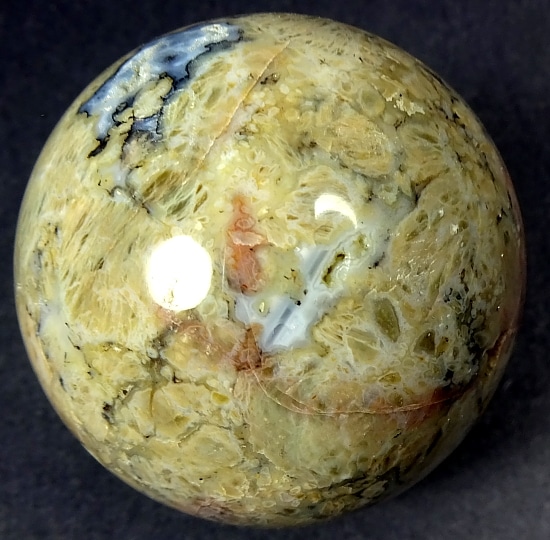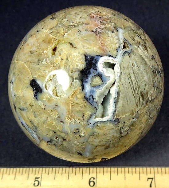 Appearance: This beautiful sphere has great mix of contrasting colors, crystal areas, neat small cavities all in a mesmerizing design!